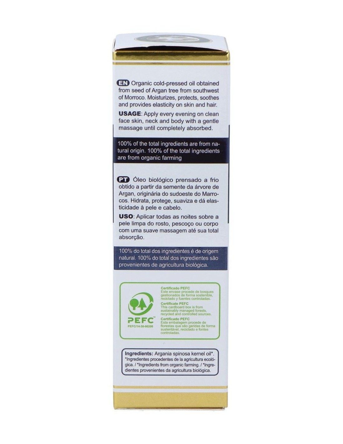 El Aceite de Argán es el más rico y preciado aceite para un cuidado intensivo y sus beneficios sobre la piel han sido confirmados científicamente. Por su alto contenido en ácidos grasos insaturados, el aceite de argán presenta propiedades regeneradoras, nutritivas, suavizantes y protectoras. Devuelve a la piel su brillo y suavidad naturales y favorece su elasticidad evitando la aparición de arrugas ya que neutraliza los radicales libres, previniendo el envejecimiento prematuro. Composición:Aceite de argán puro de cultivo ecólogico ecológico. Modo de empleo:Aplicar cada noche sobre el rostro, cuello o cuerpo la cantidad necesaria. Para fortalecer las uñas, se mezcla con jugo de limón y se deja aplicado toda la noche. Presentación:Spray de 50 ml.