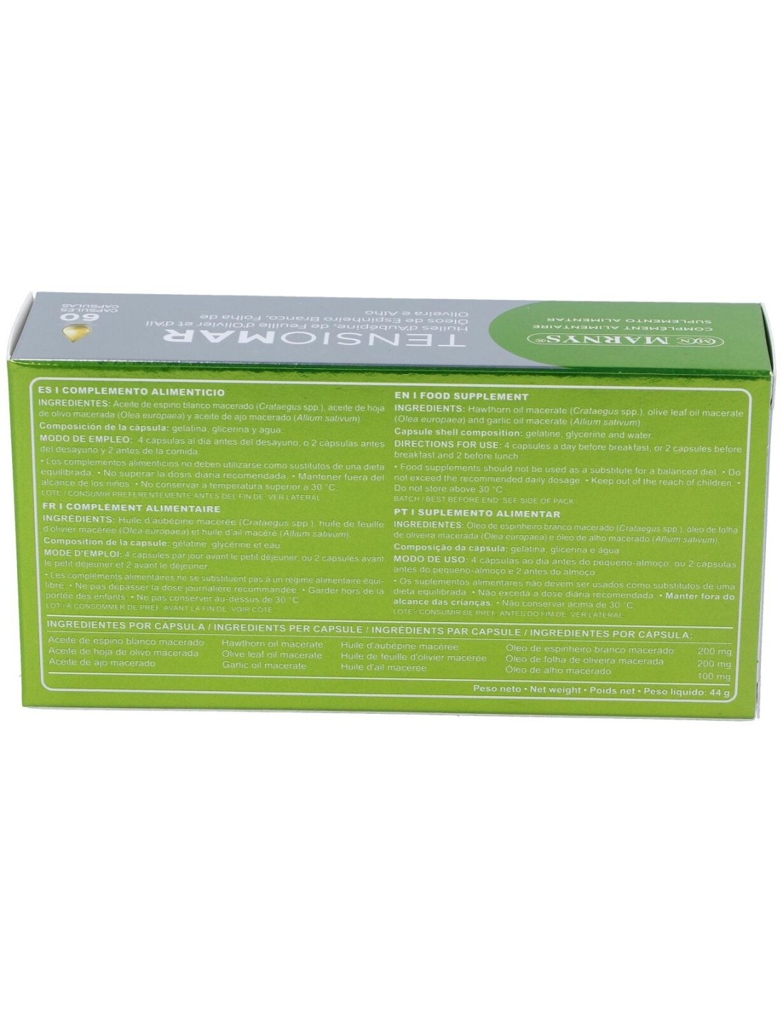 MARNYSComplemento alimenticio de cápsulas blandas con aceites y soluciones oleosas de plantas tradicionales, a base de Espino Blanco, Olivo y Ajo, los cuales contribuyen a mantener la tensión en niveles normales. Complemento alimenticio de cápsulas blandas con aceites y soluciones oleosas de plantas tradicionales, a base de Espino Blanco, Olivo y Ajo, los cuales contribuyen a mantener la tensión en niveles normales.
