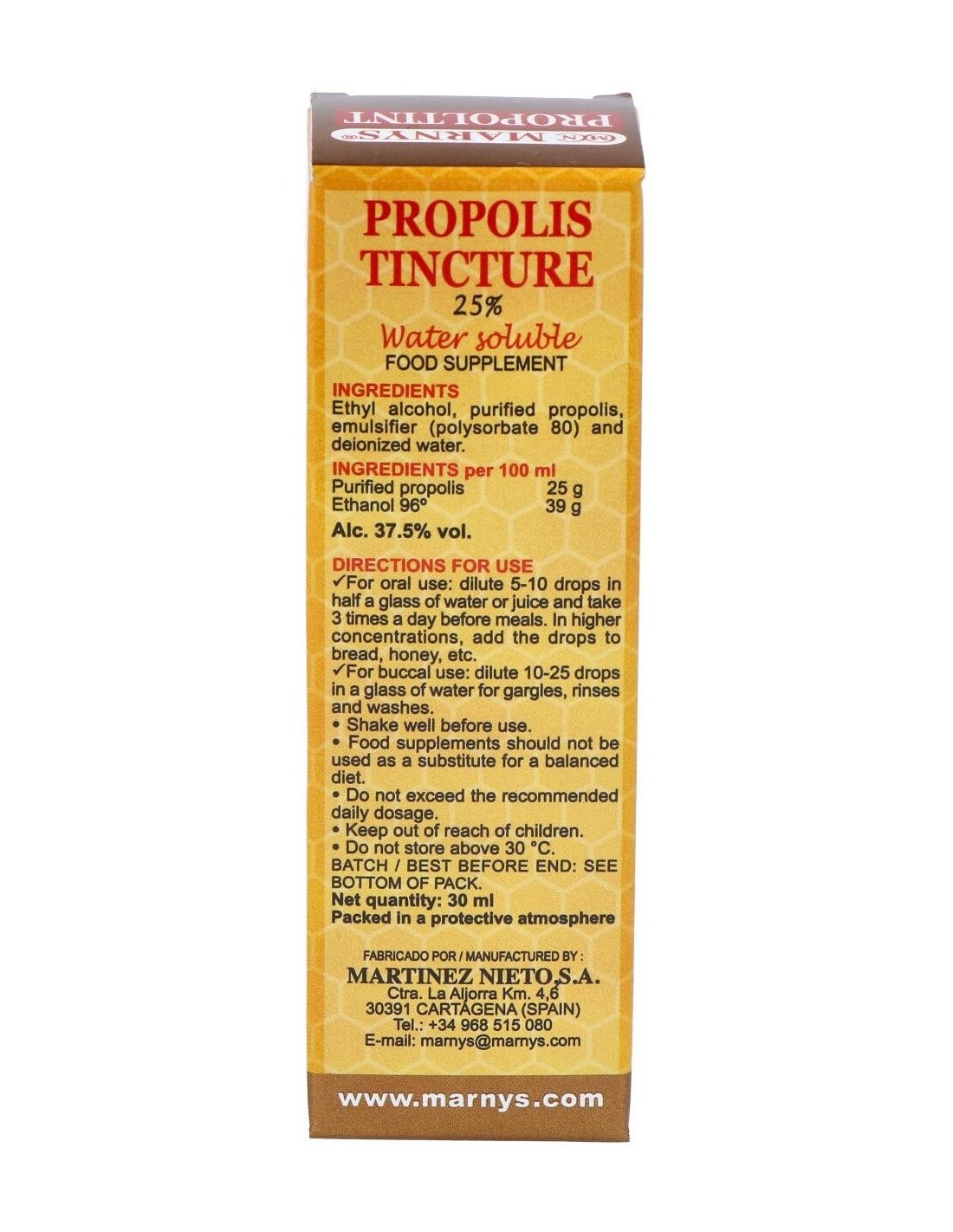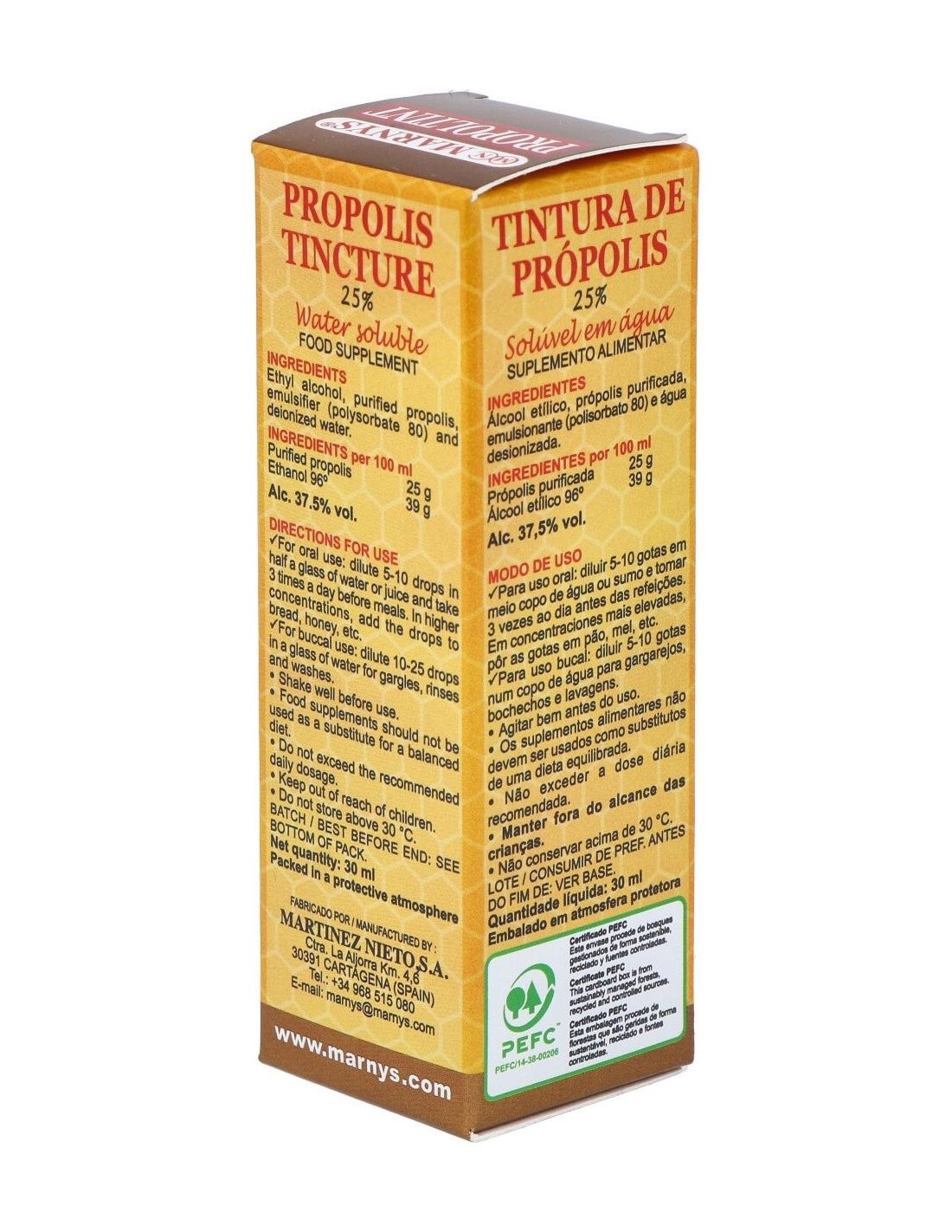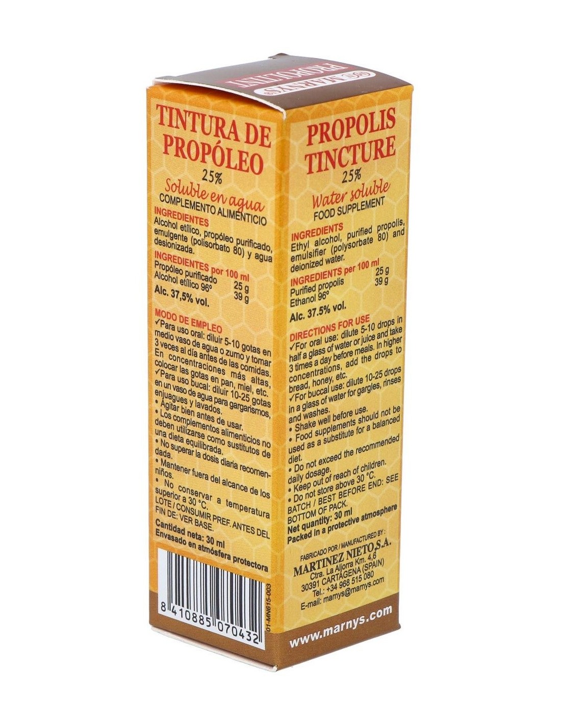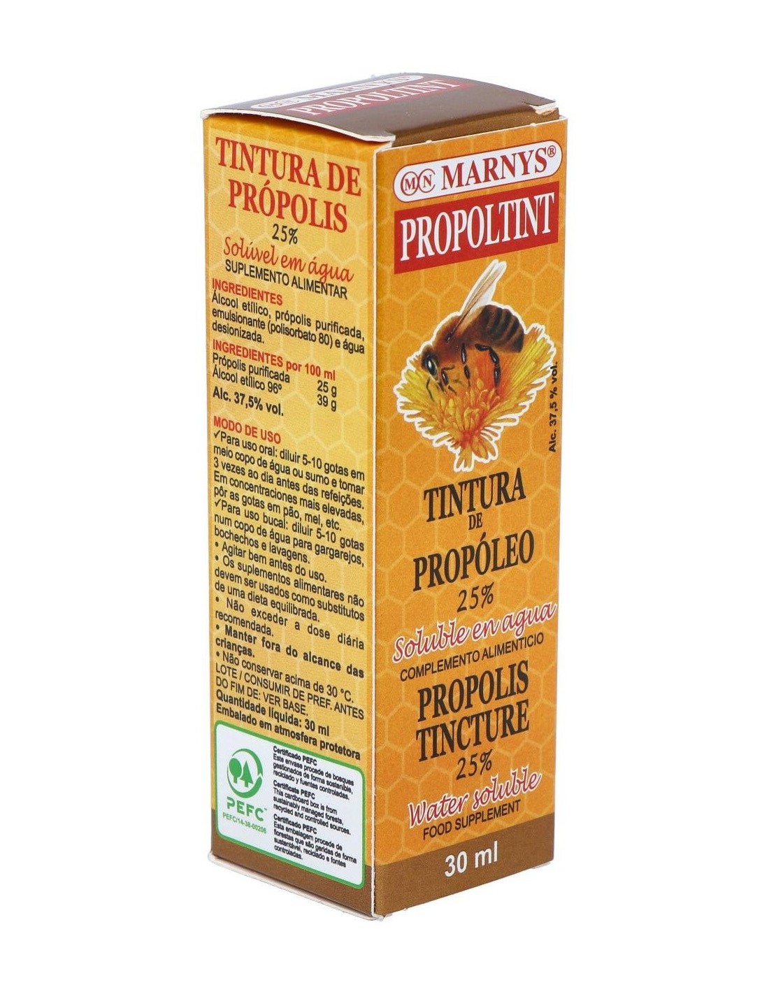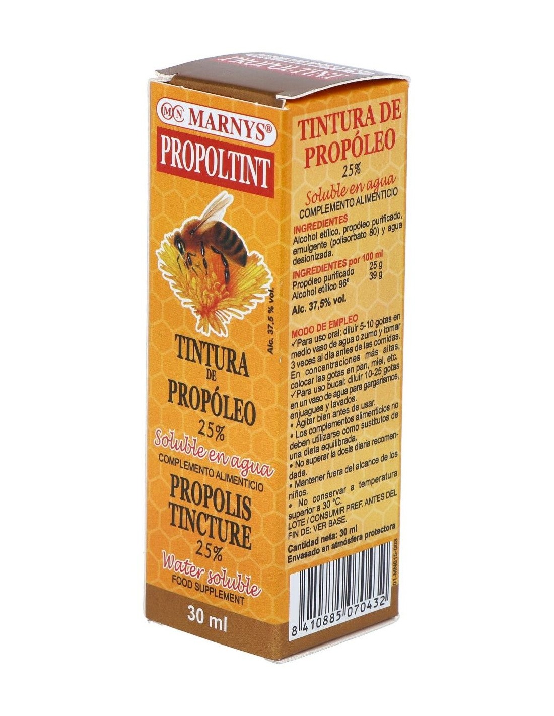 Propoltint (Ext.Propolis Al 25%) 30Ml. de Marnys es un extracto concentrado de propóleo diseñado para quienes buscan un complemento natural que aporte propiedades derivadas de esta sustancia. Es adecuado para personas interesadas en incorporar ingredientes de origen natural en su rutina diaria.