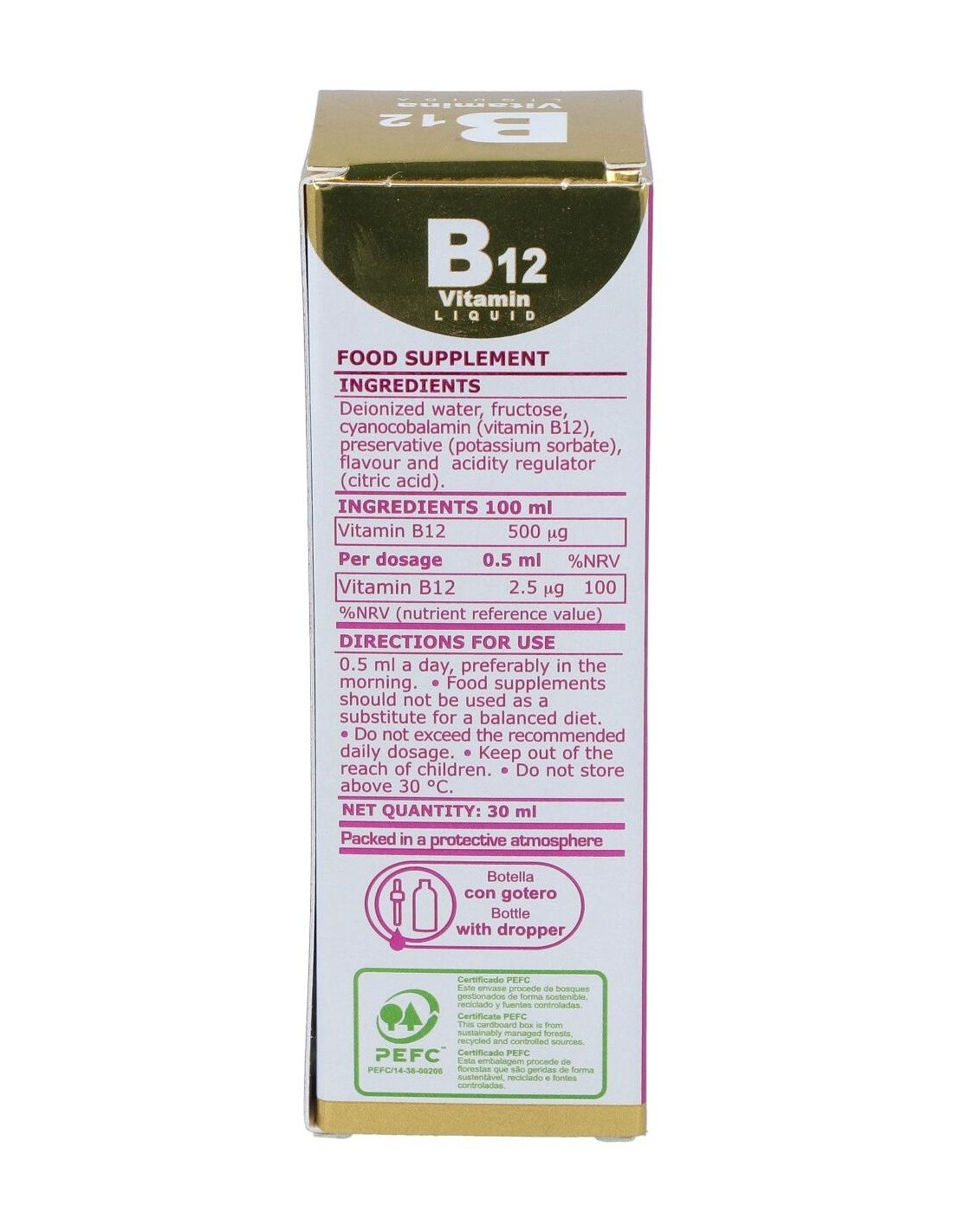 Este producto es un complemento alimenticio de agradable sabor frutal cuya fórmula en una base de glicerina vegetal permite su administración vía sublingual. La Vitamina B12, implicada en la división celular, contribuye a mantener la función normal del sistema inmune; contribuye a disminuir la fatiga y cansancio y a la formación normal de los glóbulos rojos; la función normal del sistema nervioso, el metabolismo energético normal, el metabolismo normal de la homocisteina y a mantener las funciones fisiológicas normales. Composición por 0,5 ml:2,5 mcg de vitamina B12 (cianocobalamina).Ingredientes:Agua desionizada, fructosa, Vitamina B12 (cianocobalamina), sorbato potásico, aroma y ácido cítrico. Modo de empleo: