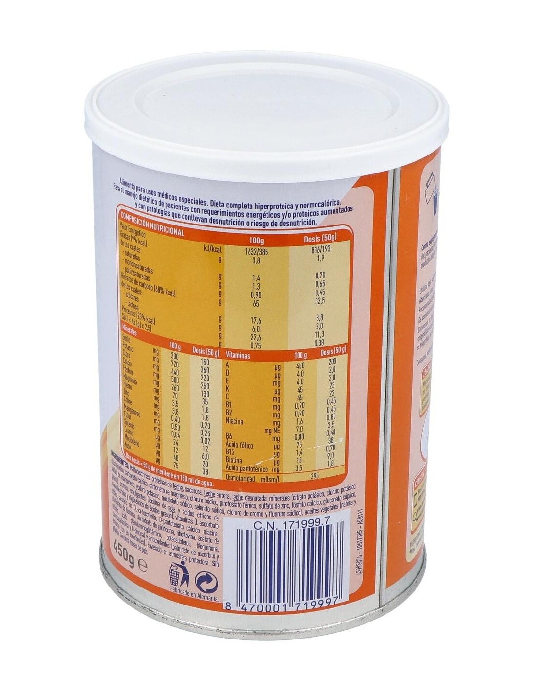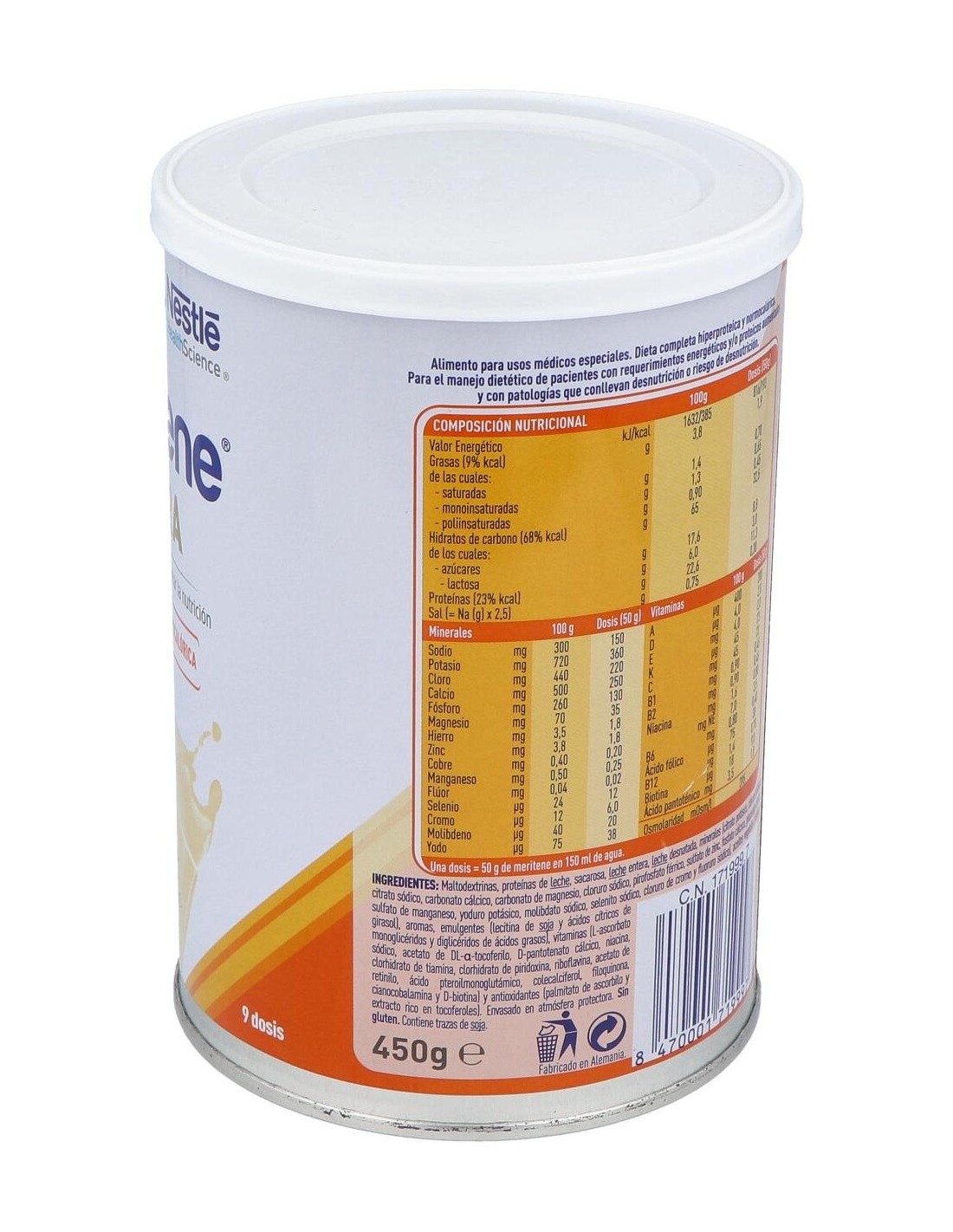 Leche desnatada, minerales (carbonato de magnesio, gluconato de zinc, fosfato férrico y selenito sódico), aceite MCT, vitaminas [ácido ascórbico (C), nicotinamida (B3), acetato de DL alfa tocoferilo (E), pantotenato cálcico (B5): clorhidrato de piridoxina (B6), clorhidrato de tiamina (B1) acetato de retinol (A), ácido pteroilmonoglutámico (B9), riboflavina (B2), filoquinona (K), colecalciferol (D) y cianocobalamina (B12)], aroma, edulcorante (sacarina sódica) y colorante (beta caroteno).