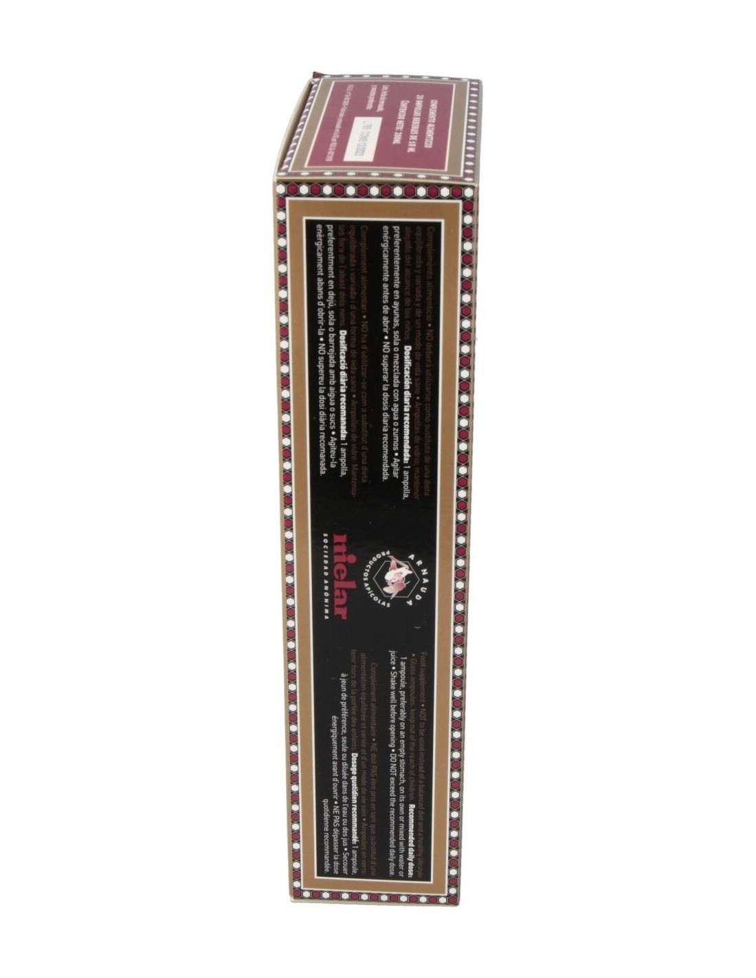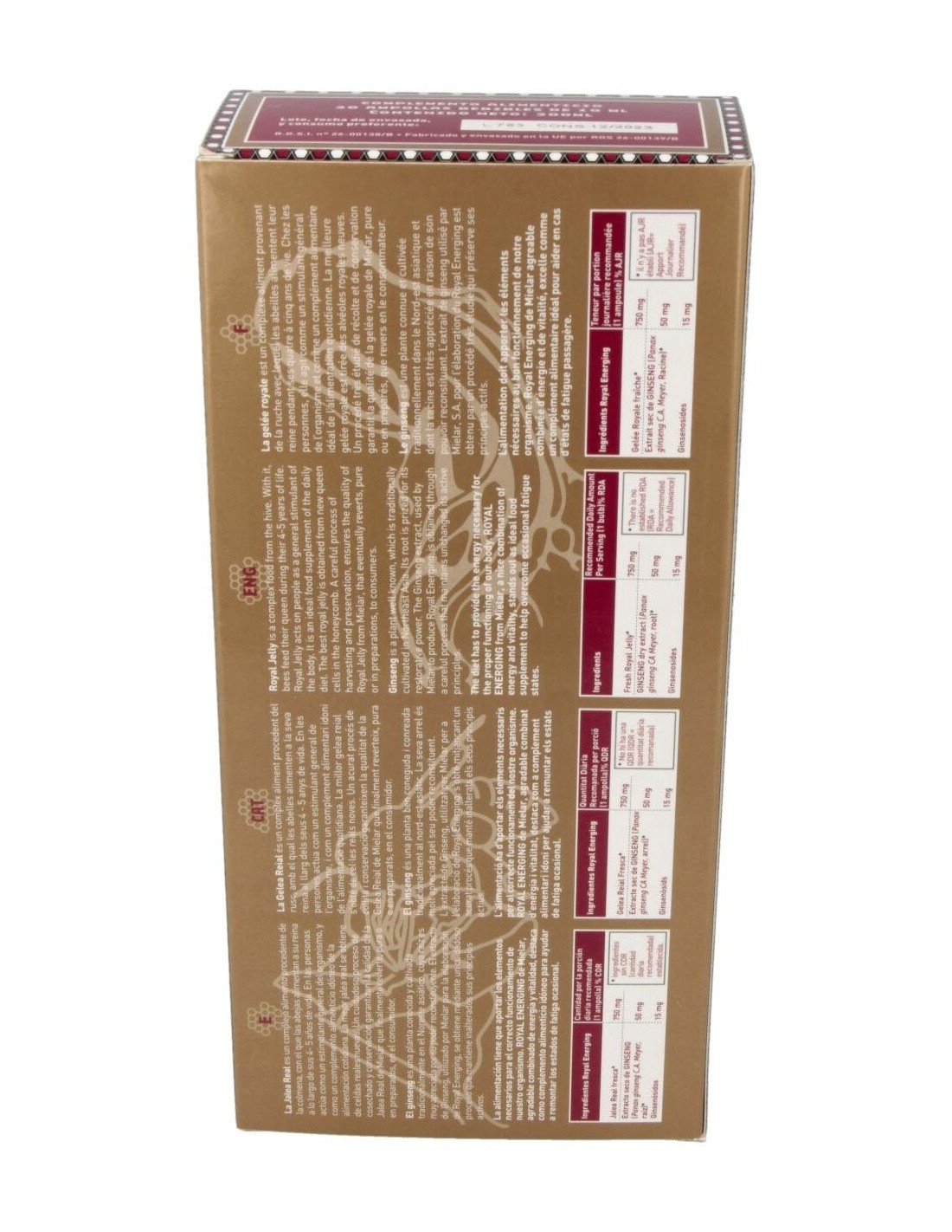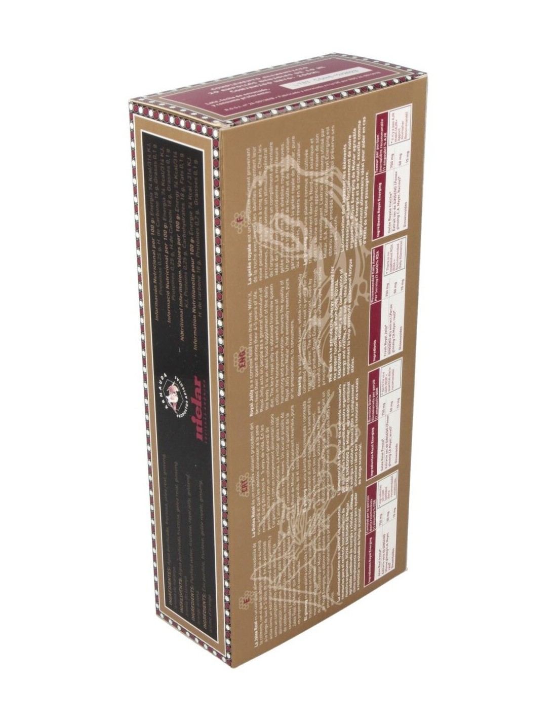 MIELARCombina las características de Jalea Real y Ginseng. Es el complemento dietético ideal, un agradable y potente combinado de energía y vitalidad que favorecerá una vida más plena e intensa.