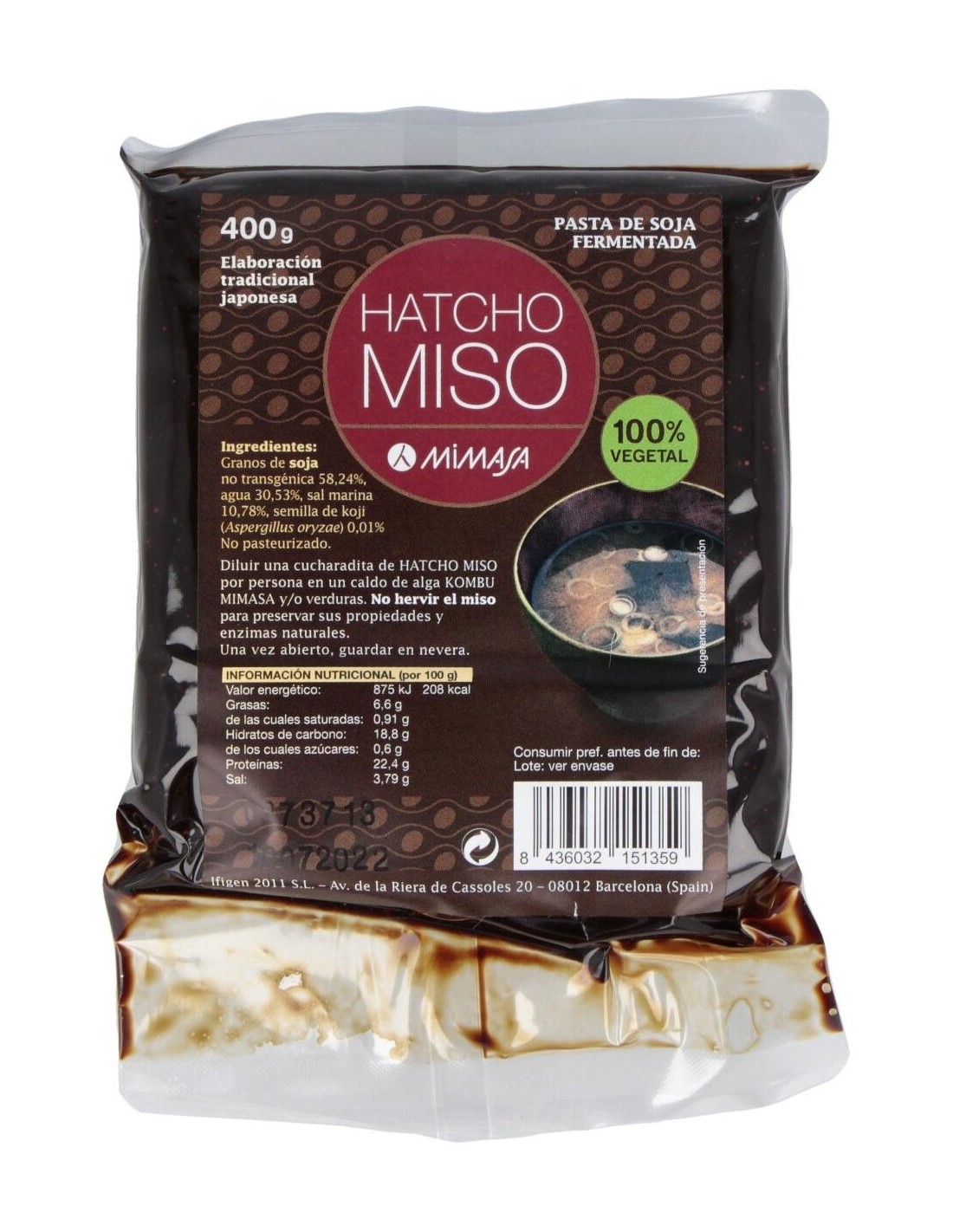 La composición del Hatcho Miso incluye soja fermentada y sal, siguiendo métodos tradicionales que aseguran un producto con características organolépticas consistentes. Su diseño en envase facilita el almacenamiento y conservación, manteniendo la calidad durante su uso habitual.