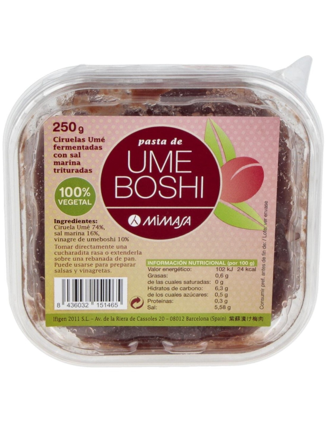 MIMASALa Umeboshi Pasta 250Gr. de Mimasa es una pasta de ciruela encurtida dirigida a consumidores interesados en sabores tradicionales japoneses. Ofrece un sabor ácido y salado característico, elaborado con ingredientes naturales.