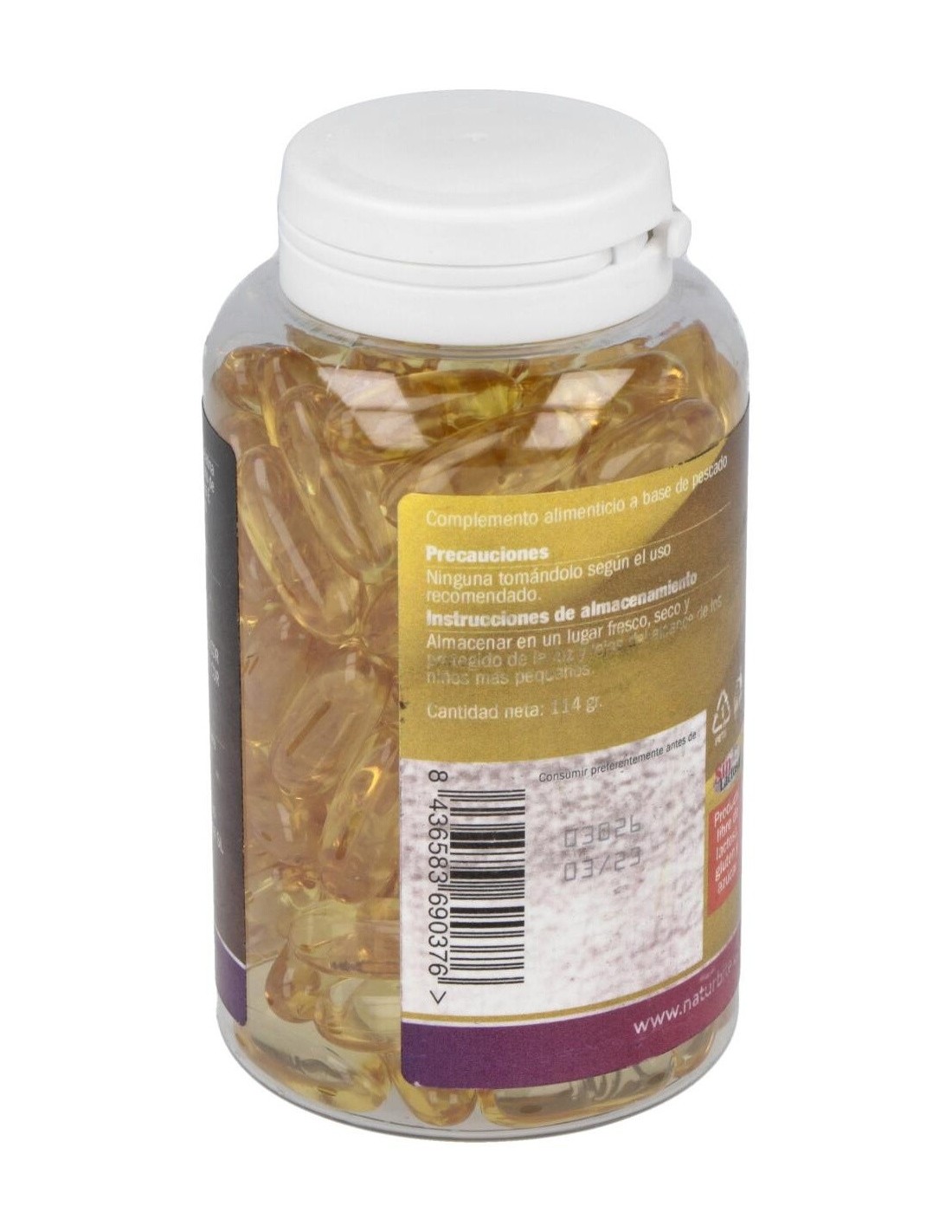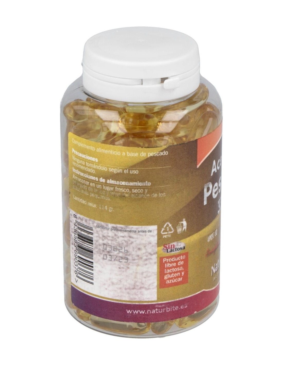 NATURBITECápsulas de aceite de pescado obtenido de atún, salmón, fletán, caballa y bacalao procedentes del Atlántico Sur, rico en omega 3, grasa necesaria para el fortalecimiento de las neuronas y demás funciones del organismo. Además favorecen la salud cardiovascular, reduciendo el riesgo de sufrir afecciones relacionadas con el corazón.