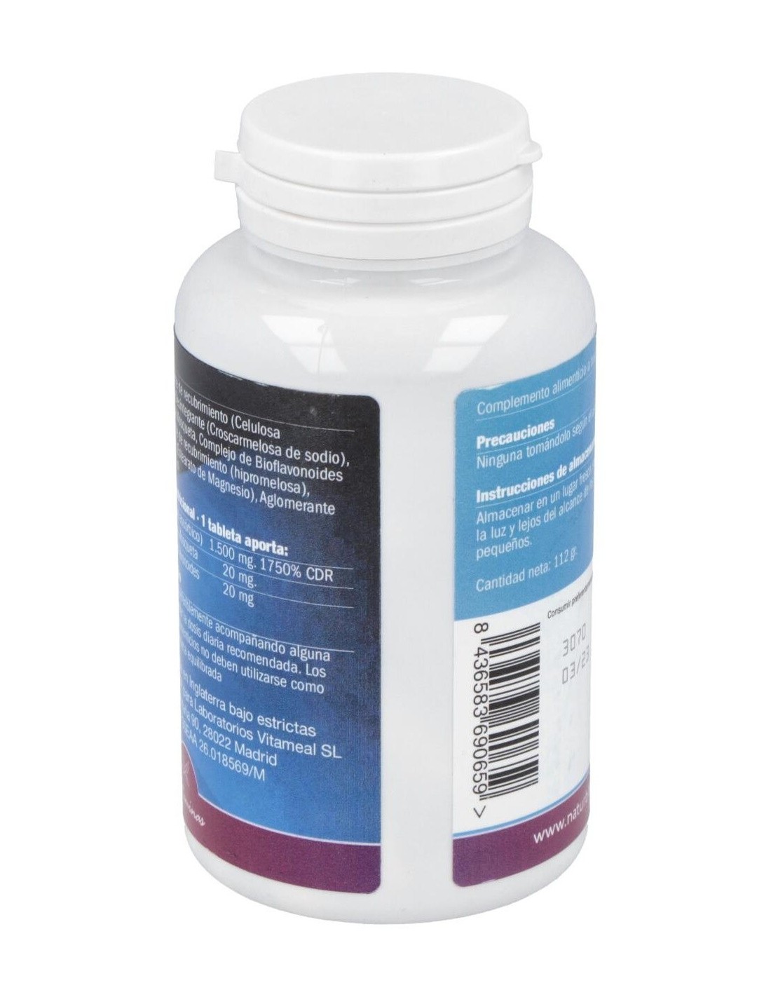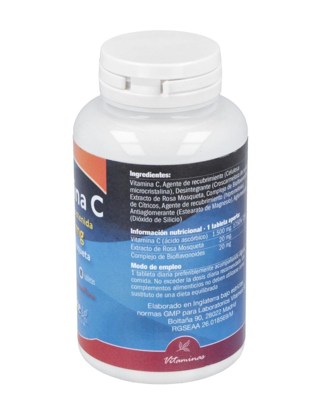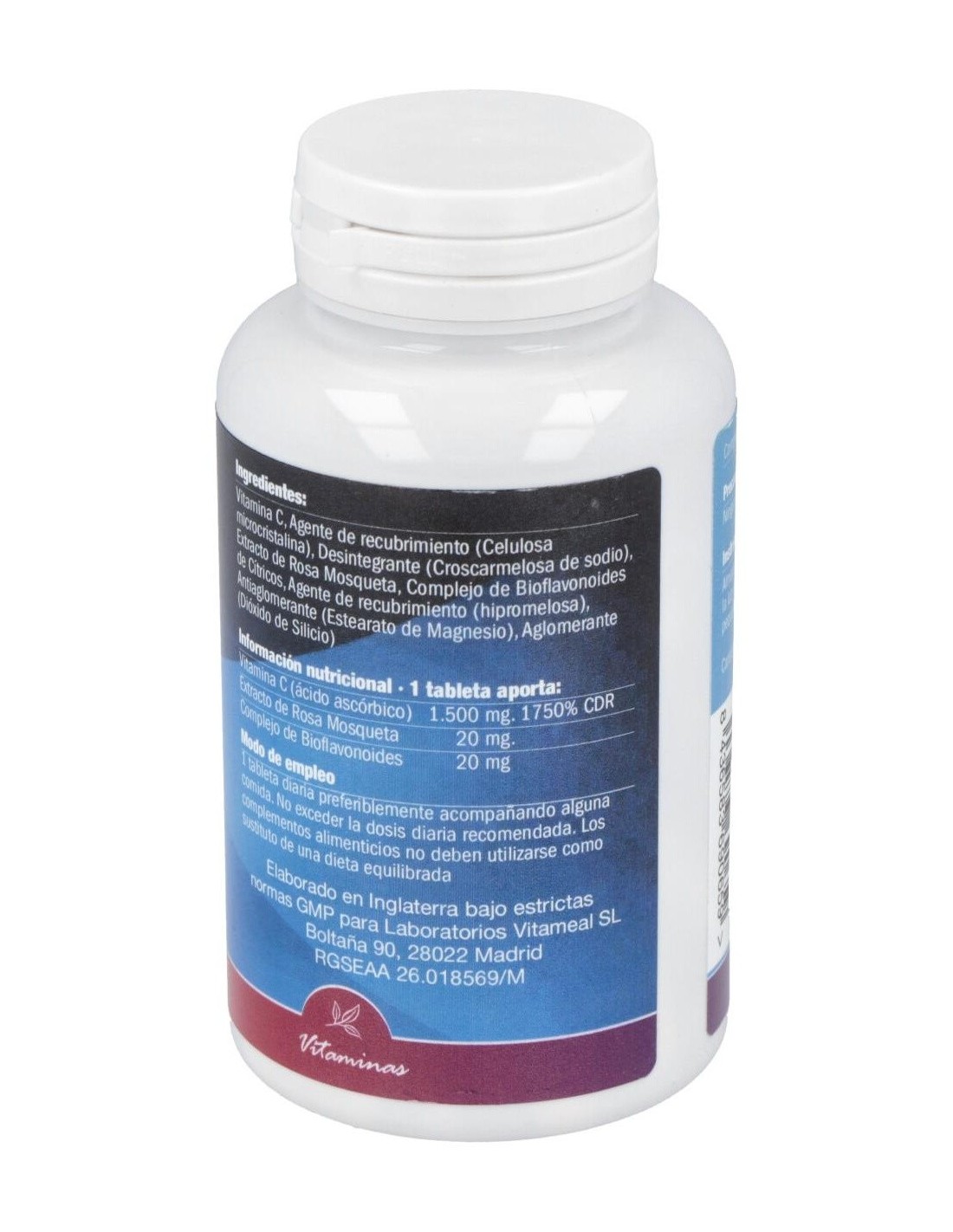 Vitamina C (1500 mg), Complejo de bioflavonoides (25 mg), Extracto de rosa mosqueta (20 mg), Dióxido de Silicio, Estearato de magnesio, Celulosa microcristalina, Croscarmelosa de sodio.