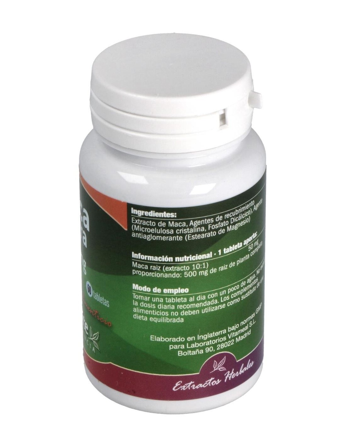 Maca (extracto 10:1) 50 mg proporcionando 500 mg. Celulosa, Fosfato Dicálcico, Estearato de Magnesio.