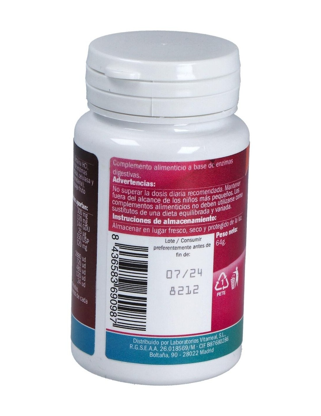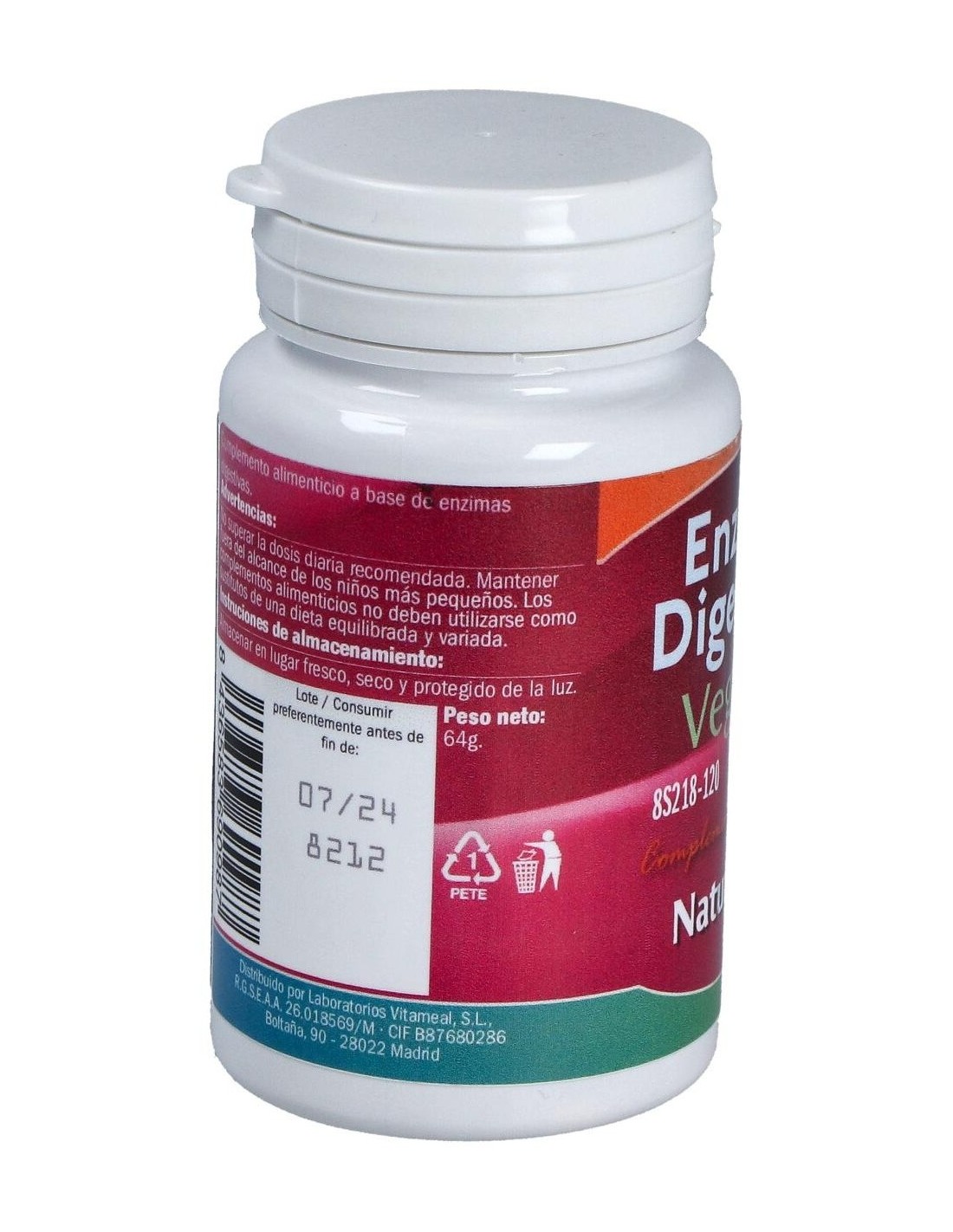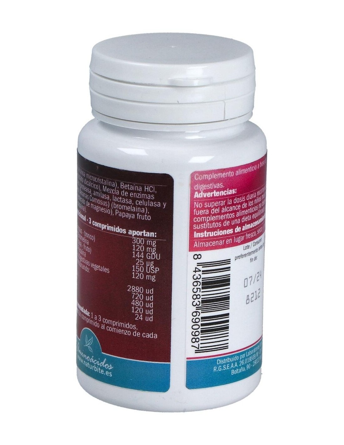 Celulosa microcristalina, Betaina HCI, fosfato dicálcico, mezcla de enzimas digestivas vegetales (proteasa, amilasa, lactasa, celulasa y lipasa), piña tronco, bromelaina, estearato de magnesio, papaya fruto, papaina.