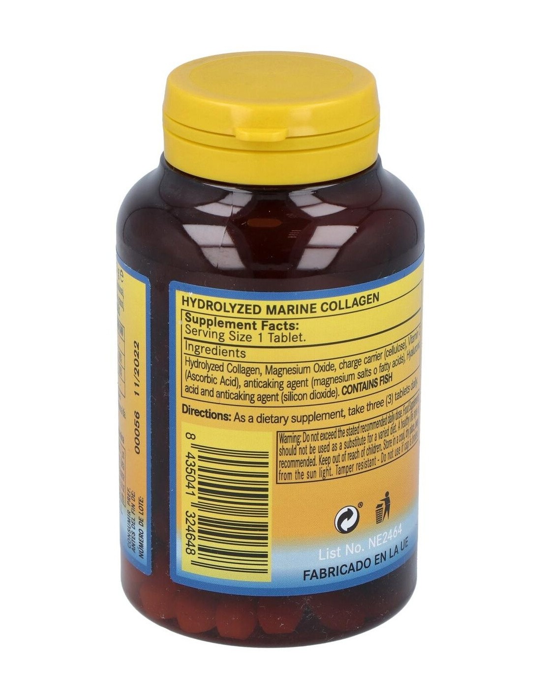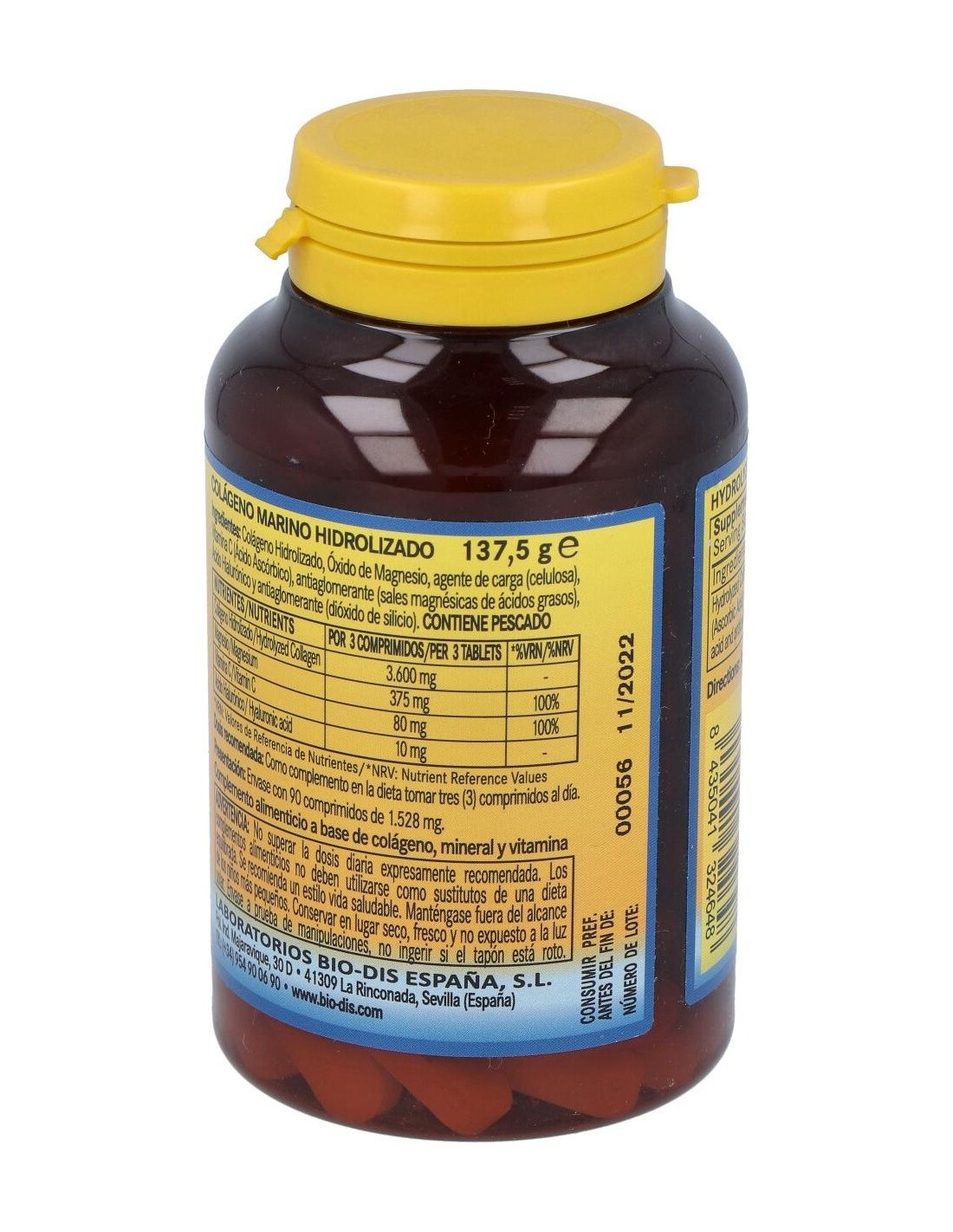 Colágeno Hidrolizado Marino, Óxido de Magnesio, Vitamina C (Ácido L-ascórbico) y Ácido Hialurónico.