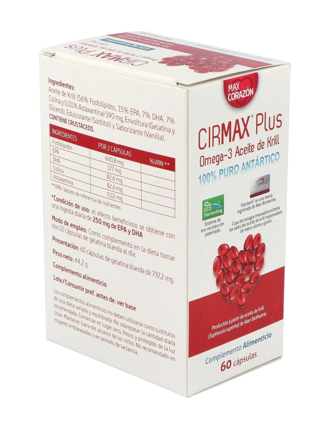 Complemento alimenticio elaborado con Aceite de Krill (EPA,DHA,Colina y 0,01% Astaxantina), Envoltura (Gelatina y Glicerol), Edulcorante (Sorbitol) y Saborizante (Vanilla). La rica composición del complemento contribuye a la salud cardiovascular del organismo. Este producto es un complemento alimenticio. Mantener fuera del alcance de los niños más pequeños. No superar la dosis diaria expresamente recomendada. Almacenar en un lugar fresco y seco. Los complementos alimenticios no son sustitutos de una dieta equilibrada.