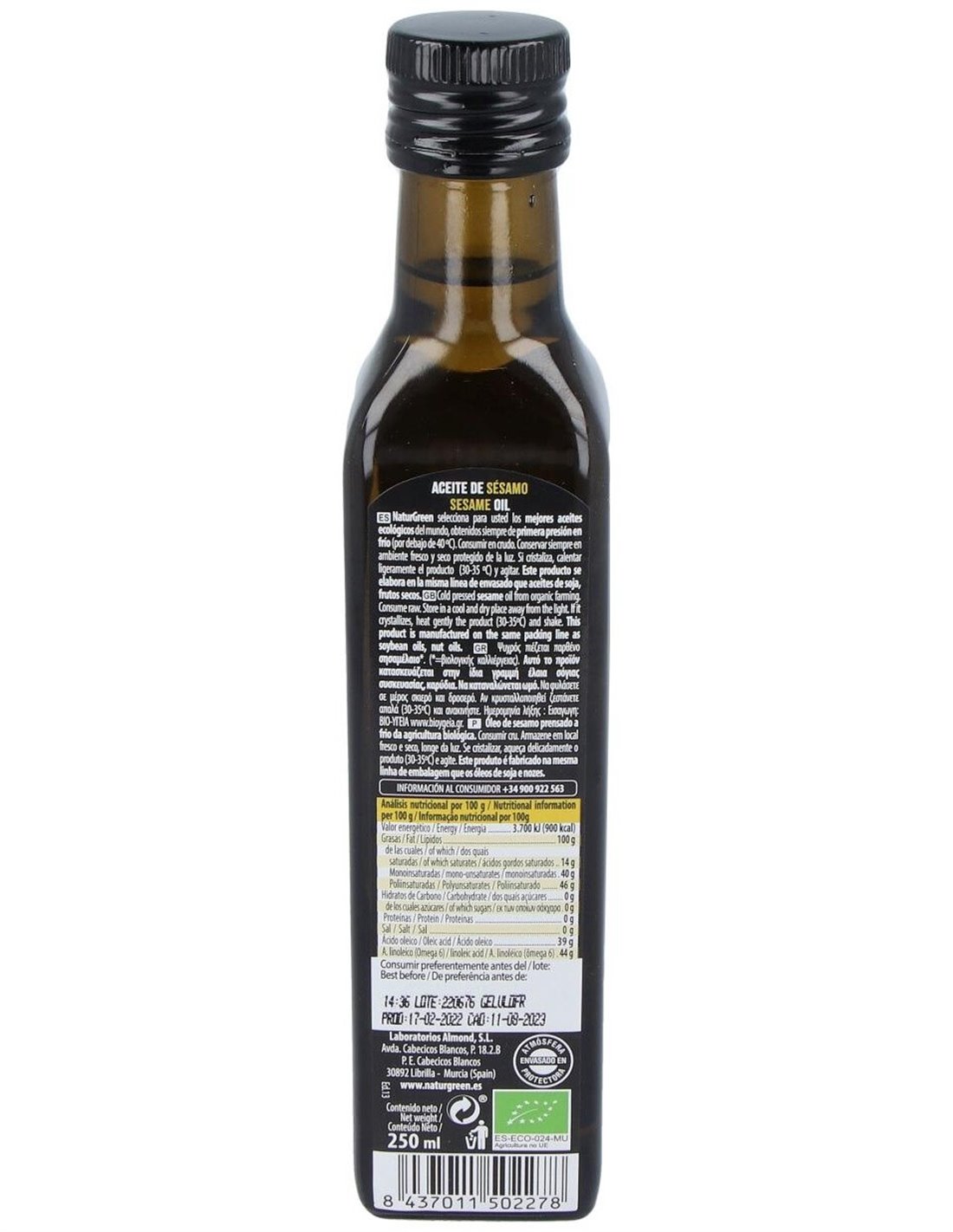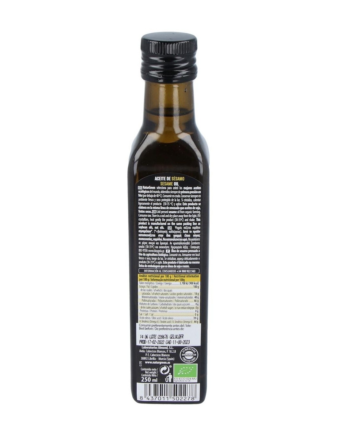 NATURGREENIngredientes:100% Aceite de semillas de sésamo ecológico.Valor nutricional por 100 gramos: