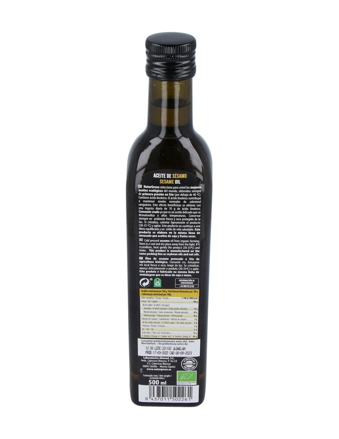NATURGREENEl Aceite de Sésamo de Naturgreen es un aceite vegetal para consumidores que buscan ingredientes naturales. Aporta un sabor suave y nutritivo, obtenido mediante prensado en frío para conservar sus propiedades.