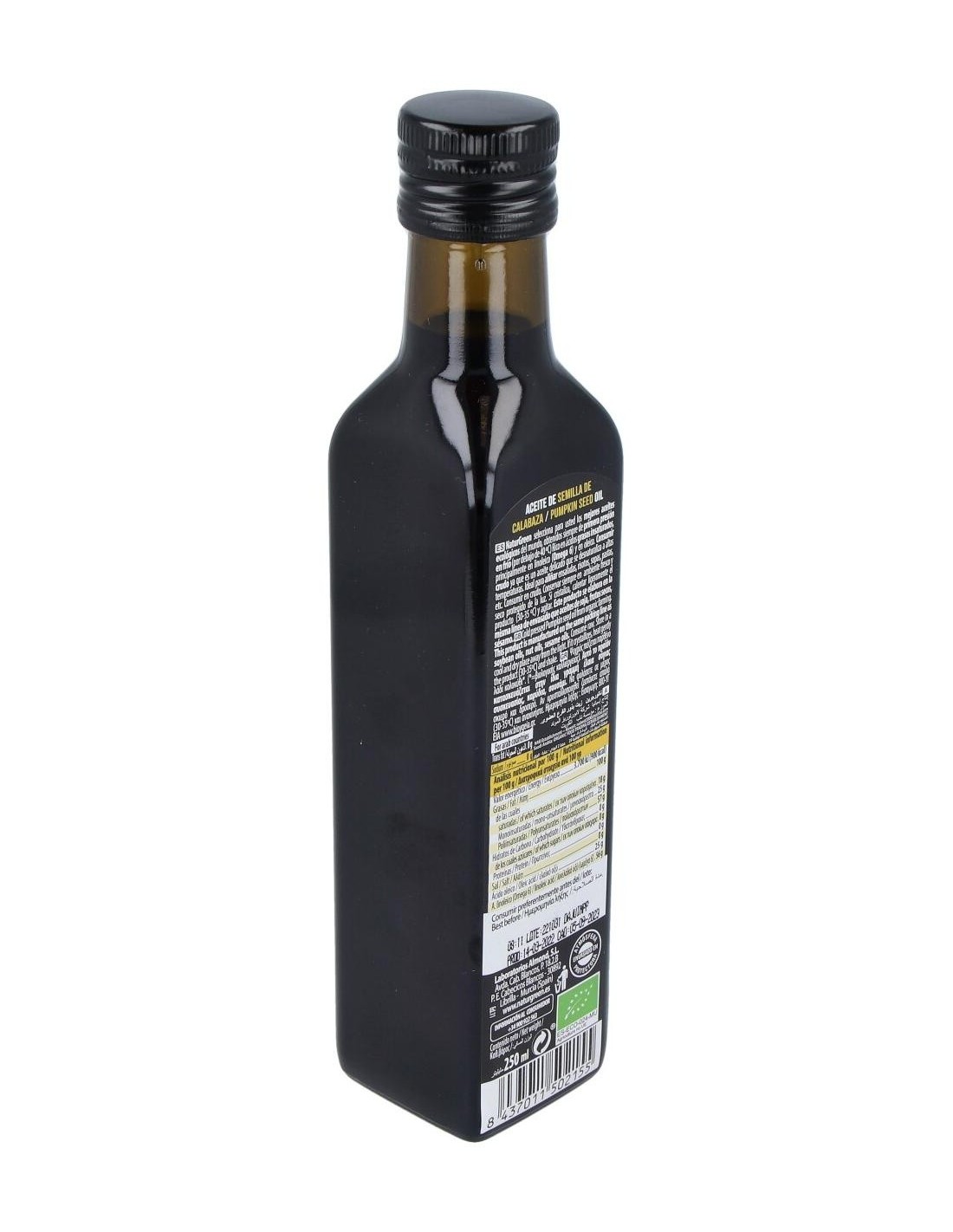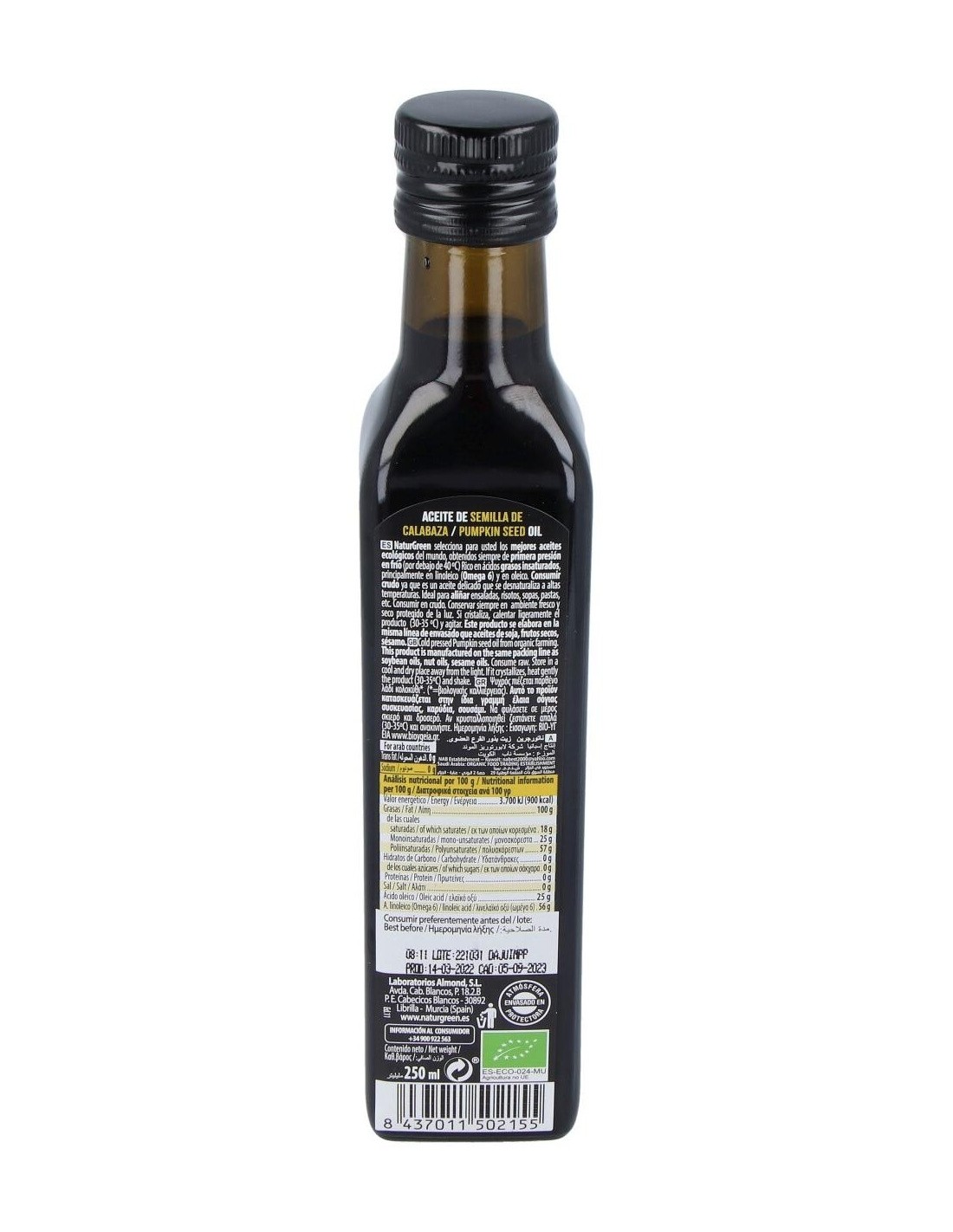 NATURGREENIngredientes:100% Aceite de semillas de calabaza ecológico.Valor nutricional por 100 gramos: