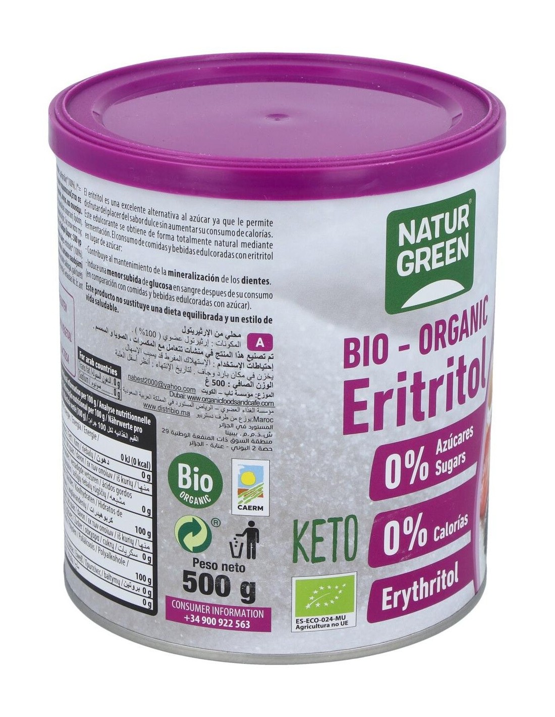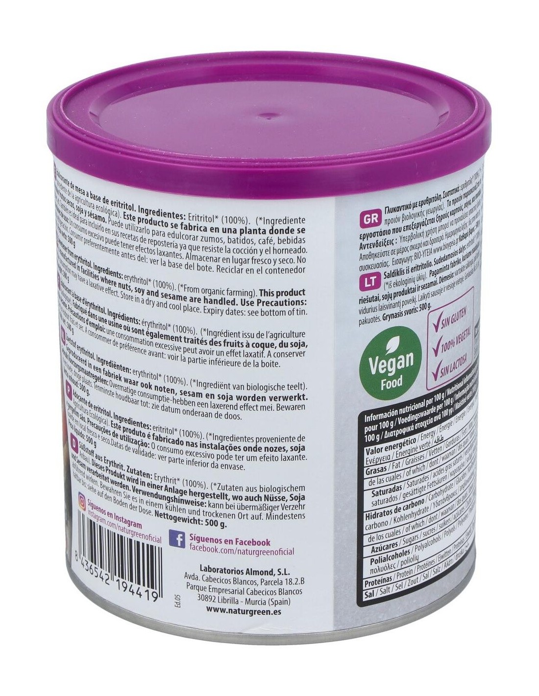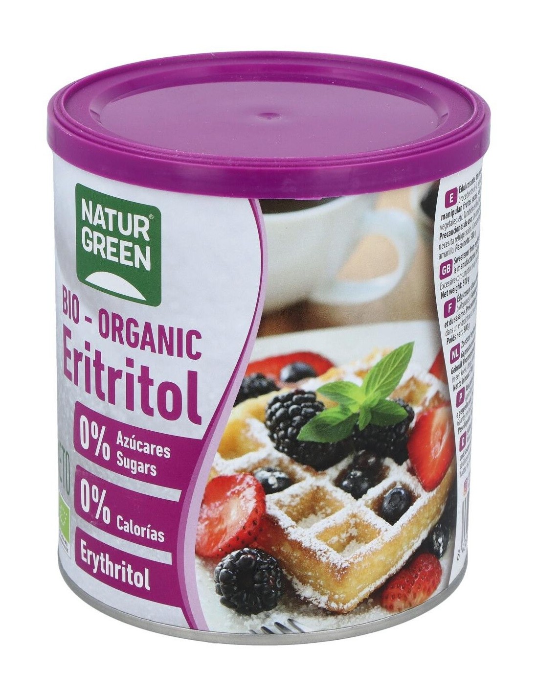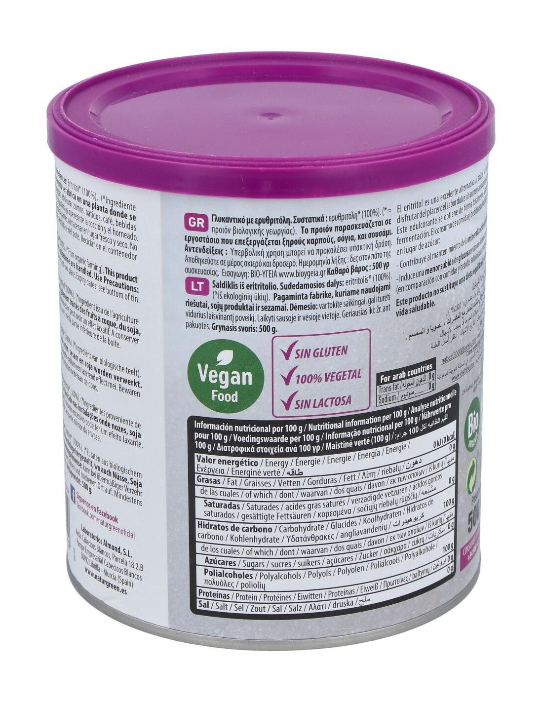 NATURGREENIngredientes:Eritritol*(100%). (*) Ingredientes procedentes de la agricultura ecológica.Valor nutricional por 100 gramos: