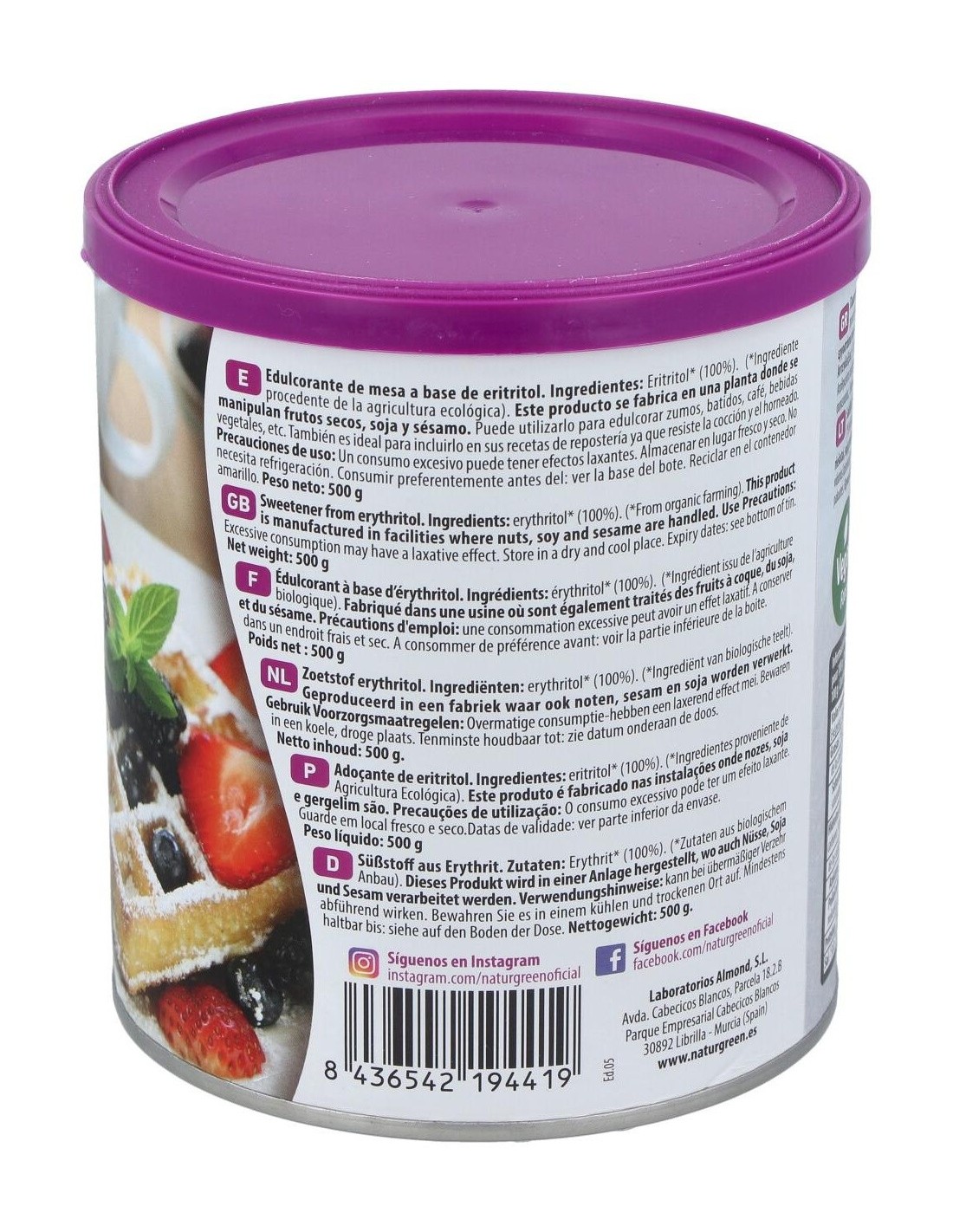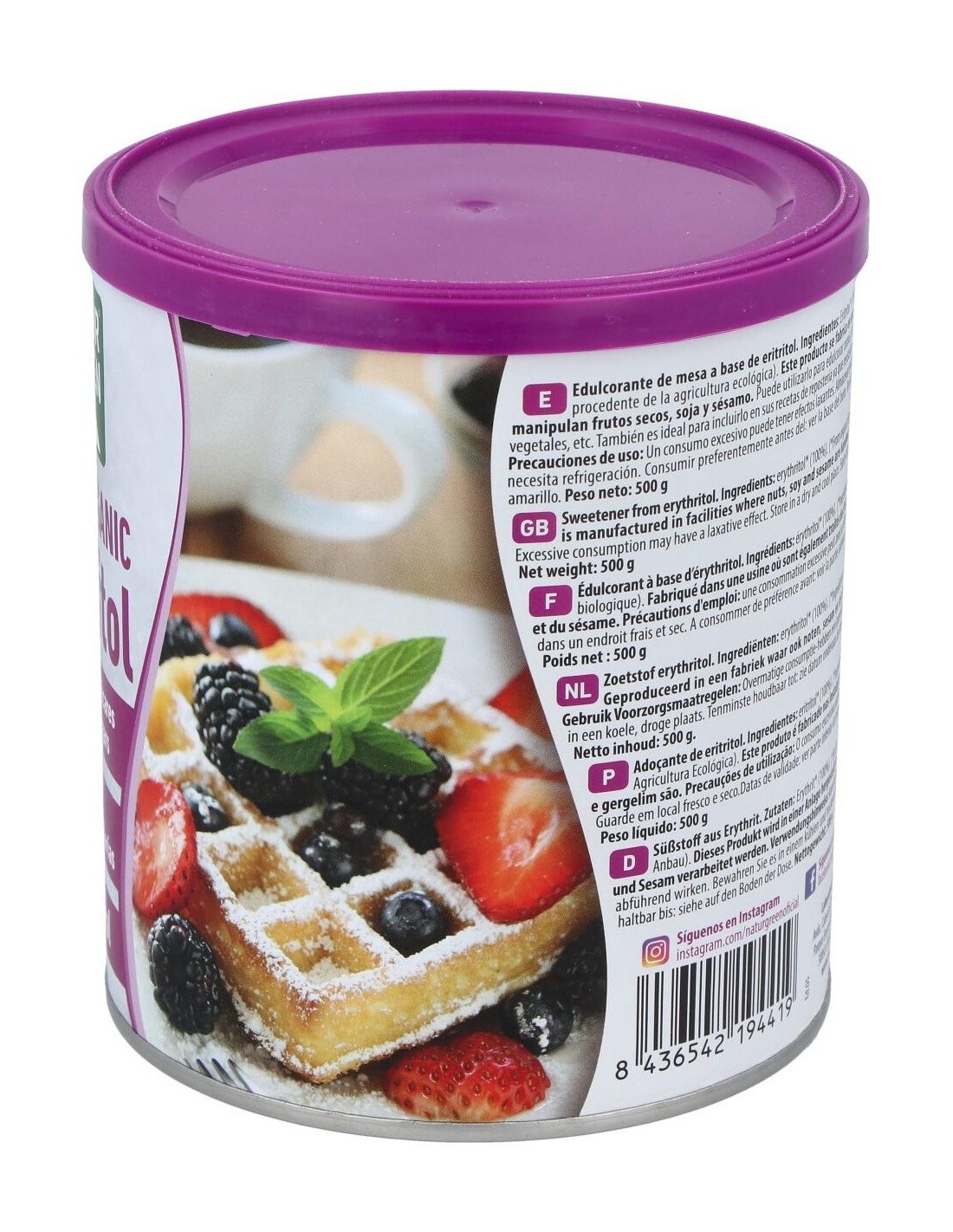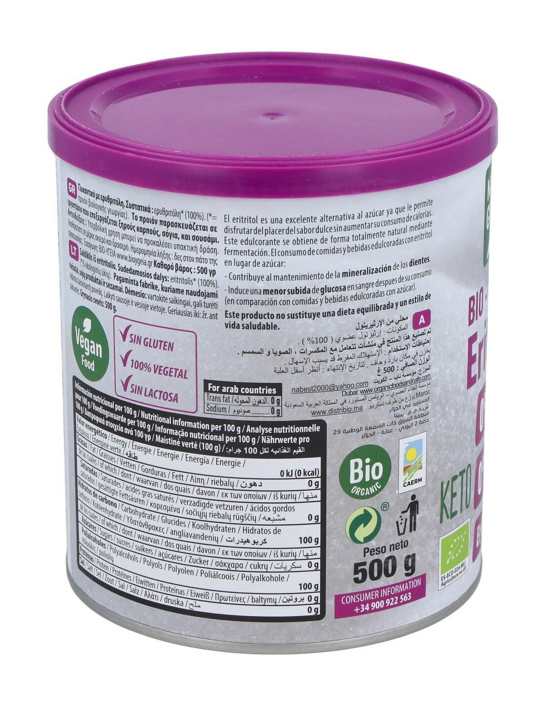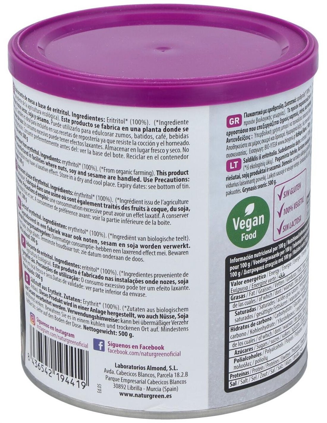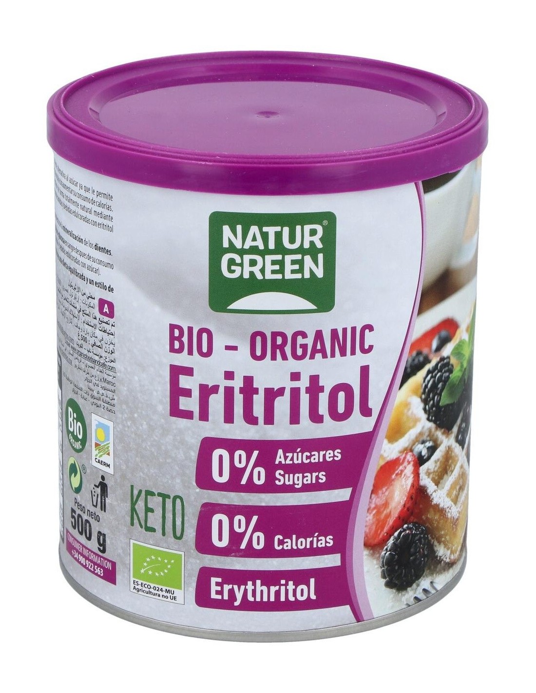 NATURGREENIngredientes:Eritritol*(100%). (*) Ingredientes procedentes de la agricultura ecológica.Valor nutricional por 100 gramos:
