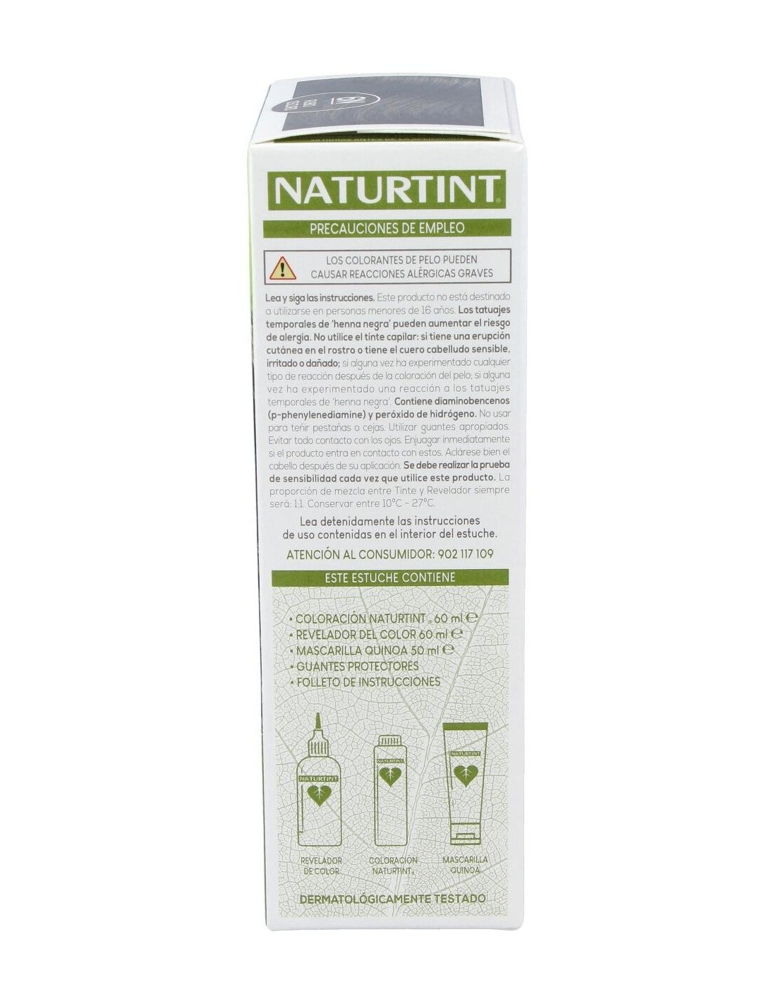 COLORACIÓN NATURTINT 60 ml: PEG-2 OLEAMINE. AQUA (PURIFIED WATER). ALCOHOL DENAT. PEG-4 RAPESEEDAMIDE. PROPANEDIOL. ETHANOLAMINE. OLEIC ACID. HYDROLYZED OAT PROTEIN. HYDROLYZED CORN PROTEIN. HYDROLYZED SOY PROTEIN. HYDROLYZED WHEAT PROTEIN. LIMNANTHES ALBA SEED OIL. TETRASODIUM GLUTAMATE DIACETATE. SODIUM METABISULFITE. SODIUM ERYTHORBATE. p-PHENYLENEDIAMINE. 4-CHLORORESORCINOL. 2 METHYLRESORCINOL. 2-AMINO-4-HYDROXYETHYLAMINOANISOLE SULFATE. m AMINOPHENOL. N,N-BIS (2-HYDROXYETHYL)-p-PHENYLENEDIAMINE SULFATE. OCTADECYL DI-T-BUTYL-4- HYDROXYHYDROCINNAMATE.