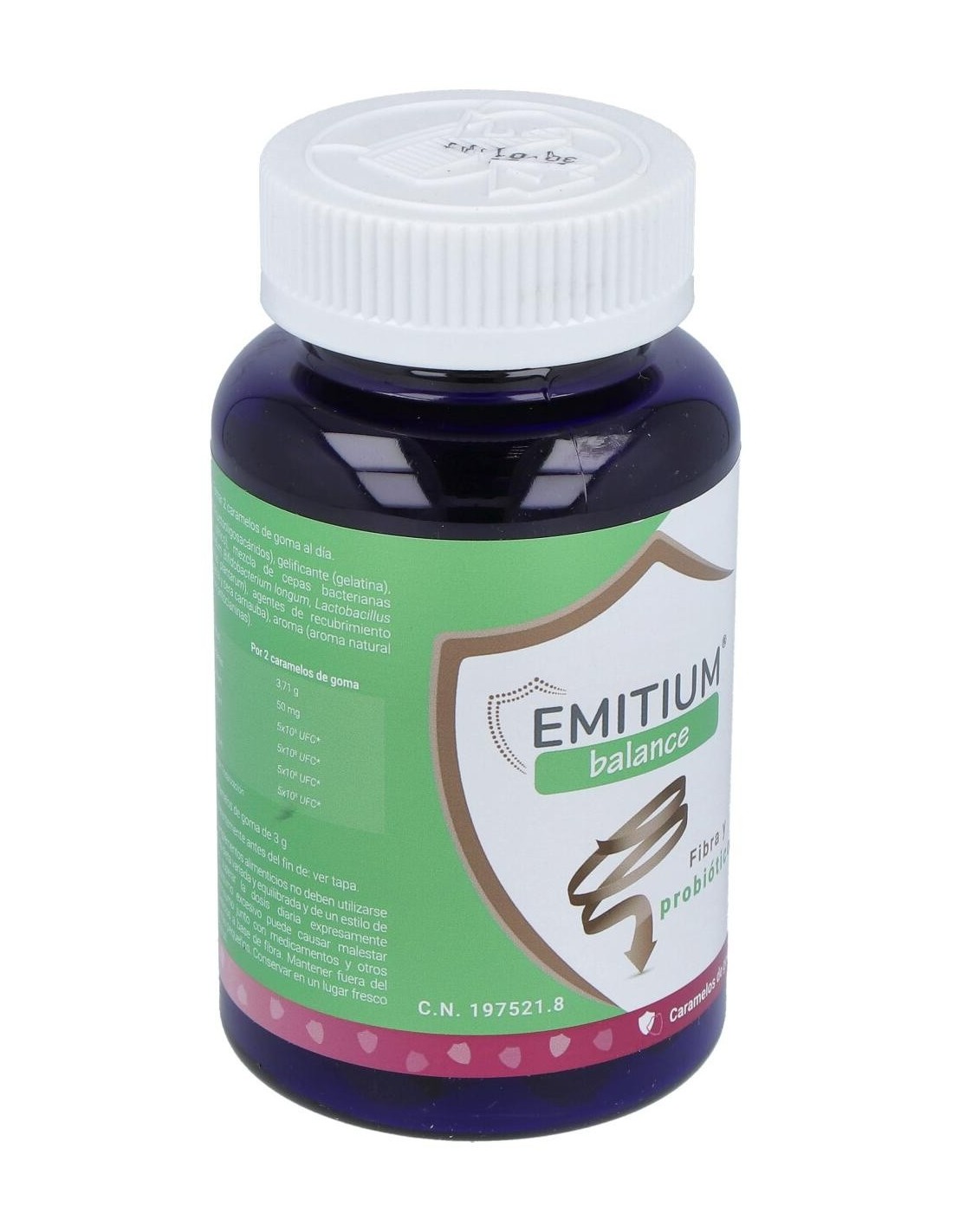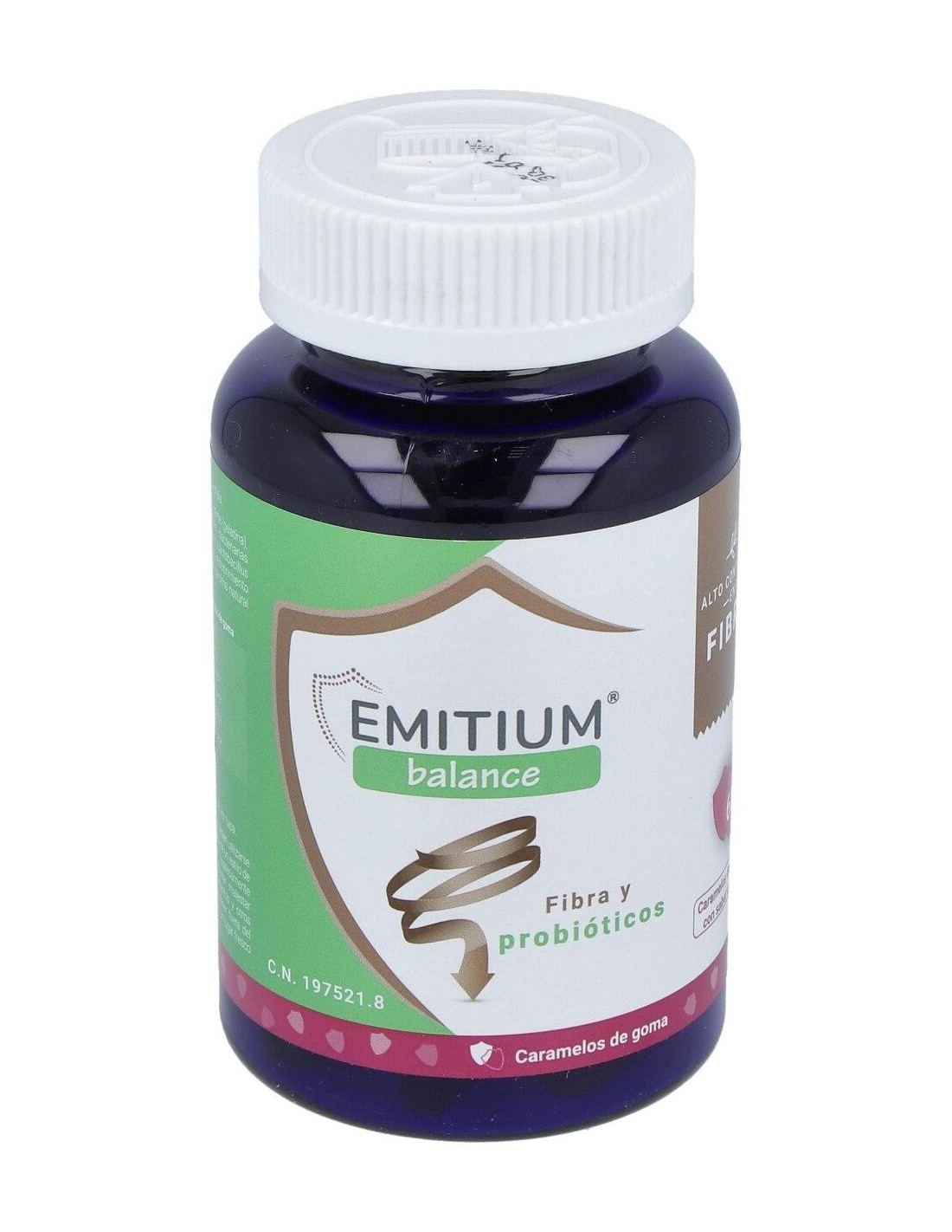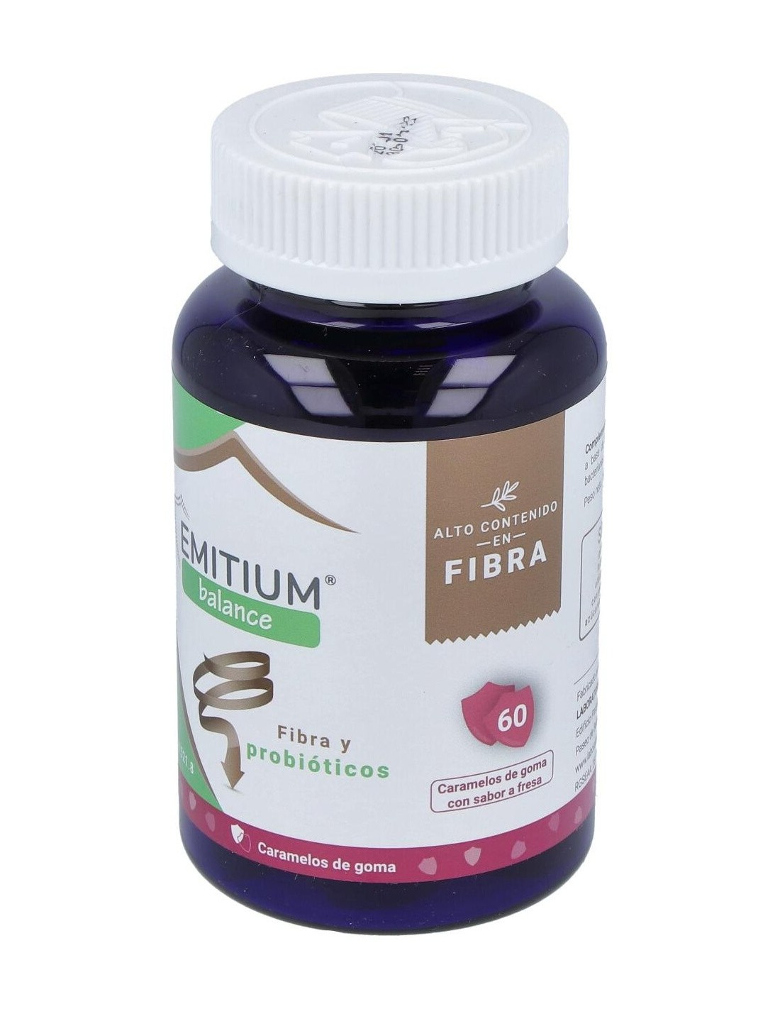 Emitium Balance es un complemento alimenticio con fibra FOS y probióticos tindalizados que ayuda a conseguir un aporte extra de fibra. Cada gominola aporta un extra de fibra alimentaria superior a la toma de un kiwi en ayunas.Muchas personas sufren de estreñimiento crónica y de falta de regularidad digestiva. Una alimentación variada, equilibrada y un estilo de vida saludable practicando actividad física regular, ayudan a equilibrar el tránsito intestinal.Composición activa por 2 gominolas: