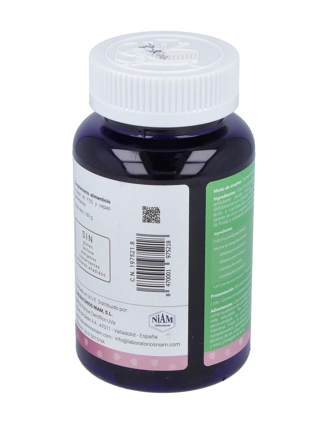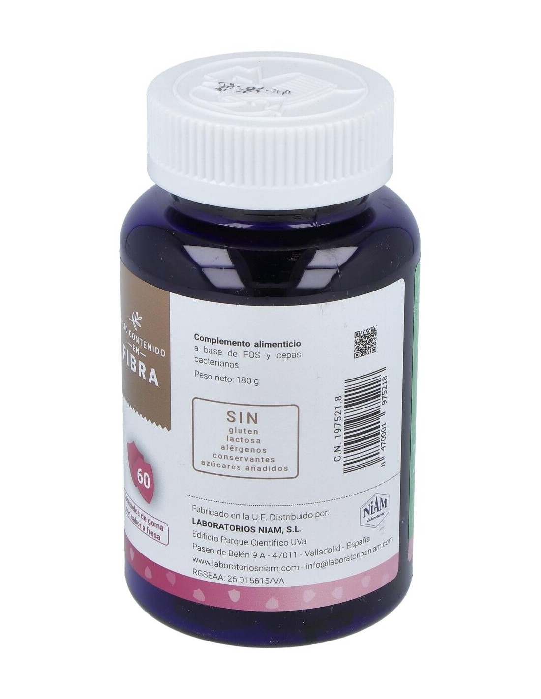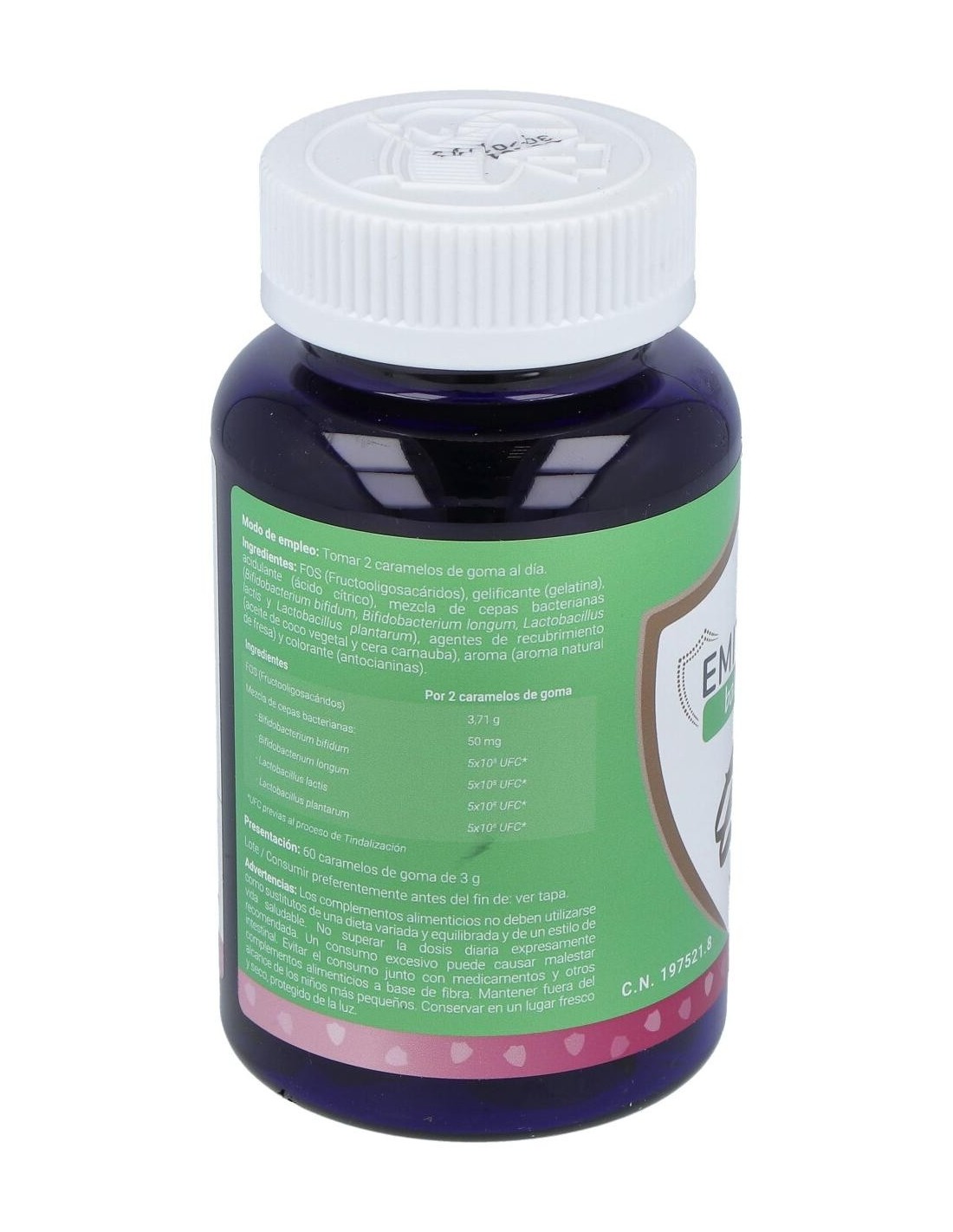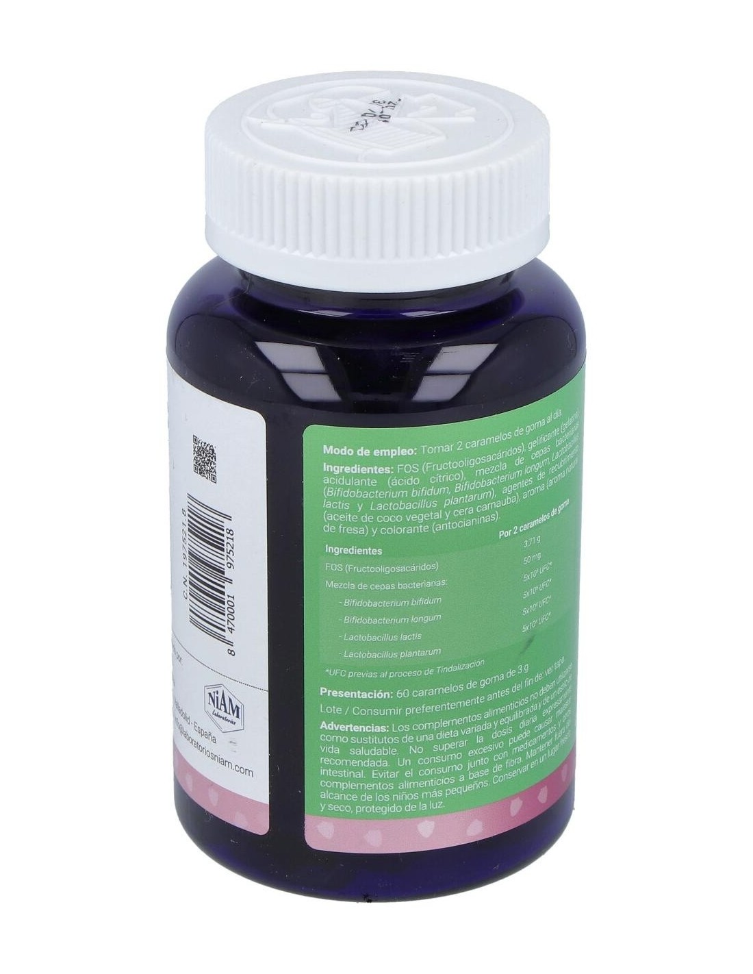Ingredientes:FOS (Fructooligosacáridos), gelificante (gelatina), acidulante (ácido cítrico), mezcla de cepas bacterianas (Bifidobacterium bifidum, Bifidobacterium longum, Lactobacillus lactis y Lactobacillus plantarum), agentes de recubrimiento (aceite de coco vegetal y cera carnauba), aroma (aroma natural de fresa) y colorante (antocianinas).Modo de empleo:Tomar 2 gominolas al día, preferentemente separado de las comidas. Recomendamos que sea siempre a la misma hora aproximadamente.Presentación:Envase de 60 gominolas.Recomendaciones y advertencias:No contiene gluten, azúcar ni lactosa.