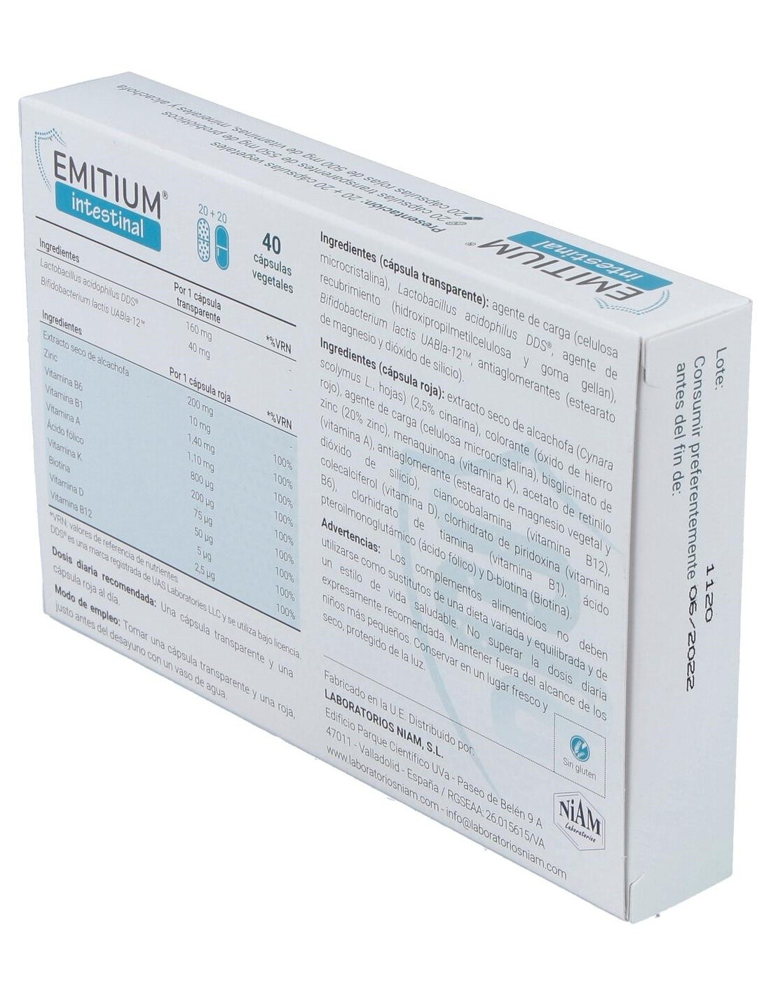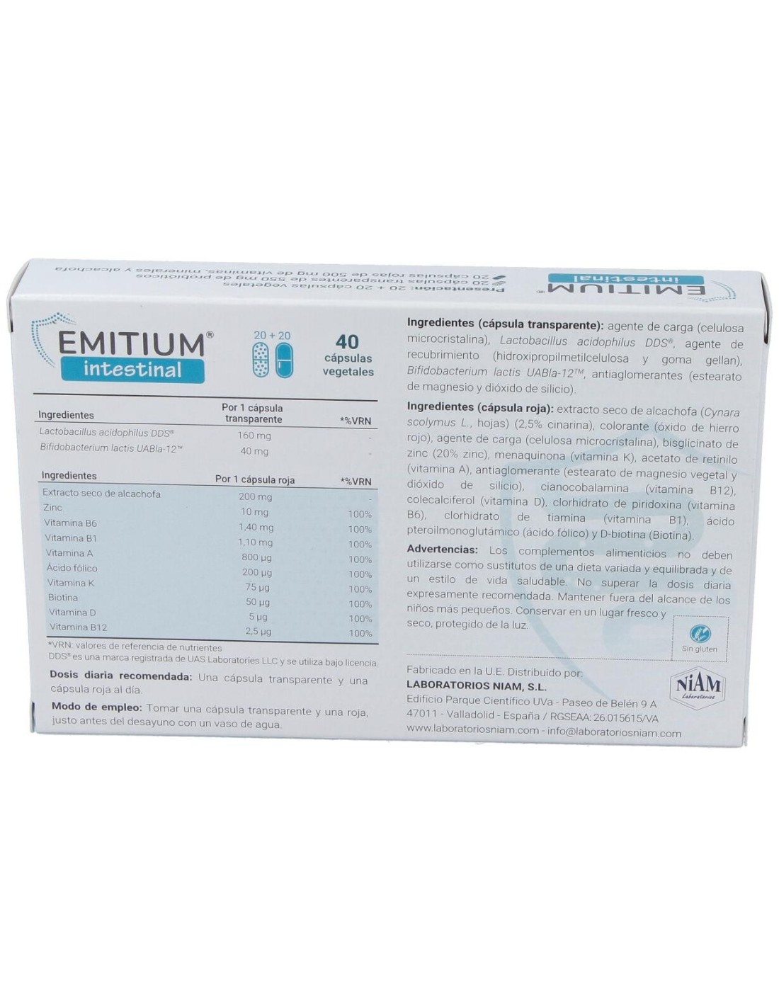 Emitium Intestinal es un complemento alimenticio con probióticos y nutrientes como el extracto de alcachofa que contribuye al normal funcionamiento del tránsito intestinal.Los problemas digestivos como diarreas, estreñimiento, dolor abdominal, hinchazón y gases o digestiones pesadas suelen ser avisos de que existe un desequilibrio en el sistema digestivo.Emitium® Intestinal es un complemento alimenticio de doble acción que contiene probióticos de las cepas Lactobacillus acidophilus DDS-1® (40.000 millones UFC) y Bifidobacterium lactis UAB lab-12TM (20.000 millones UFC) que se presentan en cápsulas de liberación lenta. Aporta Cynara Scolymus (extracto de alcachofa), que contribuye al bienestar intestinal. Incluye Biotina y Zinc, que contribuyen al metabolismo normal de los macronutrientes. Además aporta vitaminas A, B1, B6 y B9.La cápsula transparente: contiene las cepas Lactobacillus acidophilus DDS®-1 y Bifidobacterium lactis UABla-12TM que ayudan a atenuar desequilibrios intestinales que se manifiestan a través de síntomas como la distensión abdominal (gases e hinchazón), diarrea, estreñimiento y/o dolor de barriga.La Cápsula roja: contiene vitaminas, minerales y extractos vegetales especialmente orientados en ayudar al normal funcionamiento del tránsito intestinal (Extracto seco de hojas de alcachofra, Zinc, Vitamina B6, Vitamina B1, Vitamina A, Vitamina B9, Vitamina K2, Biotina, Vitamina D3 y Vitamina B12).Composición activa por:Cápsula transparente: