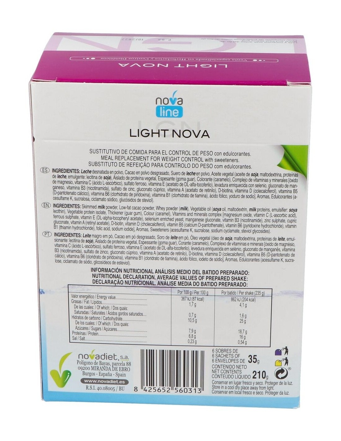 NOVADIETIngredientes: - Leche desnatada en polvo.- Lactosuero en polvo.- Café soluble/cacao en polvo desgrasado.