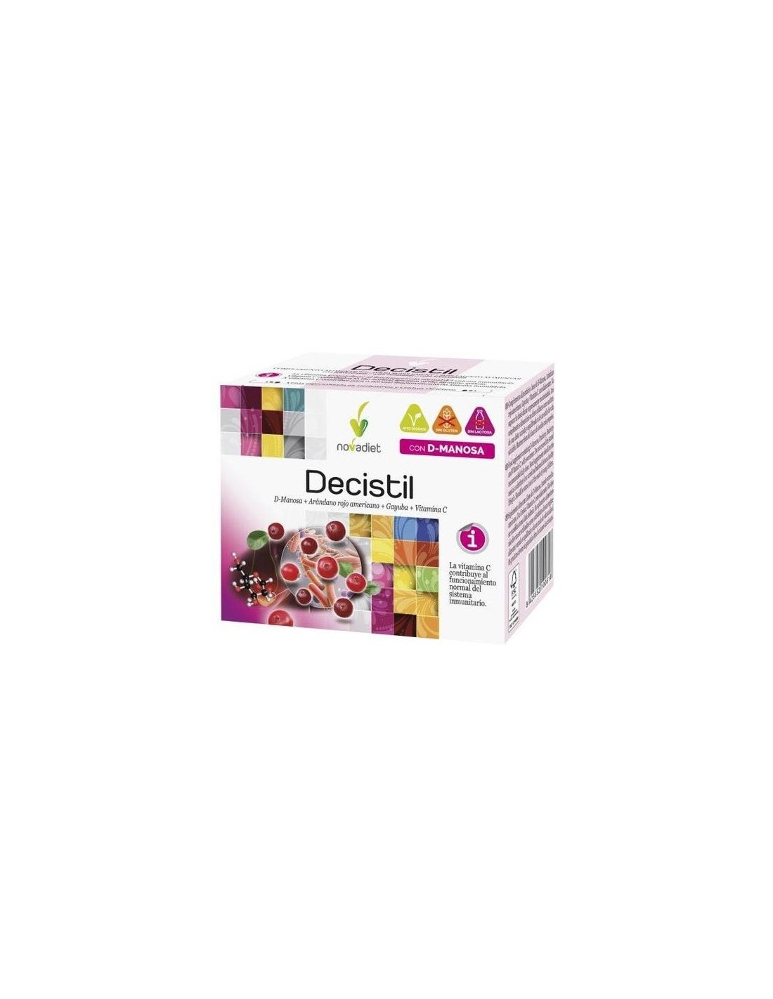Decistil de Nova Diet es un complemento alimenticio que utiliza conjuntamente la D-Manosa y el Arándano rojo americano son aún más eficaces, pues son capaces de inutilizar un mayor número de puntos de adhesión de la bacteria a la vejiga, ya que se unen a zonas distintas de la superficie de la E.coli, a las fimbrias tipo I y P, respectivamente.Las hojas de la planta Gayuba se han usado tradicionalmente como antiséptico de las vías urinarias, además de para ayudar a la diuresis. La Vitamina C contribuye al funcionamiento normal del sistema inmunitario y a la protección de las células frente al daño oxidativo. Tener un sistema inmune fortalecido nos protegerá mejor frente a los agentes infecciosos.Composición activa por sobre: