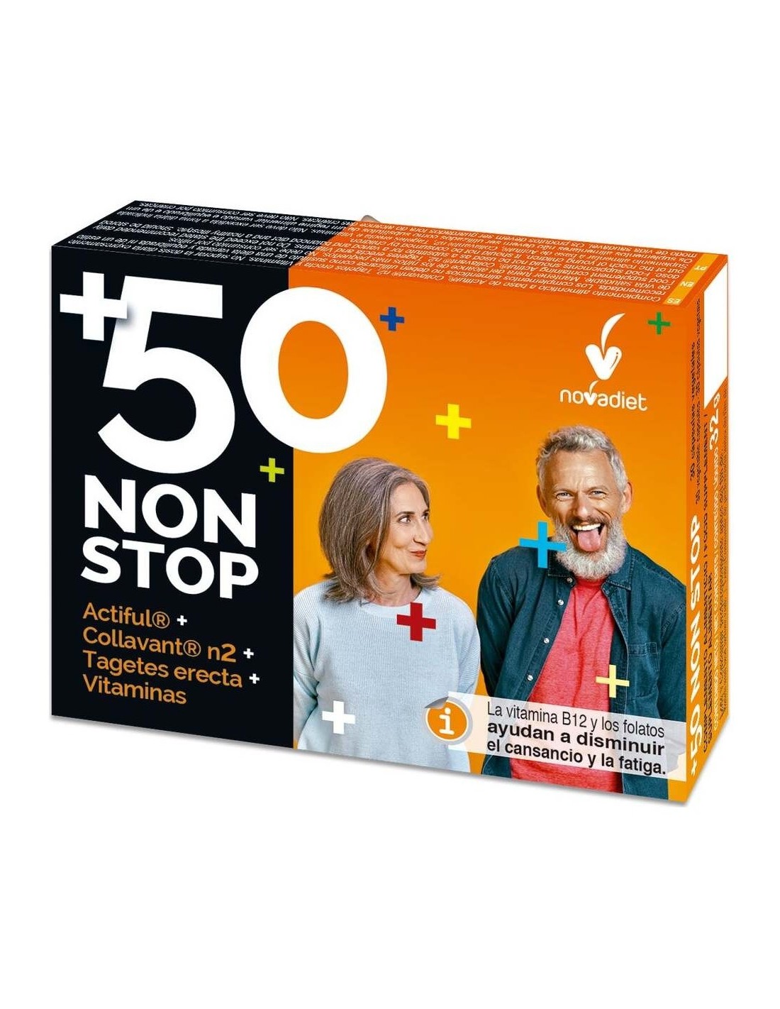 NOVADIETComplemento alimenticio especialmente formulado para personas a partir de 50 años. La vitamina B12 y los folatos ayudan a disminuir el cansancio y la fatiga. La vitamina D contribuye al mantenimiento de los huesos en condiciones normales y al funcionamiento normal de los músculos.