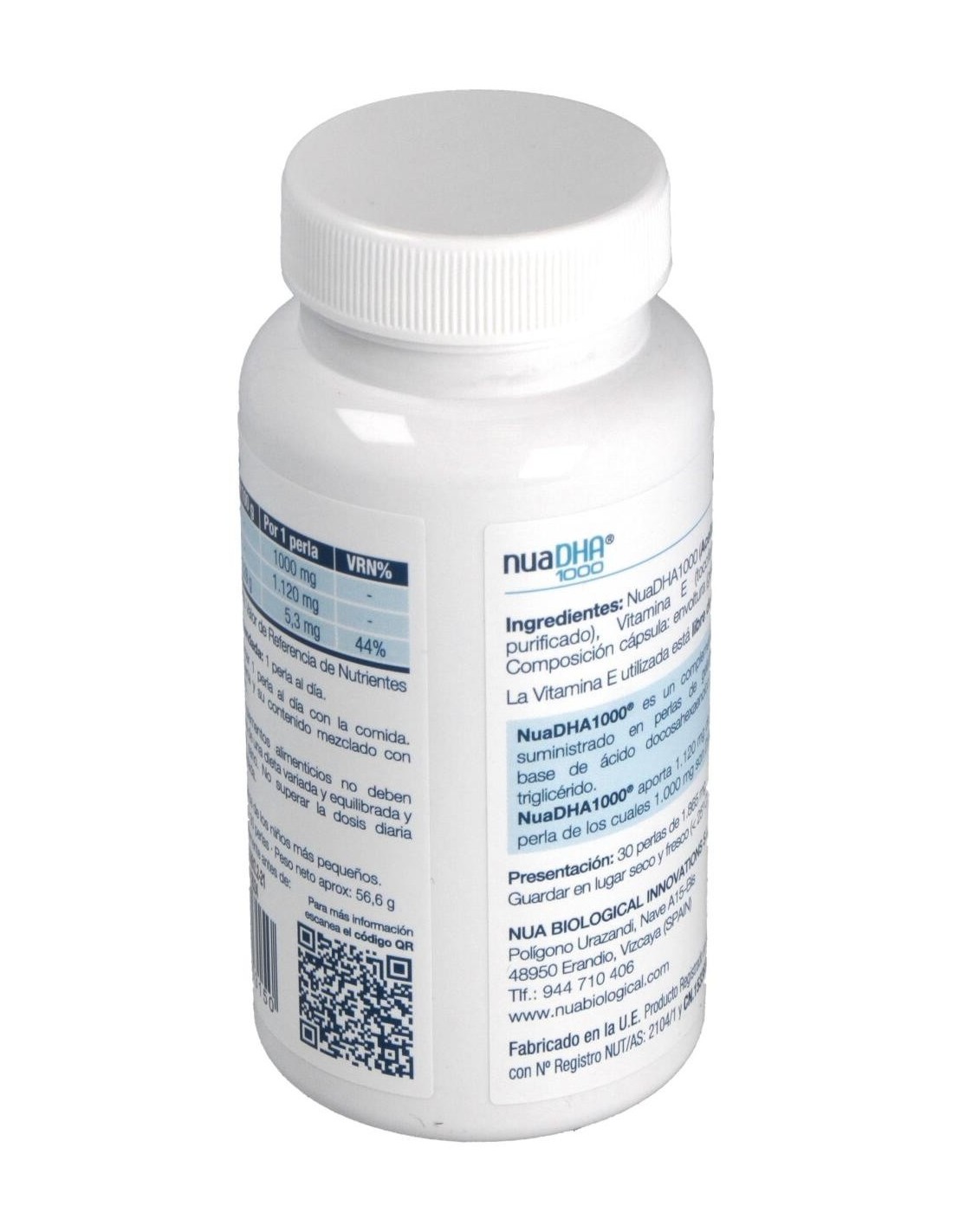 Complemento alimenticio muy puro y concentrado a base de omega-3 (procedente de pescado). Una perla de NuaDHA 1000 contiene aprox. 90% de omega-3, de los cuales más de un 85% son DHA.