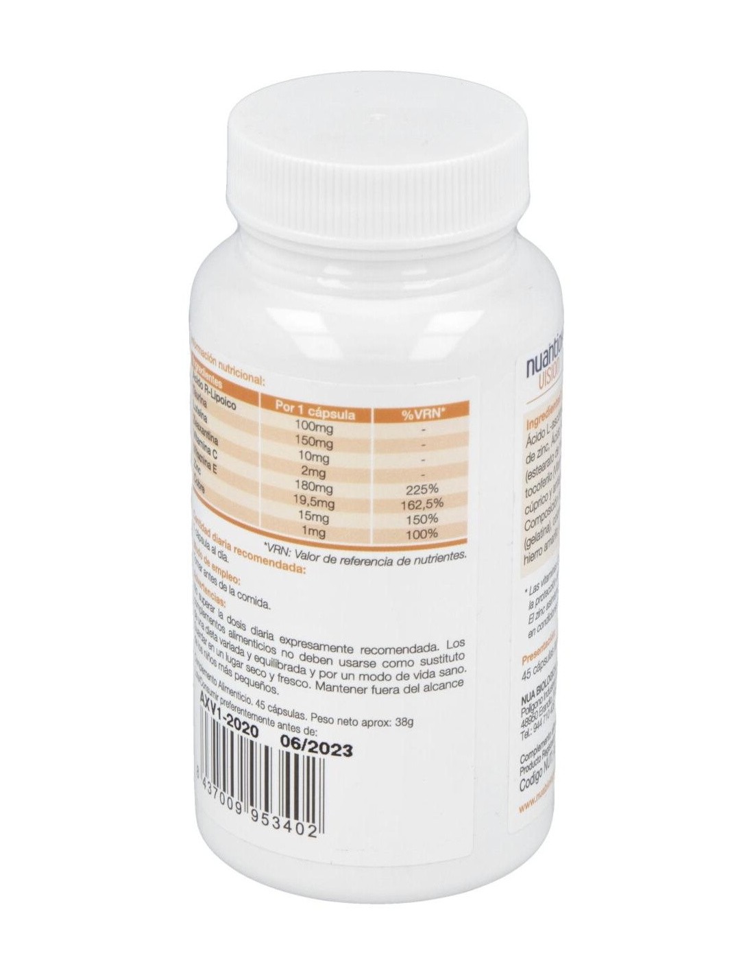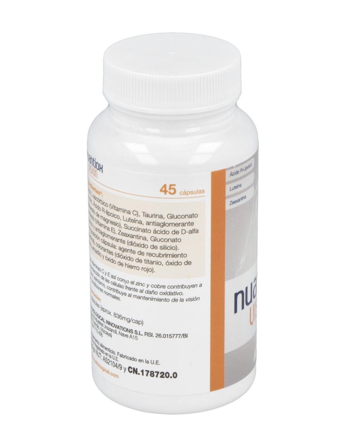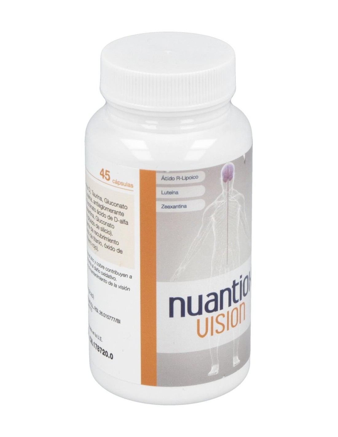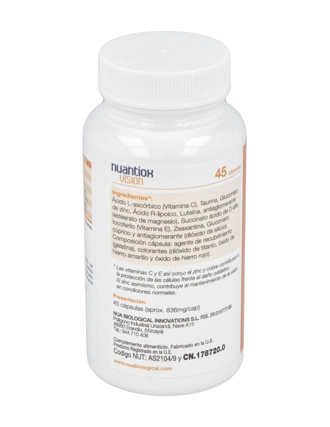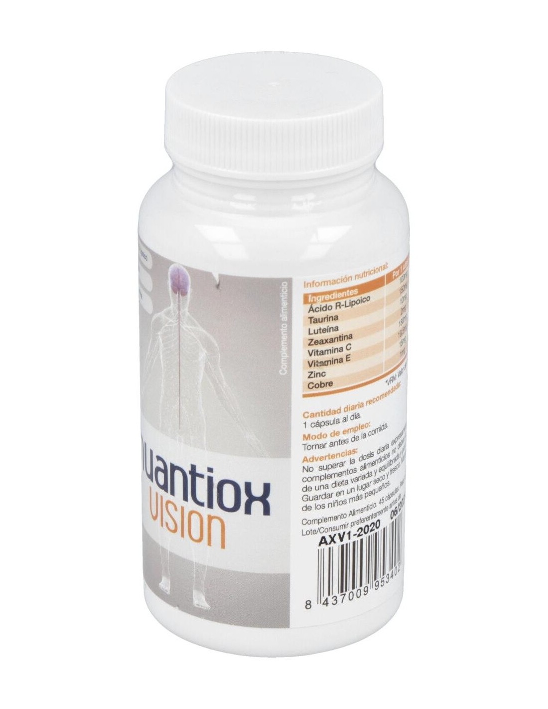 Complemento antioxidante para apoyar el sistema visual. Su composición coincide con la utilizada en el preparado A del Nuadha Visión. A diferencia del anterior producto, Nuantiox Visión no lleva DHA y está pensado para aquellas personas que solo buscan un apoyo antioxidante para su sistema visual. Los nutrientes antioxidantes de Nuantiox Visión incluyen todos los elementos son clave para la retina (Vitamina C, E, Luteína, Zeaxantina, Zn y Cu). Sin embargo, también se incluyen 3 nutrientes adicionales que son clave para la función visual: el DHA, el ácido R-lipoico y la taurina. No debe superarse la dosis expresamente recomendada. No debe usarse como sustituto de una dieta variada y equilibrada. Conviene guardar el envase en un lugar fresco y seco. Debe mantenerse fuera del alcance de los niños más pequeños.