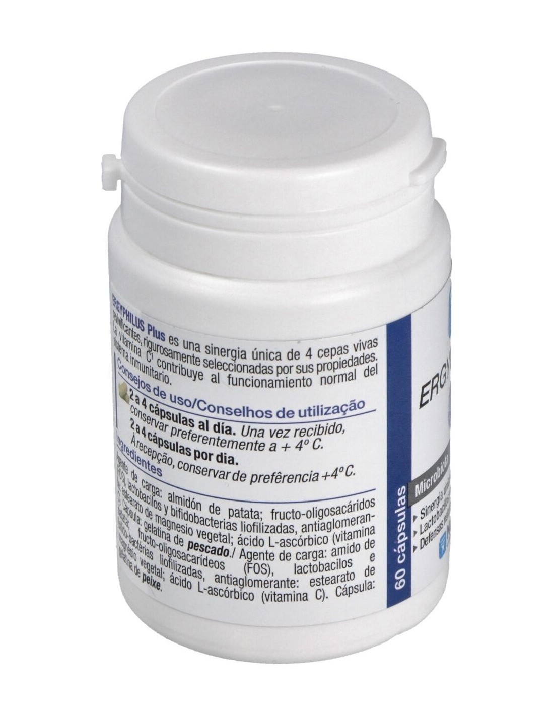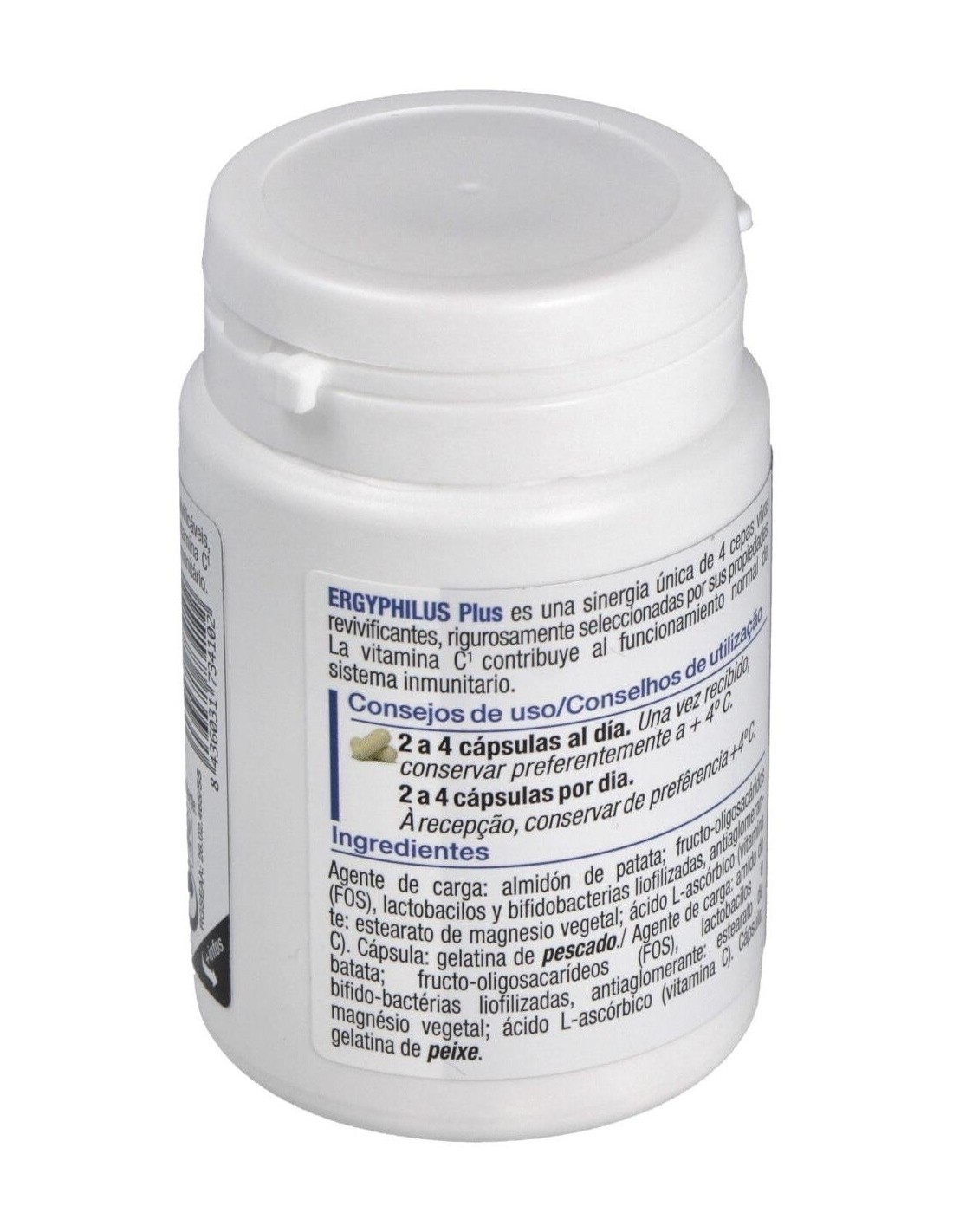 El producto está elaborado con ingredientes seleccionados para preservar la calidad y estabilidad de las cepas probióticas. Su envase está diseñado para mantener las condiciones óptimas de conservación, recomendando su almacenamiento en refrigeración para preservar la integridad del producto. Ergyphilus Plus es adecuado para quienes buscan complementar su dieta con un aporte específico de microorganismos beneficiosos.