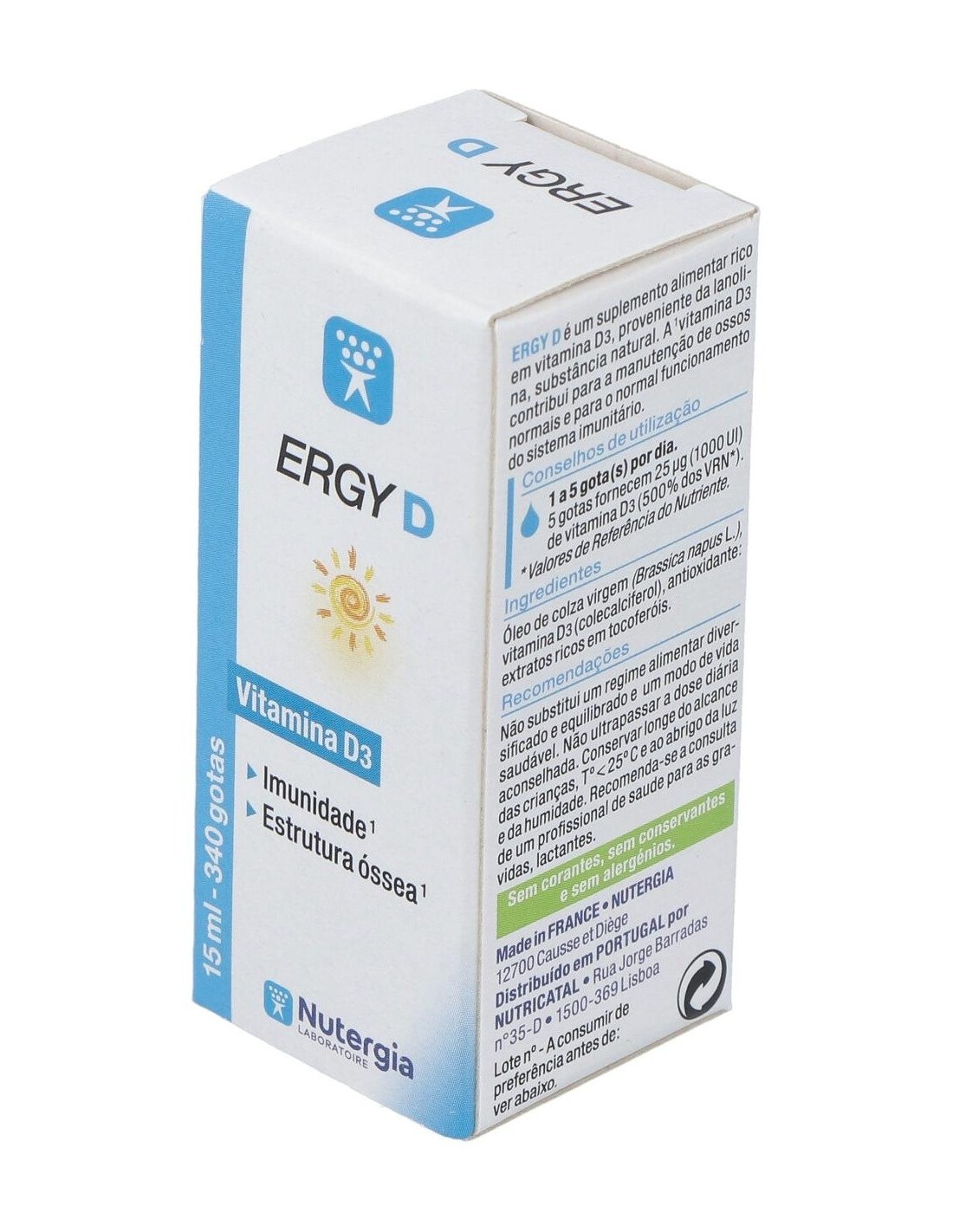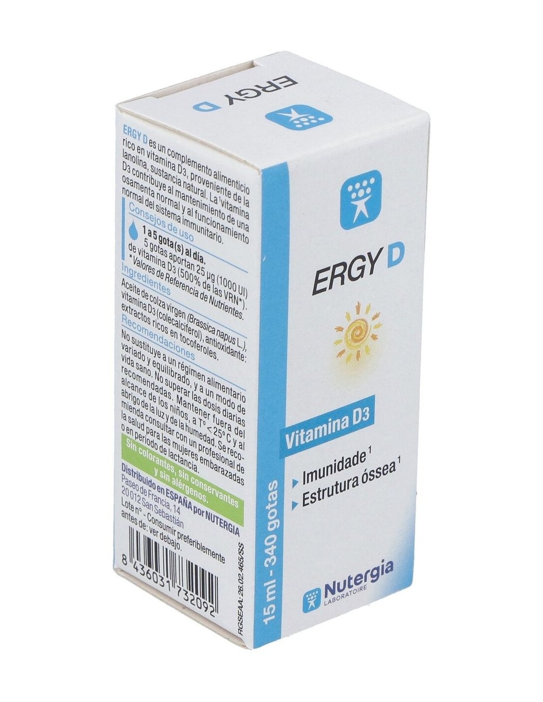 Ergy-D aporta colecalciferol o vitamina D3 de origen natural. Al ser una vitamina liposoluble, su soporte es el aceite virgen de colza, de primera presión en frío, enriquecido en vitamina E de origen natural para preservarla. La vitamina D3 (colecalciferol) juega un papel fundamental en el mantenimiento de la salud ósea y muscular, regulando el metabolismo del cuerpo.Indicado en los siguientes casos: