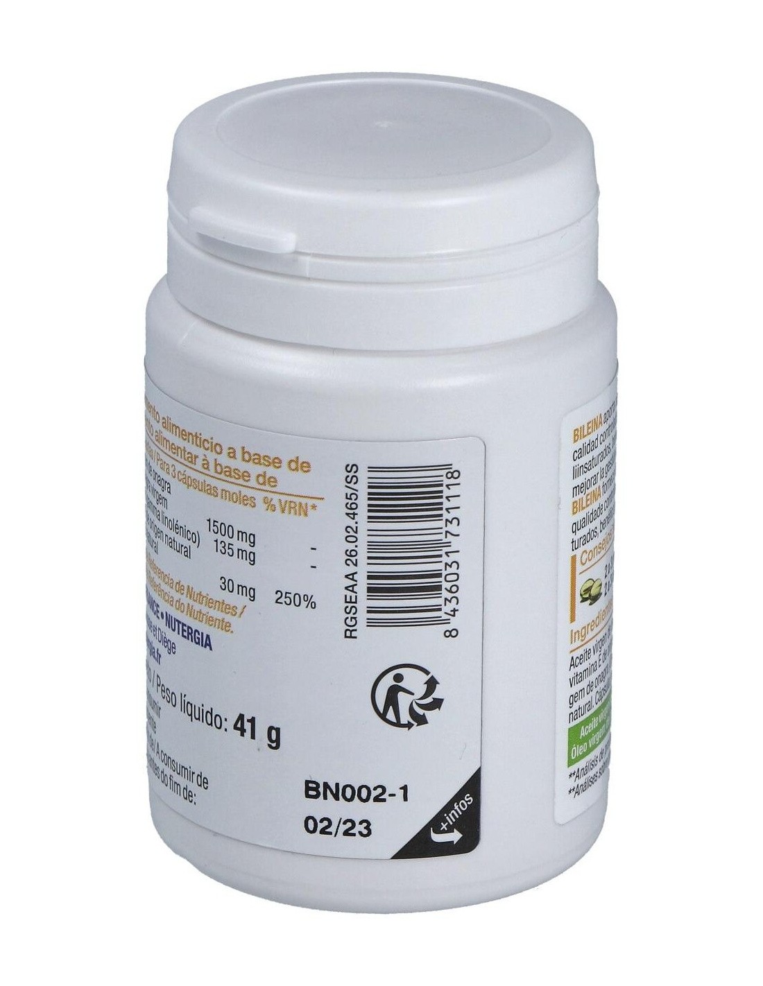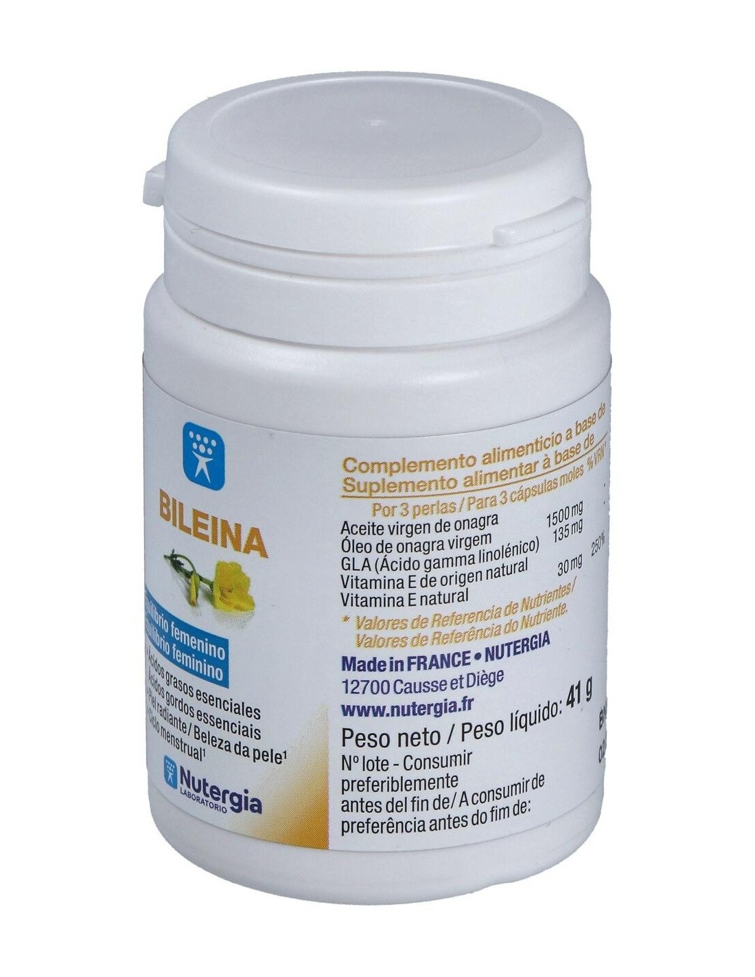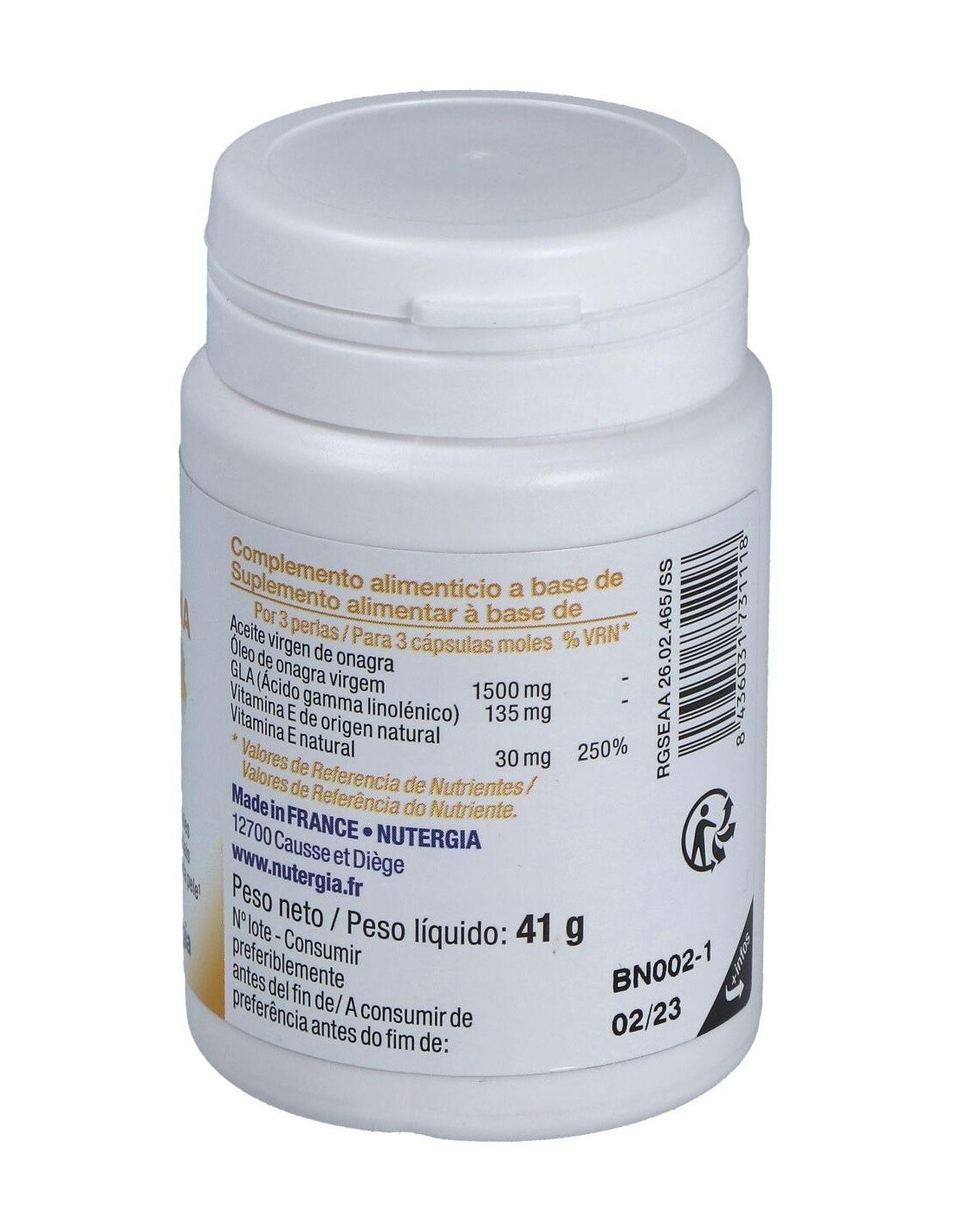 Aceite virgen de onagra (Oenothera biennis L.) de primera presión en frío, vitamina E de origen natural. Perla: Gelatina de pescado, glicerol.