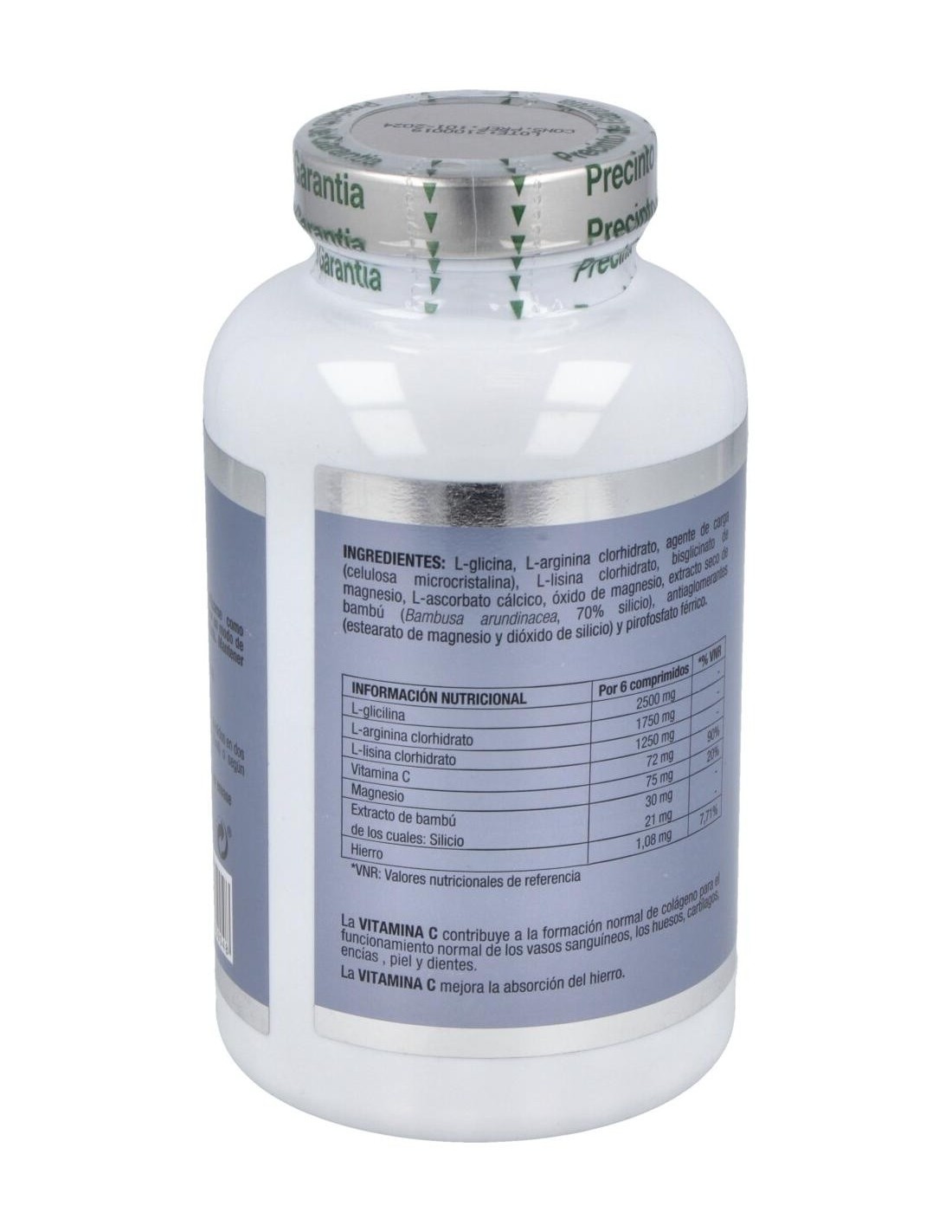 L-glicina, agente de carga (celulosa microcristalina), L-arginina clorhidrato, L-lisina clorhidrato, bisglicinato de magnesio, L-ascorbato cálcico, antiaglomerante (dióxido de silicio), óxido de magnesio, extracto seco de bambú (Bambusa arundinacea, 70% silicio), antiaglomerante (estearato de magnesio) y pirofosfato férrico.