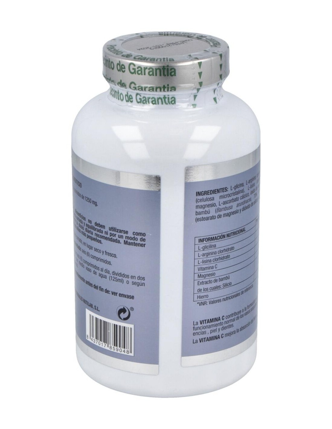 Complemento alimenticio a base de aminoácidos, vitamina C, hierro, silicio y magnesio. La vitamina C contribuye a la formación normal de colágeno para el funcionamiento normal de los vasos sanguíneos, los huesos, cartílagos, encías , piel y dientes. Apto para veganos.