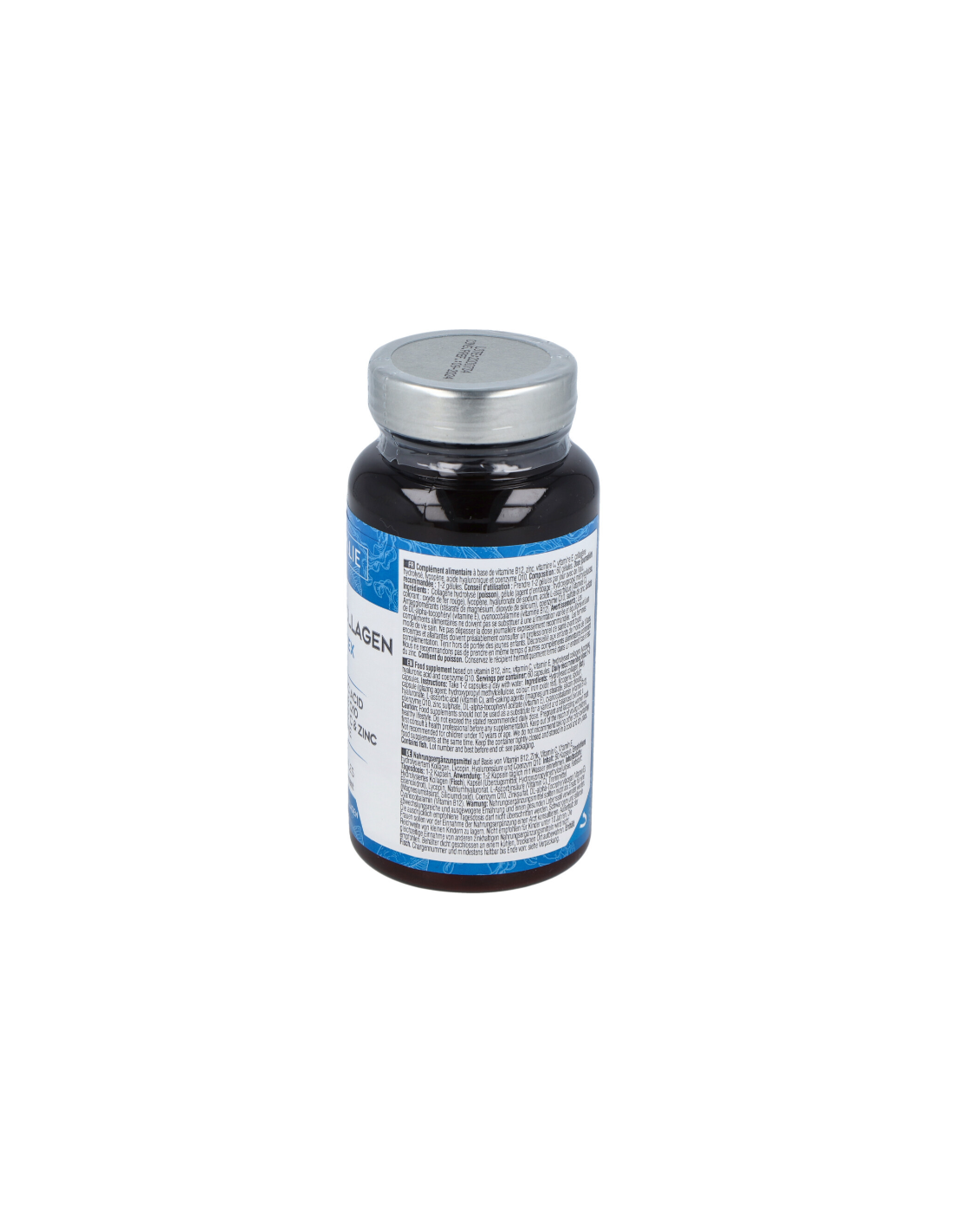 Ingredientes:Colágeno hidrolizado (pescado),cápsula (agente de recubrimiento: hidroxipropilmetilcelulosa, colorante: óxido de hierro rojo), licopeno, hialuronato sódico, ácido L-ascórbico (vitamina C), antiaglomerantes (estearato de magnesio, dióxido de silicio), coenzima Q10, sulfato de zinc, acetato de DL-alfa-tocoferilo (vitamina E), cianocobalamina (Vitamina B12).Modo de empleo:Tomar 1-2 cápsulas al día con agua.Presentación:Envase de 60 cápsulas.Recomendaciones y advertencias:Contiene pescado.