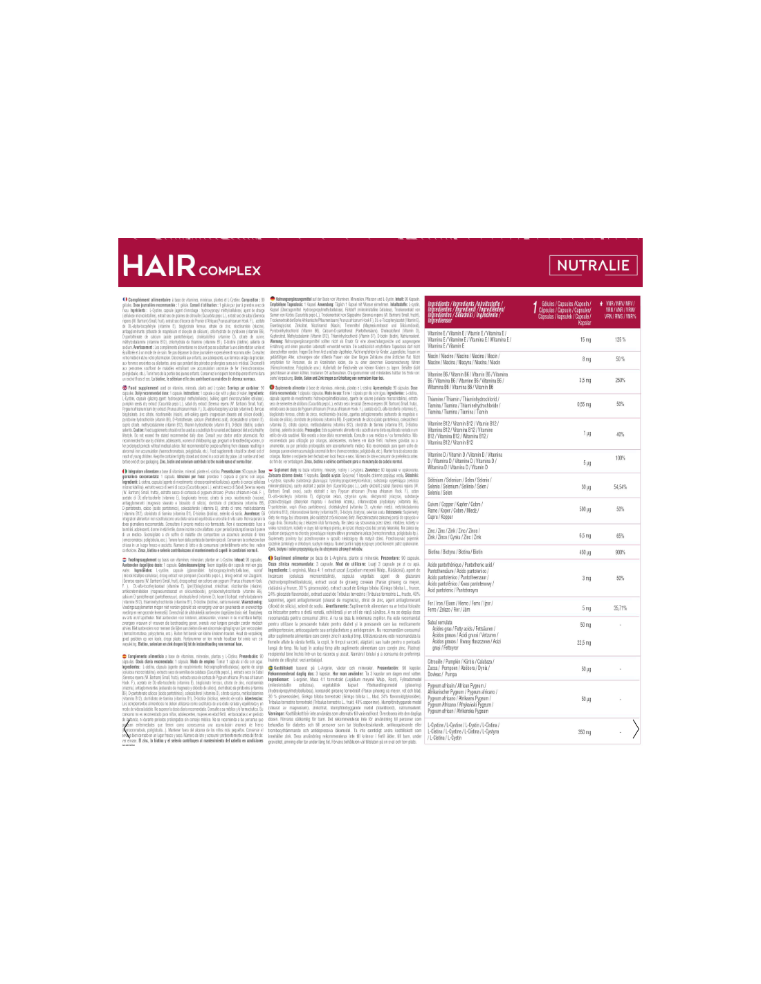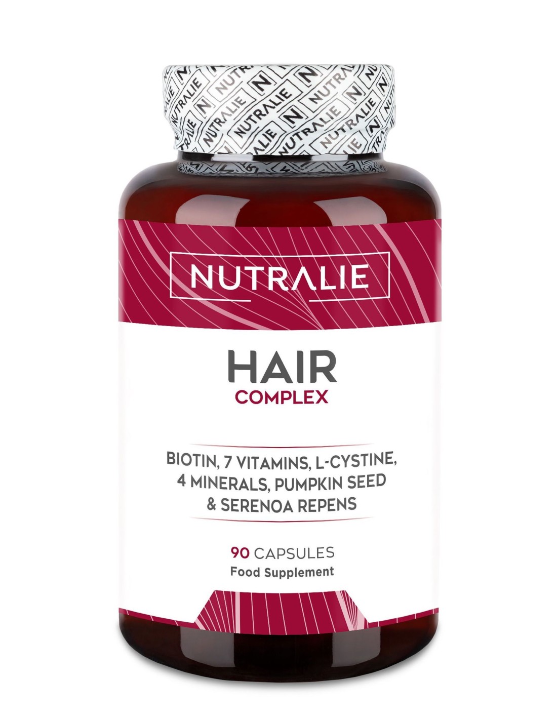 NUTRALIEHair Complex está formulado a base de L-Cistina, Biotina, Selenio, Zinc, Cobre, Semillas de Calabaza y Serenoa Serrulata. Una fórmula compleja con una