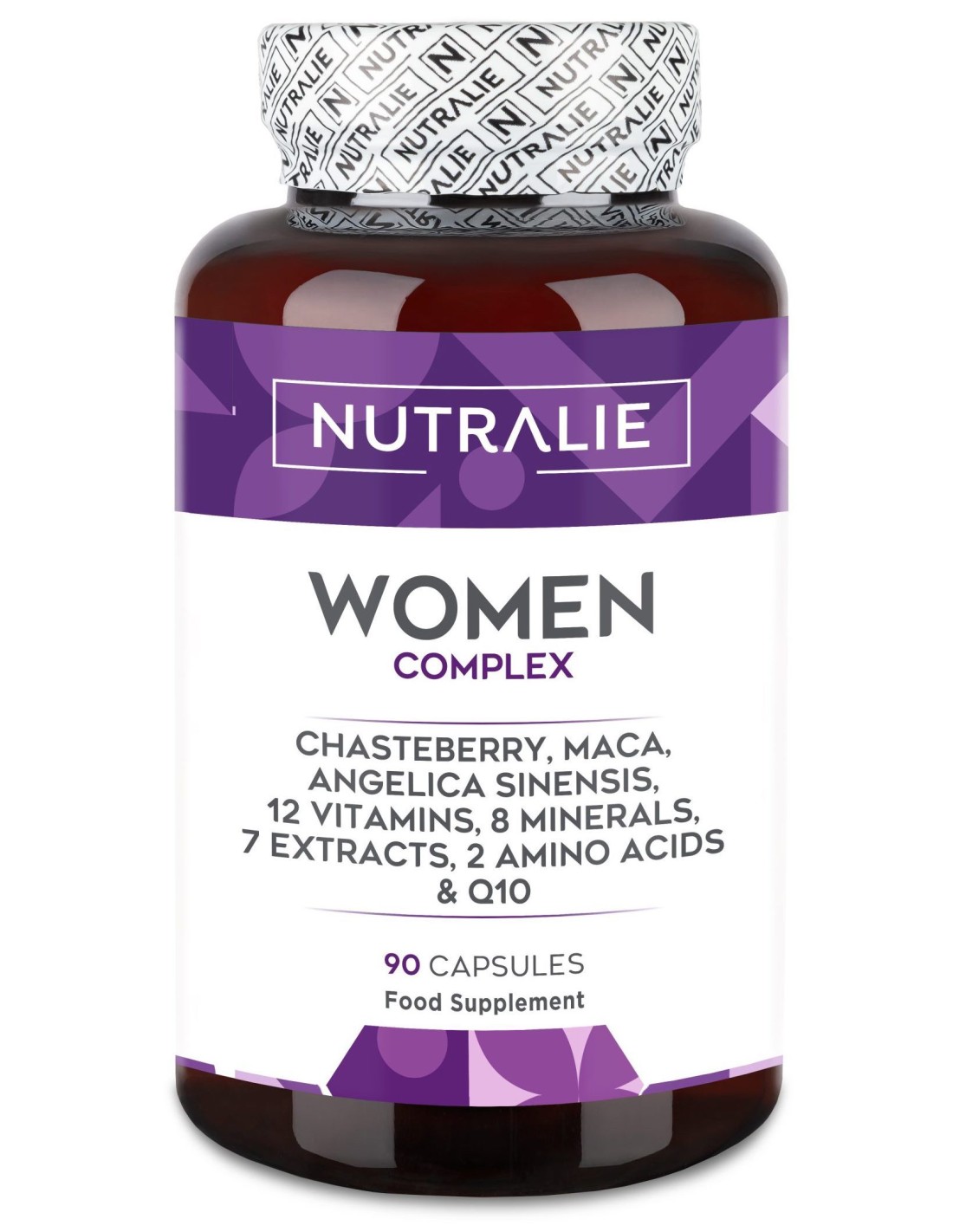 Women Complex de Nutralie es un complemento alimenticio natural desarrollado específicamente para mujeres con el objetivo de cubrir la actividad física, mental y sexual.Está formulada con vitaminas, minerales y extractos naturales esenciales que favorecen a equilibrar los cambios hormonales y lidiar con los síntomas, fortalecer las defensas y suplementar déficits de minerales.Contiene una mezcla equilibrada de vitaminas y minerales, incluyendo Vitaminas A, C, D y K2, así como Ácido Fólico, Calcio y Hierro que contribuyen a mantener una salud óptima.Contiene extractos naturales de Sauzgatillo, Angélica Sinensis y Tribulus Terrestris, conocidos por sus propiedades beneficiosas para el cuerpo femenino. La sinergia entre estos elementos ayuda a aliviar los síntomas del síndrome premenstrual como la hinchazón, los dolores de cabeza y los cambios de humor y a regular el ciclo menstrual.La combinación de Inositol, L-tirosina, Extracto de Tribulus Terrestris y Maca Negra ayuda a mejorar el deseo, la vitalidad sexual y el estado de ánimo. Además, trabajan junto con el Hierro y la Vitamina B12 para proporcionar energía durante todo el día.Composición activa por 3 cápsulas: