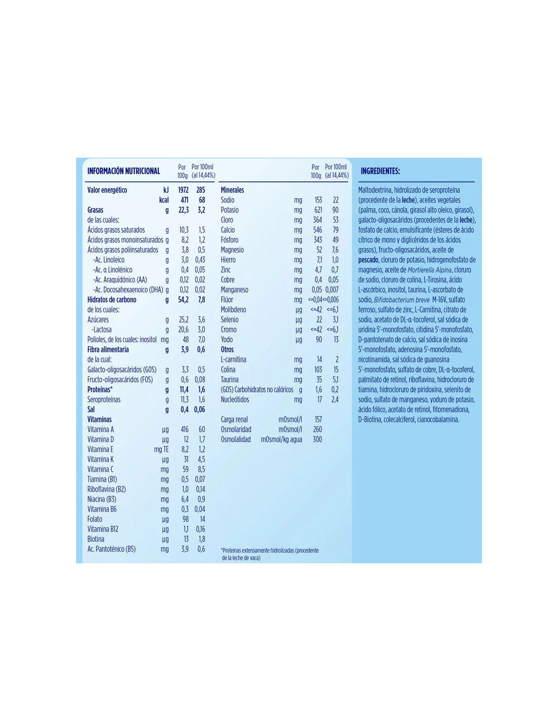 Además, la fórmula está enriquecida con vitaminas y minerales esenciales que contribuyen al desarrollo óptimo del sistema nervioso y óseo, garantizando un aporte completo y equilibrado. Su preparación es sencilla y rápida, permitiendo una alimentación instantánea que se adapta a las necesidades diarias del bebé, sin complicaciones ni esperas.