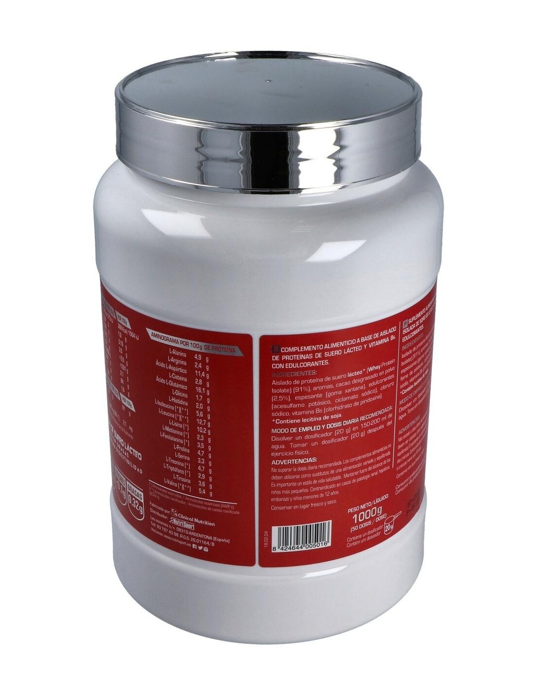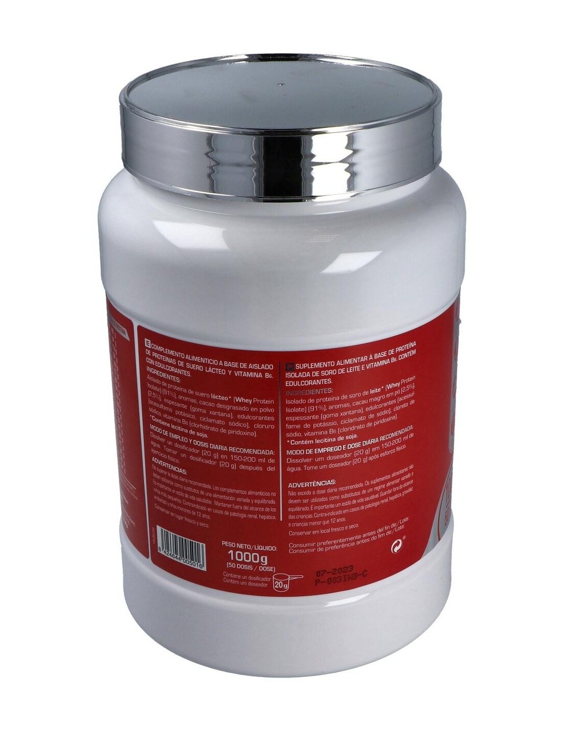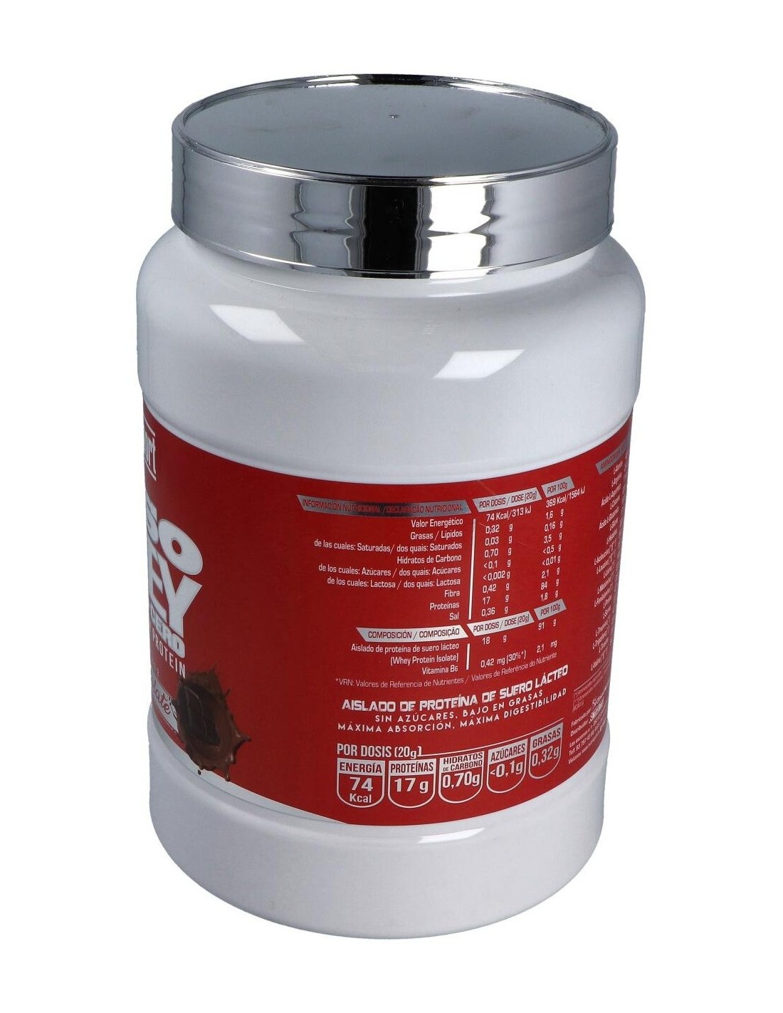Complemento alimenticio a base de proteína pura (Whey Protein Isolate) perfecto para aquellas personas que quieran ganar masa muscular sin añadir calorías a su dieta ya que está libre de grasas y azúcares, ayudando a la formación y conservación de los músculos y al mantenimiento sano de los huesos. Sabor chocolate.