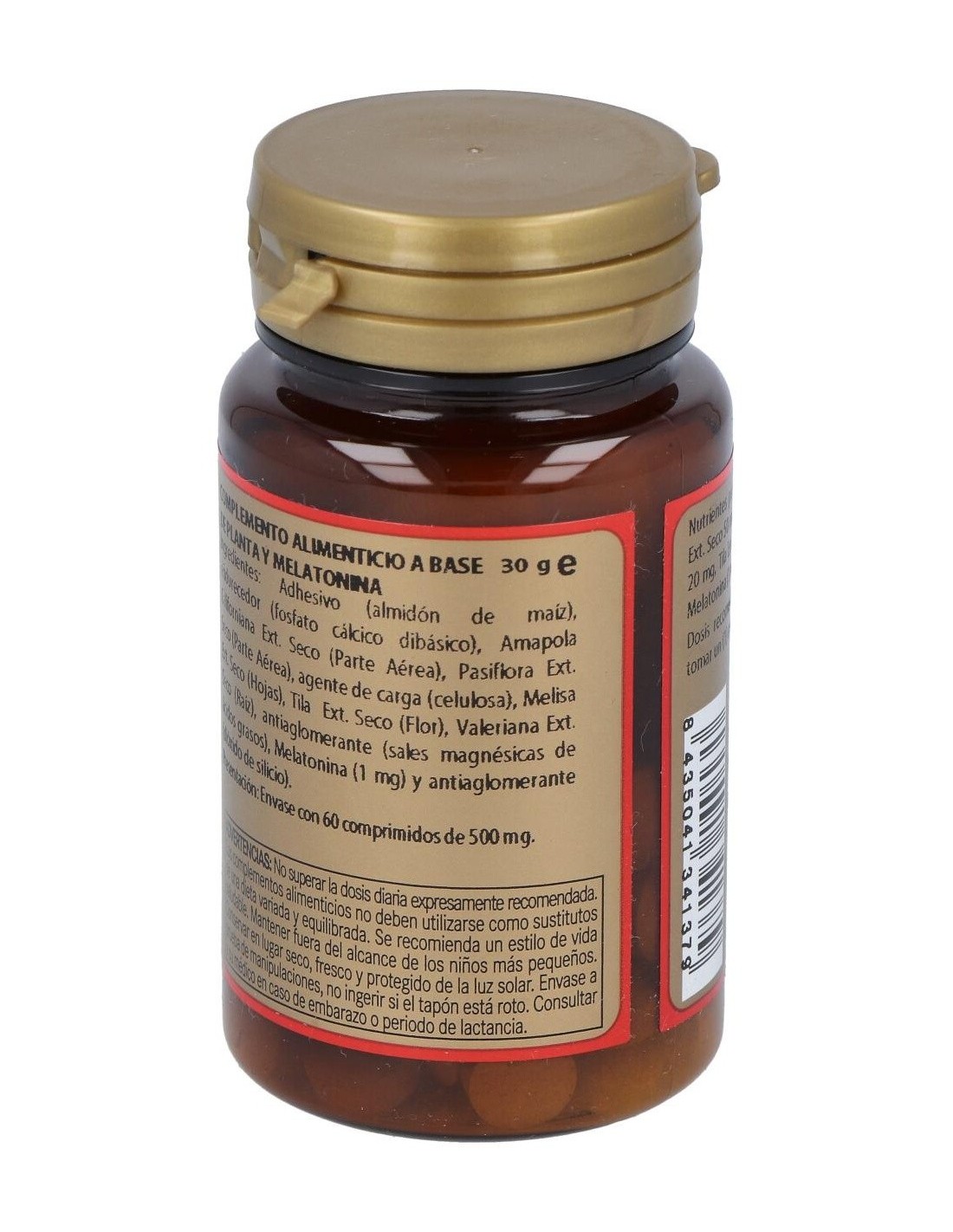 Complemento alimenticio en formato comprimidos y elaborado a base de melatonina y reforzado con amapola californiana, pasiflora, melisa, tila y valeriana. La melatonina es una hormona natural que está especialmente indicada para contribuir a regular los ciclos del sueño en casos de viajes largos y jet-lag, insomnio o en personas que trabajan con turnos cambiantes o de noche.