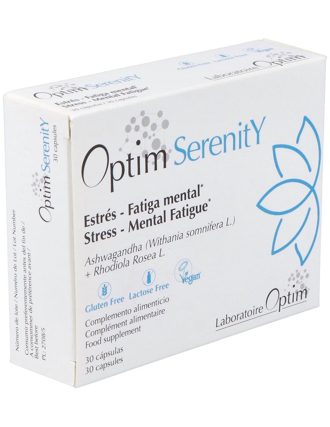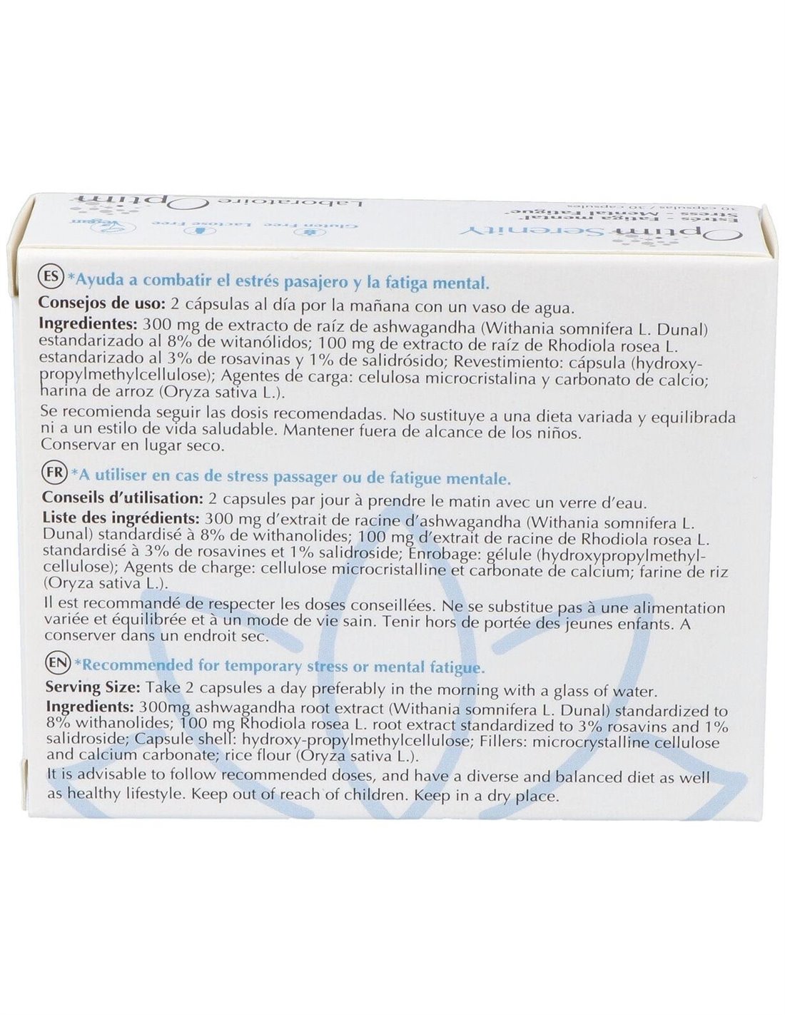 OPTIM SERENITYLa ashwagandha y la Rhodiola rosea ayudan a combatir el estrés pasajero y la fatiga mental. Apto para veganos.