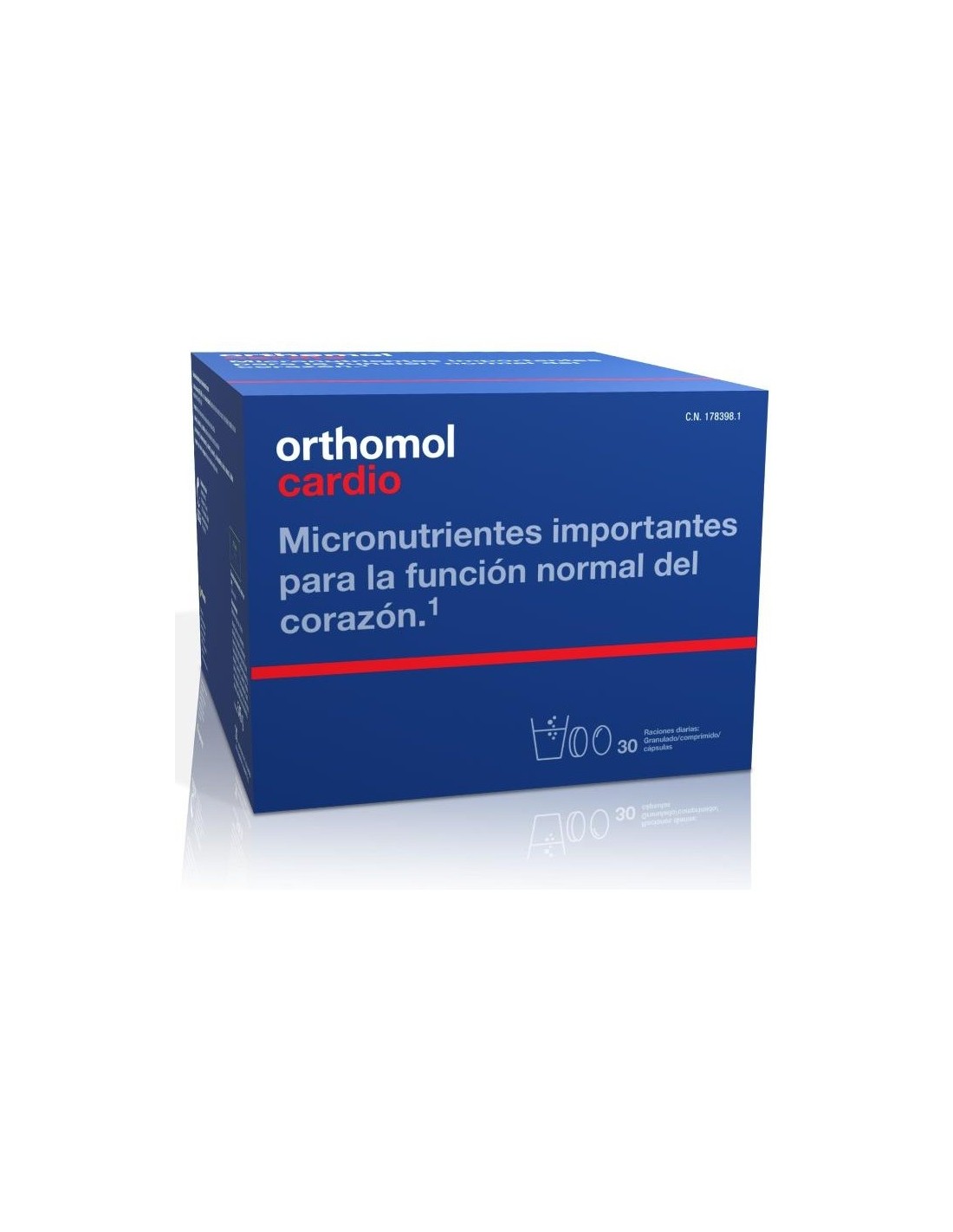 Orthomol® Cardio es un complemento alimenticio con micronutrientes importantes para la función normal del músculo cardíaco, así como para un rendimiento energético y metabolismo de la homocisteína normales.Los ácidos grasos omega 3 EPA y DHA así como la vitamina B1 (Tiamina) contribuyen a la función normal del corazón. El efecto positivo se establece con una ingesta diaria de 250 mg de EPA y DHA. La tiamina (vitamina B1), la riboflavina (vitamina B2), la vitamina B6, la vitamina B12, el ácido pantoténico, la niacina, la vitamina C, la biotina, el magnesio, el yodo, el cobre y el manganeso contribuyen al metabolismo energético normal.Además el magnesio contribuye a la función normal de los músculos incluido el músculo cardíaco. La vitamina B6, la vitamina B12 y el ácido fólico contribuyen al metabolismo normal de la homocisteína. La riboflavina (vitamina B2), la vitamina C y la vitamina E así como el cobre, el manganeso, el selenio y el zinc contribuyen a la protección de las células del estrés oxidativo.Composición activa por 1 sobre, 1 comprimido y 3 cápsulas: