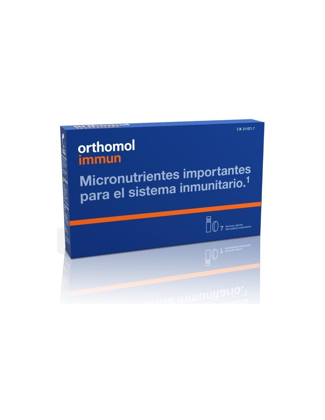 El sistema inmunitario desempeña un papel decisivo en la protección del cuerpo humano ya que actúa contra bacterias, virus y hongos. Especialmente durante los meses de otoño e invierno es necesario ayudar a nuestro sistema inmunológico.Orthomol immun, tu aliado perfecto. Los estudios científicos demuestran que una combinación específica de vitaminas y minerales pueden ser útiles para reforzar el sistema inmunitario. Orthomol immun esta compuesto por 25 micronutrientes como la vitamina C, vitamina D, zinc, selenio, cobre, ácido fólico, vitamina A, vitamina B12 que contribuyen al correcto del sistema inmunitario.Ingredientes:Agua, bioflavonoides de concentrado de zumo de naranja, estabilizador (glicerol), L-ascorbato de sodio, almidón modificado (de trigo), concentrado de zumo de maracuyá, acidulante (ácido láctico), sacarosa, maltodextrina, acetato de DL-alfa-tocoferilo, agente de carga (celulosa microcristalina), gluconato ferroso, nicotinamida, clorhidrato de tiamina, conservante (sorbato potásico), riboflavina, clorhidrato de piridoxina, D-pantotenato cálcico, cloruro de zinc, antioxidante (extracto rico en tocoferol), agente de recubrimiento (hidroxipropilmetilcelulosa), edulcorante (acesulfamo K), edulcorante (ciclamato sódico), estabilizador (polidextrosa), colorante (carbonato de calcio), sulfato de manganeso, edulcorante (sacarina sódica), aroma, antiaglomerante (sales magnésicas de ácidos grasos), antiaglomerante (dióxido de silicio), antiaglomerante (ácidos grasos), beta-caroteno, sulfato de cobre, antiaglomerante (talco), palmitato de retinilo, ácido pteroilmonoglutámico, luteína (de extracto Tagetes erecta), edulcorante (sucralosa), yoduro potásico, licopeno, D-biotina, cloruro de cromo (III), molibdato de sodio, colorante (óxidos de hierro), seleniato de sodio, filoquinona, cianocobalamina, colecalciferol.Modo de empleo:Tomar diariamente el contenido de un vial bebible junto con los comprimidos durante o después de una comida. Agitar bien antes de usar.Presentación:Envase de 7 raciones (viales bebibles + comprimidos).Recomendaciones y advertencias:No contiene gluten ni lactosa. No tomar en embarazo y lactancia.