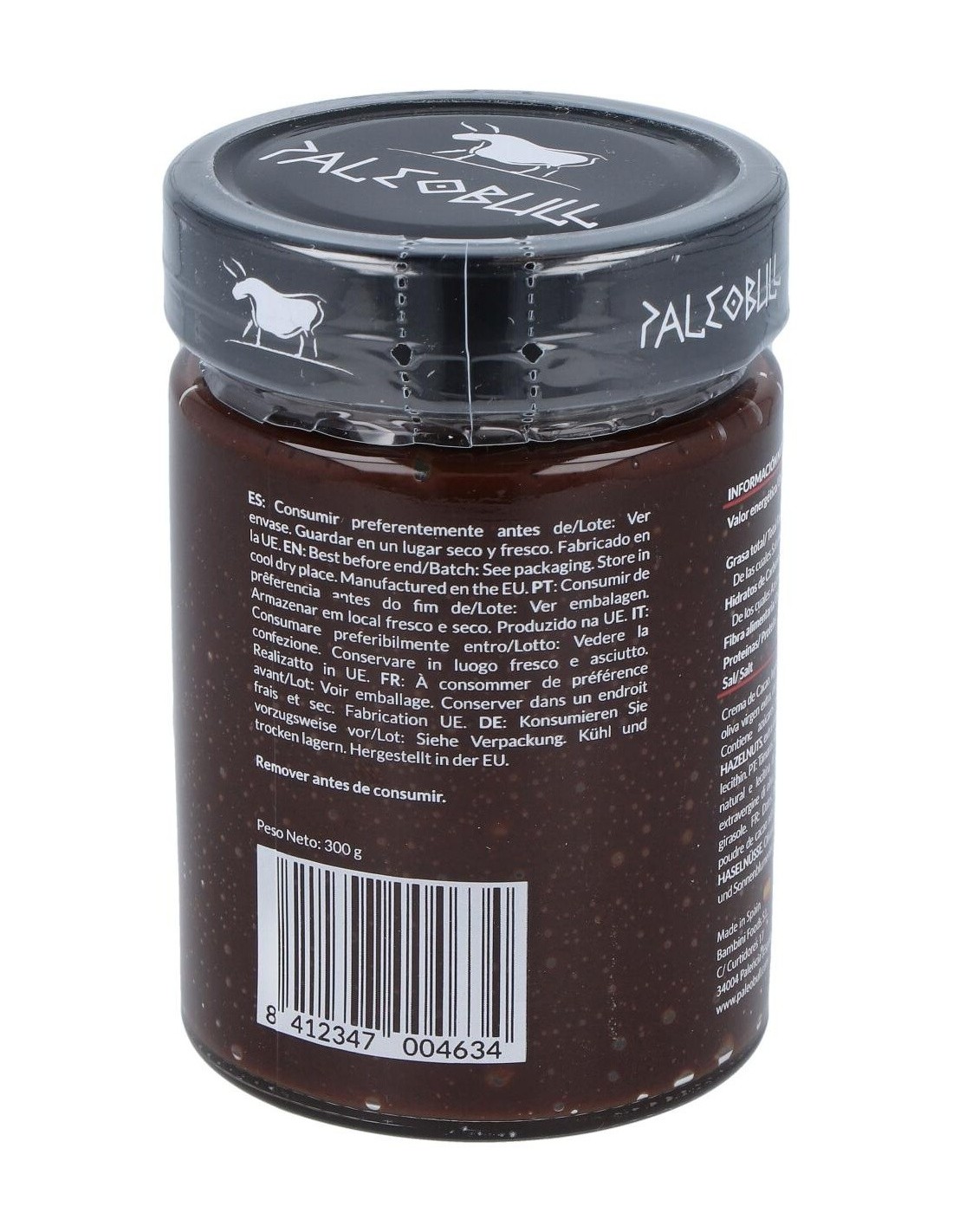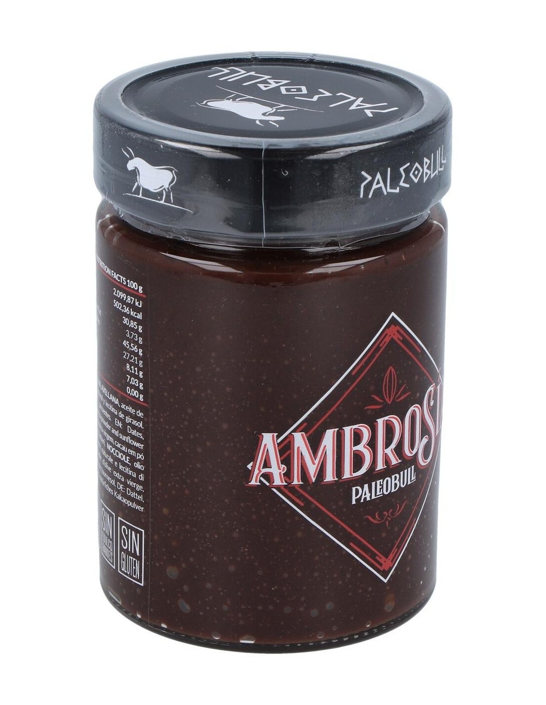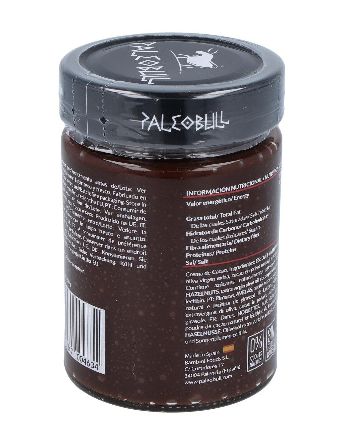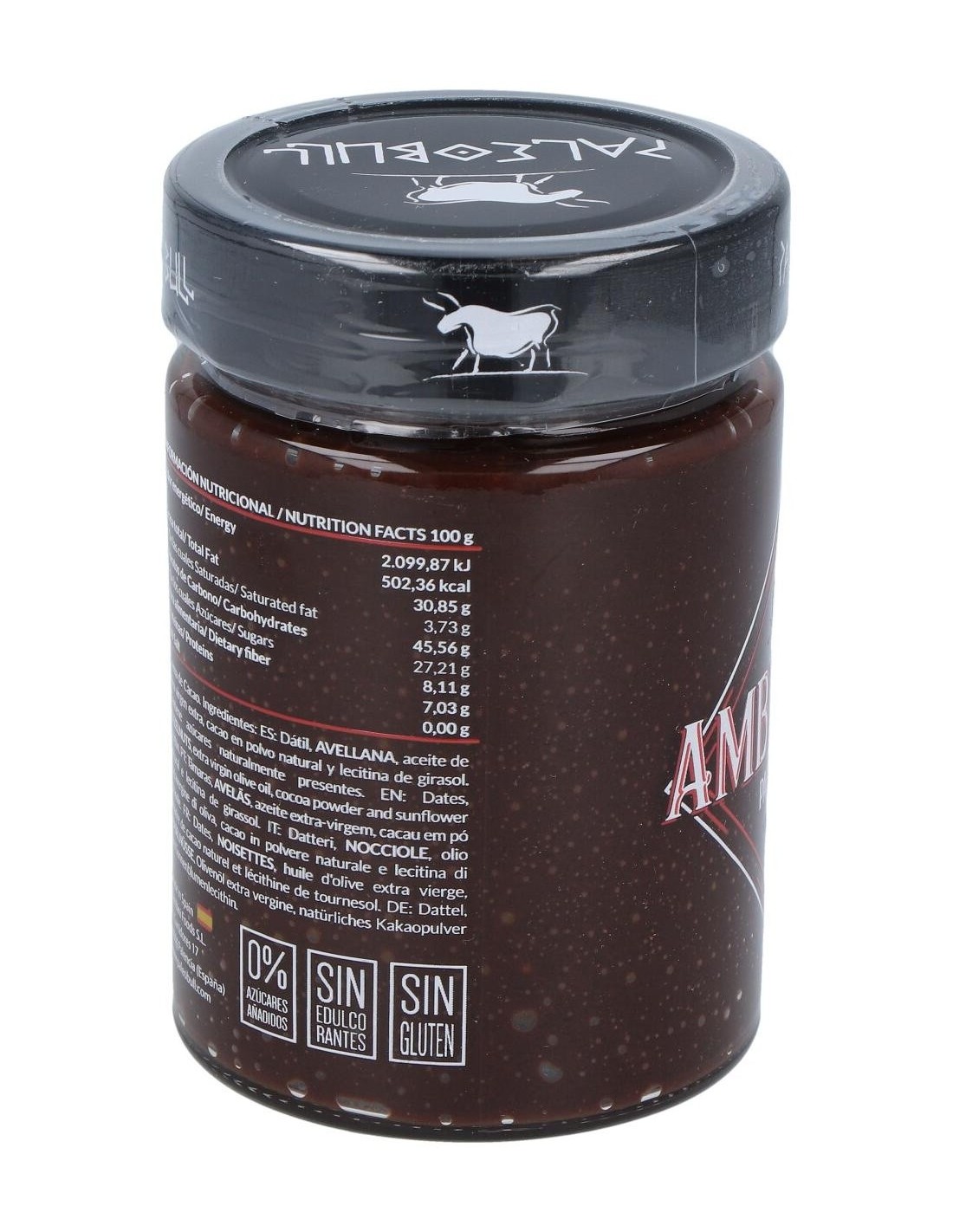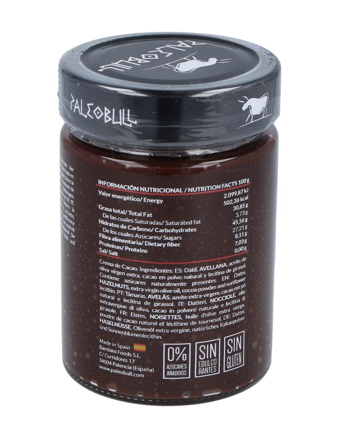 PALEOBULLIngredientes:Dátil, avellana, aceite de oliva virgen extra (AOVE), cacao en polvo natural y lecitina de girasol.Valor nutricional por 100 gramos: