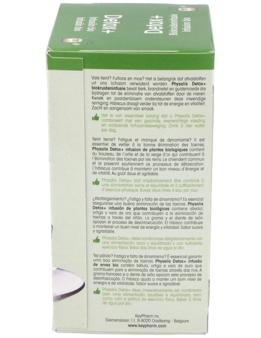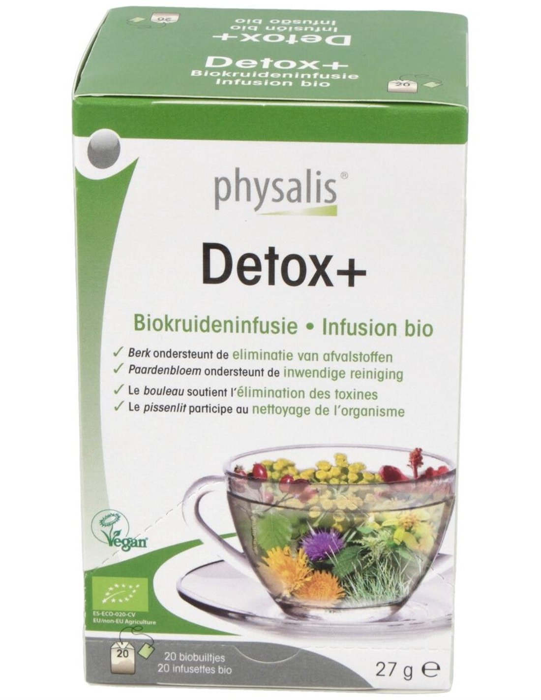 PHYSALISInfusión de plantas biológicas contiene abedul, ortiga y vara de oro que contribuyen a la eliminación de toxinas a través del riñón. La grama y el diente de león apoyan el proceso de desintoxicación.