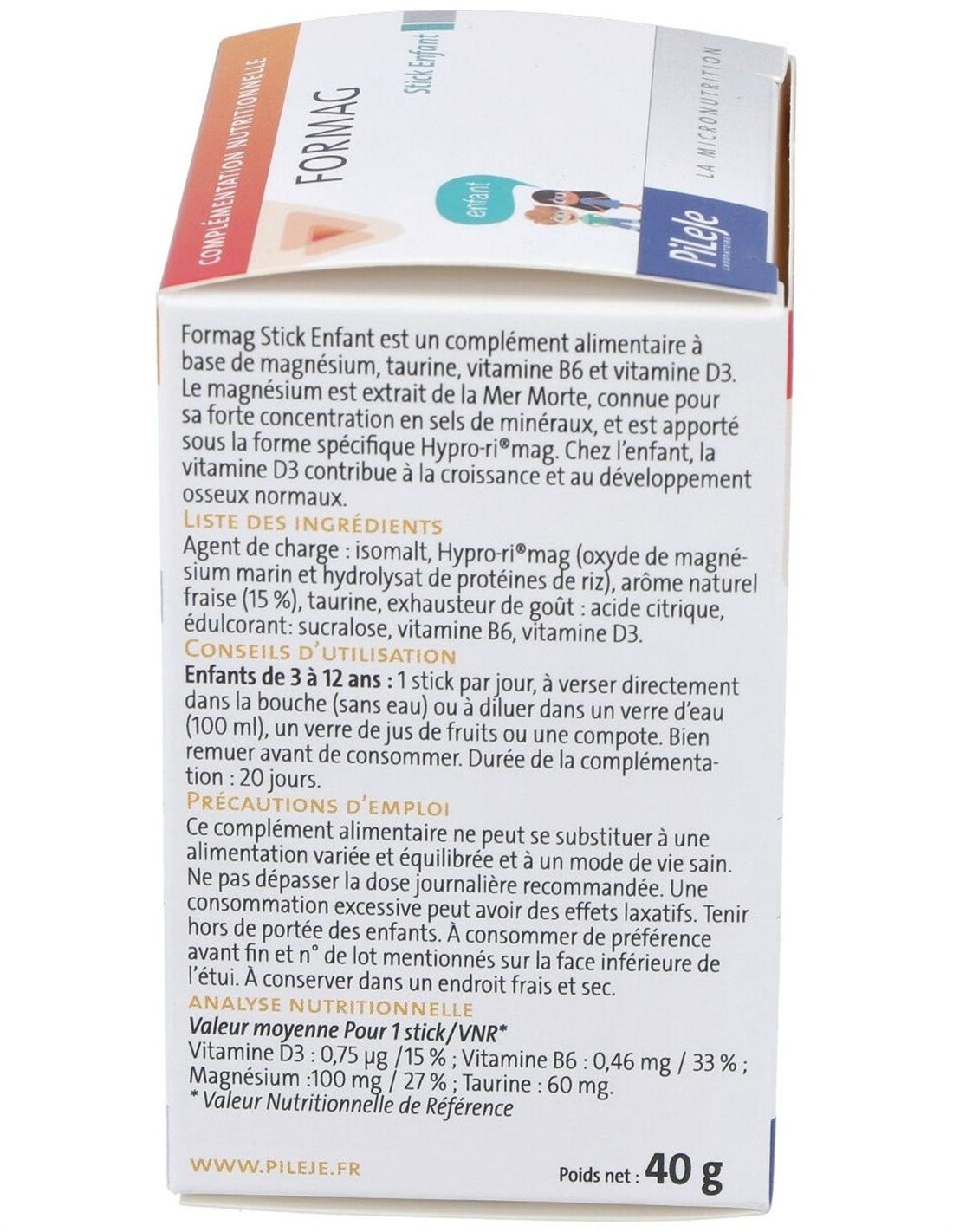 PILEJEComposiciónIngredientes: Agente de carga: inulina de achicorea, aroma natural (14.3%), hypro-ri®mag (óxido de magnesio marino y proteínas de arroz hidrolizadas), potenciadores del sabor: ácido cítrico y ácido málico, citrato de magnesio, taurina, edulcorante: glucósidos de esteviol extractos de estevia, vitamina B6, vitamina D3.