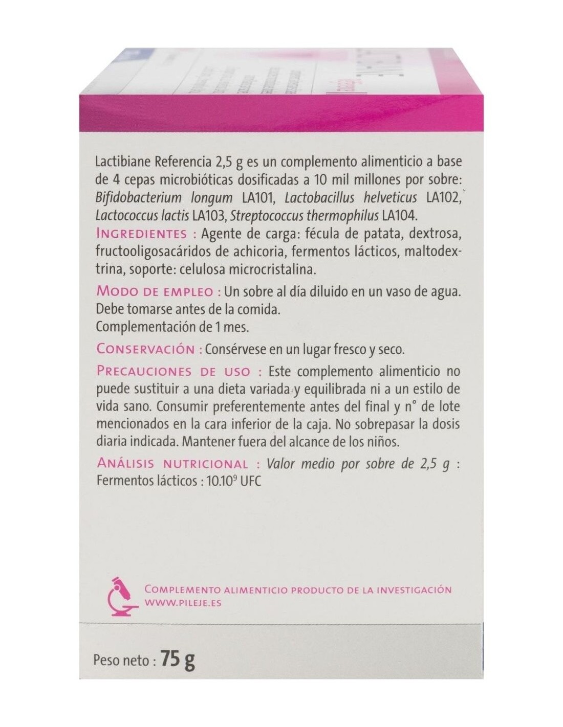 PILEJELactibiane Reference 30Sbrs. de Pileje es un complemento probiótico dirigido a personas que buscan apoyar su salud digestiva, formulado con cepas específicas para favorecer el equilibrio natural de la microbiota intestinal.