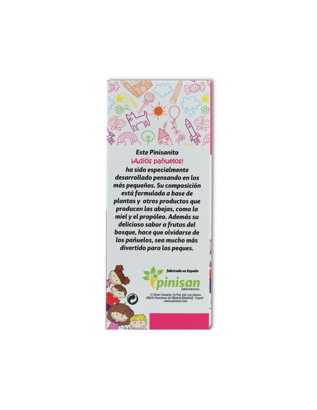 Adios Pañuelos de Pinisan ha sido especialmente formulado pensando en los más pequeños. Su composición contiene plantas y otros productos que producen las abejas, como la miel y el propóleo. Además de su delicioso sabor a frutas del bosque, hace olvidarse de los pañuelos, sea mucho más divertido para los peques.Composición activa por 15 ml: