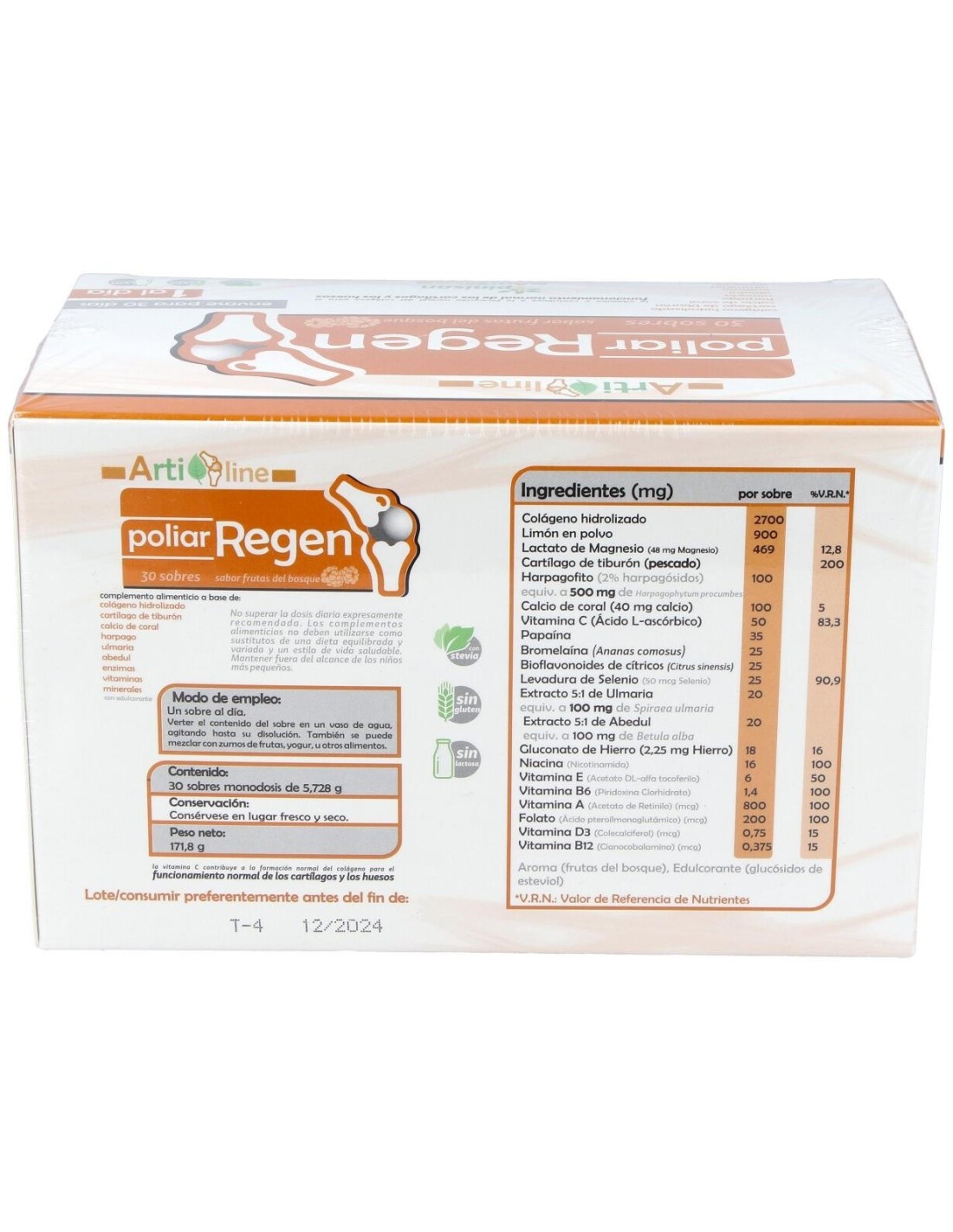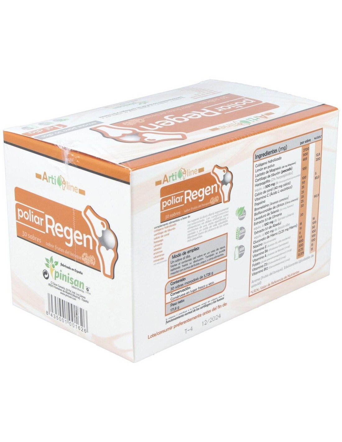 Las funciones más importantes de las articulaciones son de constituir puntos de unión entre los componentes del esqueleto (huesos, cartílagos y dientes) y facilitar movimientos mecánicos (en el caso de las articulaciones móviles), proporcionándole elasticidad y plasticidad al cuerpo. El dolor articular está entre los tipos más frecuentes de dolor. Las principales causas de dolor son traumatismo y artritis aguda y crónica. Generalmente, el dolor articular se asocia con perturbación de la función de la articulación, desde restricción en los movimientos hasta incapacidad. Las causas más frecuentes del dolor articular son la artritis, artrosis o el reuma, aunque también se produce por otros motivos y puede verse incrementado por factores externos al organismo. En muchos casos, no resulta posible eliminar por completo estos dolores y no hay una curación posible, pero lo que sí se puede hacer es llevar a cabo determinadas acciones que ayuden a reducir el dolor. Poliar Regen aporta una cuidada composición con ingredientes naturales que ayudaran al mantenimiento y regeneración de las articulaciones, aportando además una serie de antiinflamatorios naturales, libres de indeseables efectos secundarios, que ayudarán a superar las fases de dolor agudas en las enfermedades degenerativas de las articulaciones. Ingredientes por sobre: