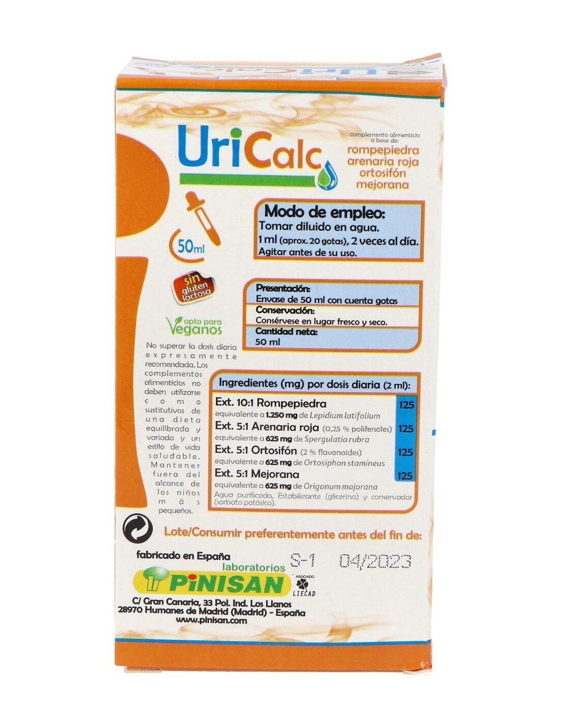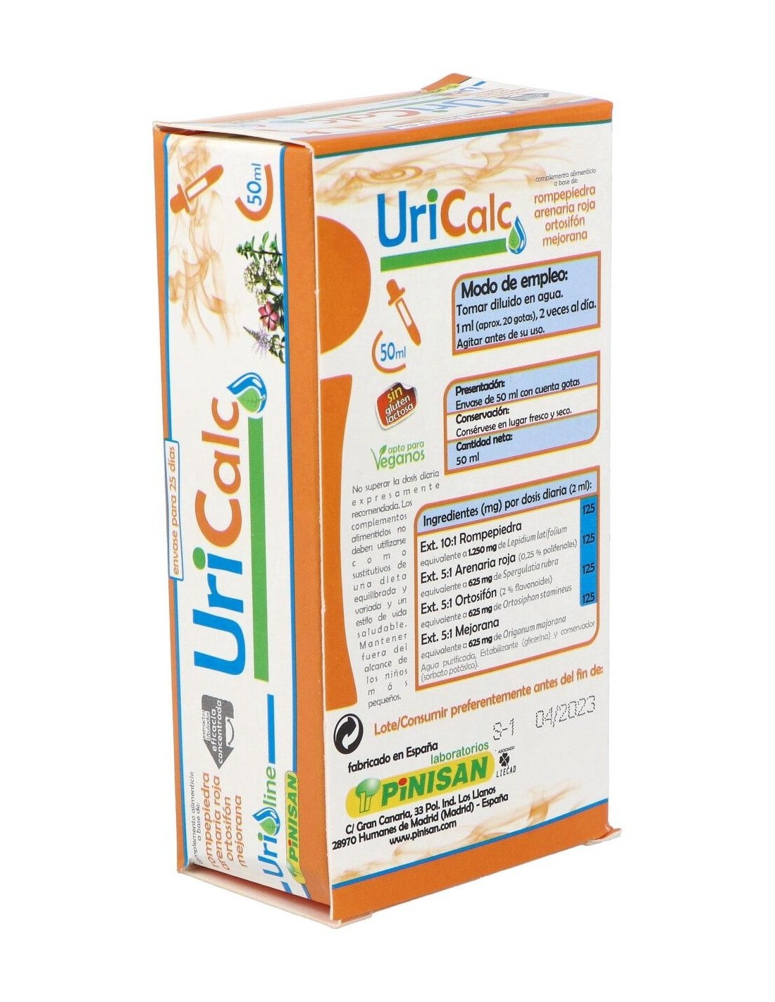 Propiedades de los principios activos:- Rompepiedras: Es una planta silvestre, que se usa desde hace cientos de años por diferentes civilizaciones para disolver los cálculos renales. Las principales ventajas de la rompepiedras es que elimina todo tipo de obstrucciones que pueden aparecer en el tracto urinario, ayudando a erradicar los cálculos o piedras. - Arenaria: Crece espontáneamente en los terrenos arenosos, silíceos y entre las rocas. Es una planta anual o bianual, sus tallos van de 5 a 25 cm de longitud, numerosos y ramosos, hojas estrechas y pequeñas. En sus principios activos se han descrito la presencia de una resina aromática, antocianósidos, flavonoides, saponósidos. Abundantes sales minerales: potásicas, cálcicas. Debido a su contenido en flavonoides y sales potásicas, presenta una acción diurética especialmente uricosúrica. - Ortosifón: También es conocido como té de Java y es originario de Asia tropical. Sus originales flores de color azul violáceo poseen unos estambres muy largos, por lo que también se le conoce como bigotes de gato. Presenta abundantes sales potásicas, flavonoides, polifenoles y aceites esenciales. Es un potente diurético, pues aumenta la eliminación renal de los líquidos, la urea y el ácido úrico. Además, su riqueza en flavonoides estimula la eliminación de la grasa acumulada en las células. Además de eliminar agua, algunos estudios indican que también ayuda a eliminar cloruro sódico y urea. Por este motivo, ha sido utilizado con éxito en el tratamiento de enfermedades reumáticas, para favorecer la eliminación de arenilla en los riñones, combatir las infecciones de orina, en el tratamiento de la gota (ya que ayuda a eliminar el ácido úrico) o para favorecer la eliminación de los cálculos renales y biliares debido a su acción drenante. - Mejorana: Es una planta perenne de porte arbustivo originaria de la India y de Oriente Medio, aunque ya en la Antigüedad se extendió por todo el Mediterráneo, incluyendo Egipto, Roma y Grecia. Crece hasta alcanzar una altura aproximada de 60cm, con tallos muy ramificados. Las hojas son opuestas, enteras, ovales y pecioladas, y son tomentosas, es decir, que están recubiertas por una fina vellosidad de color blanquecino. Se emplea desde la antigüedad como remedio digestivo. Además de ayudas a las digestiones estomacales, contiene una sustancia hepatoprotectora, el ácido ursólico, que además de su actividad antitumoral, la convierte en una planta adecuada para las enfermedad del hígado. Estudios científicos han averiguado que su uso tradicional a nivel culinario realmente era por tener propiedades bactericidas. En concreto, la mejorana posee aceites esenciales capaces de combatir la E. coli. Además la hidroquinona, sustancia abundante en la mejorana, el orégano, los arándanos y el anís; ejerce una acción antiséptica sobre las vías urinarias, que puede ayudar a combatir infecciones de orina y cistitis. Se han demostrado las propiedades contra Candida albicans, por lo que también se podría emplear en casos de candidiasis. Ingredientes activos dosis diaria (2 ml):