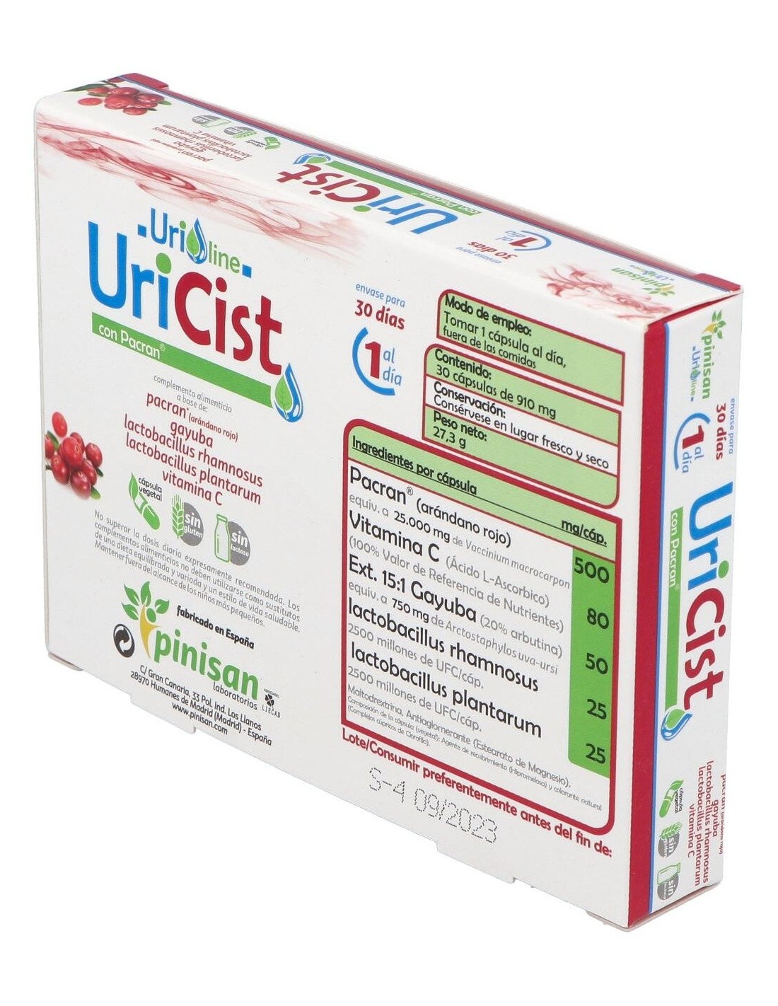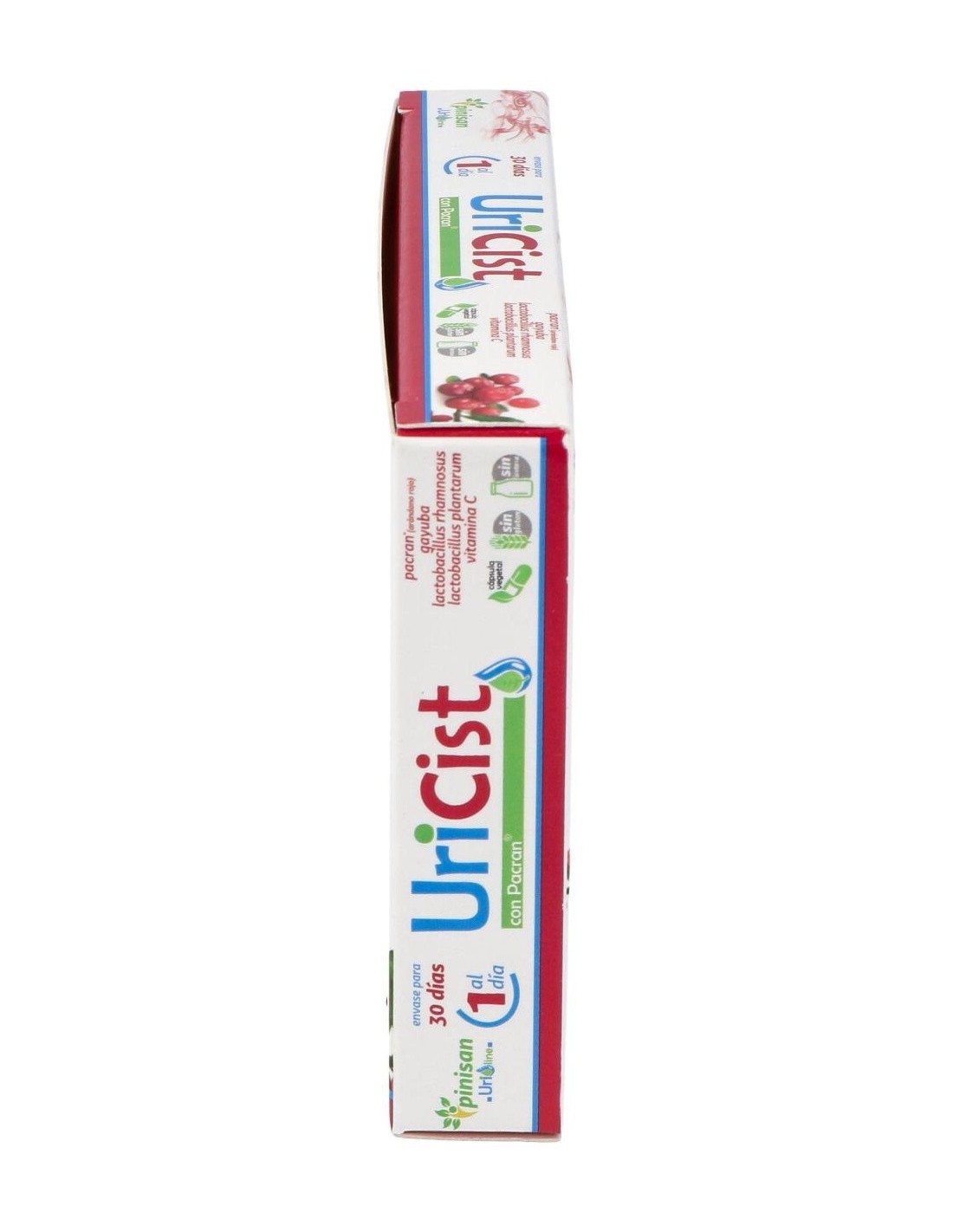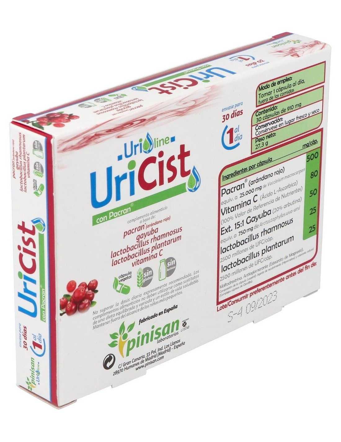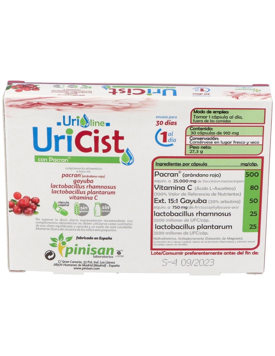 Propiedades de los principios activos:- Pacran®: Es un extracto que se obtiene del fruto entero del arándano rojo americano (Vaccinium macrocarpon L.) y ofrece el espectro completo del arándano con un nivel estandarizado de proantocianidinas como bioactivos, así como otros componentes clave del arándano, tales como los ácidos orgánicos, fenólicos, fibras, ácidos grasos, proteínas y azúcares. Mientras que muchos productos del mercado se enfocan sólo en la concentración de Pacs, Pacran® cuenta con estudios clínicos que demuestran el tratamiento profiláctico diario de las ITUs (Infecciones del Tracto Urinario). Un estudio comparativo de Pacran® y extracto de arándano rico en Pacs, Pacran® sigue demostrando un aumento de actividad aún después de 24 horas, mientras que la actividad de las Pacs en el Extracto de arándano disminuye tras apenas 10 horas (Howell, 2009).El arándano inhibe la adhesión de E. coli a las células del tracto urinario, previniendo la formación de películas biológicas y la infección subsecuente. La evidencia de investigaciones publicadas en 2011 y 2012 sugiere que las matrices de arándano entero tienen un mejor desempeño que las fracciones ricas en Pacs (Howell, 2012). - Gayuba: La gayuba es una planta rastrera muy extendida en los sotobosques y en las regiones montañosas de clima templado. En nuestro país abunda los bosques de coníferas y robledales de la zona rocosa pirenaica y del Sistema Ibérico. Su nombre "uva-ursi" (uva del oso) alude a la afición que tienen los osos por los frutos rojos de este arbusto. Las hojas de gayuba contienen abundantes taninos con acción astringente, y glucósidos flavonoides, que otorgan una leve acción diurética. Sin embargo, el principio activo que destaca es la arbutina, de la cual se ha demostrado su gran eficacia antiséptica y antiinflamatoria sobre el tracto urinario. Por efecto de la flora bacteriana del intestino, la arbutina se hidroliza, y libera desde el hígado hidroquinona, que por vía sanguínea llega al riñón y se elimina a través de la orina. Es la hidroquinona la sustancia eficaz para combatir las infecciones en las vías urinarias y convierte a la gayuba en un eficaz antiséptico urinario. Para que la hidroquinona ejerza su acción es necesario que la orina tenga reacción alcalina, pues el principio activo se inactiva cuando el pH es ácido. Conviene, por tanto, que durante el tratamiento con gayuba se siga una dieta rica en frutas y verduras, que alcalinizan la orina y permitir así que actúe más eficazmente la gayuba.Por sus propiedades antisépticas y antiinflamatorias, está indicada para tratar infecciones en el tracto urinario, como cistitis, uretritis, prostatitis en el varón y vaginitis en la mujer.- Lactobacillus rhamnosus: Los efectos clínicos sobre de salud a nivel de tracto urogenital del Lactobacillus rhamnosus han sido ampliamente estudiados, demostrando que pueden proteger el trato urogenital ya que inhiben la adhesión de patógenos vaginales y urinarios.- Lactobacillus plantarum: Resiste niveles bajos de pH y es capaz de sobrevivir a las concentraciones de bilis del intestino. El uso de probióticos regenera la flora vaginal impidiendo el desarrollo de bacterias nocivas y tienen gran capacidad de producción de ác. láctico y peróxido de hidrogeno que son tóxicos para los patógenos y de esta forma previenen la aparición de infecciones urogenitales.- Vitamina C: es una vitamina soluble en agua que se encuentra en frutas y verduras. La vitamina C tiene propiedades antioxidantes y estimulante del sistema inmunológico, por lo tanto puede ayudar al organismo a combatir infecciones, incluyendo infecciones de la vejiga, ya que dificulta la colonización de bacterias patógenas en esta. Es una vitamina que no podemos producir en nuestro organismo y es necesaria aportarla a través de la alimentación y/o suplementación. Ingredientes activos por cápsulas: